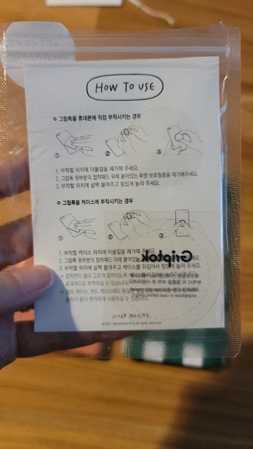 - 그립톡 부착 방법은 종이에 친절히 쓰여있다. 전혀 어렵지 않다. 다만, 처음 붙이실 때 위치를 잘 선정해야 한다. 내 손으로 그립톡을 잡는다고 가정했을 때, 불편하지 않은 위치!