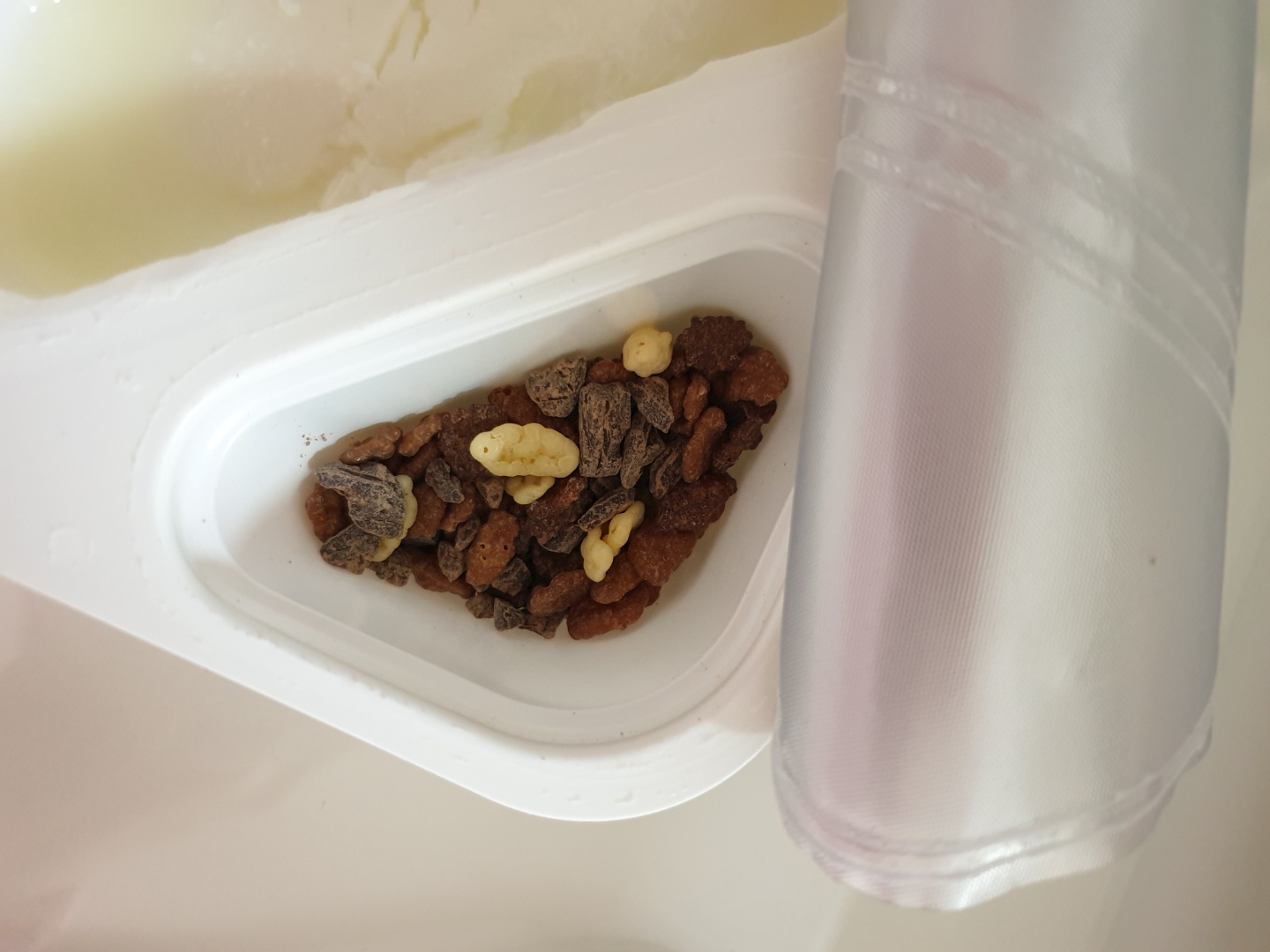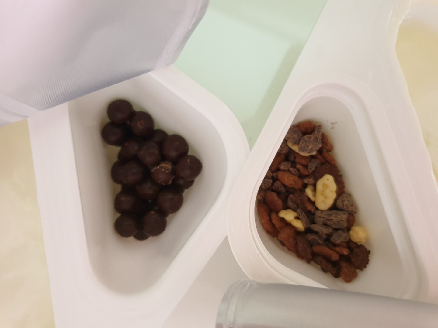 - 아래 사진에서 보이듯, 초코팝은 요거트에 섞으면 잘 보이지 않았다😅 토핑량이 더 많으면 좋았겠지만 g 차이가 없는 걸 보면 토핑 한 개의 크기 자체가 커서 그런 것 같기도 하다. 뭔가 토핑이 풍족한 느낌을 원하신다면 초코팝은 비추천한다.