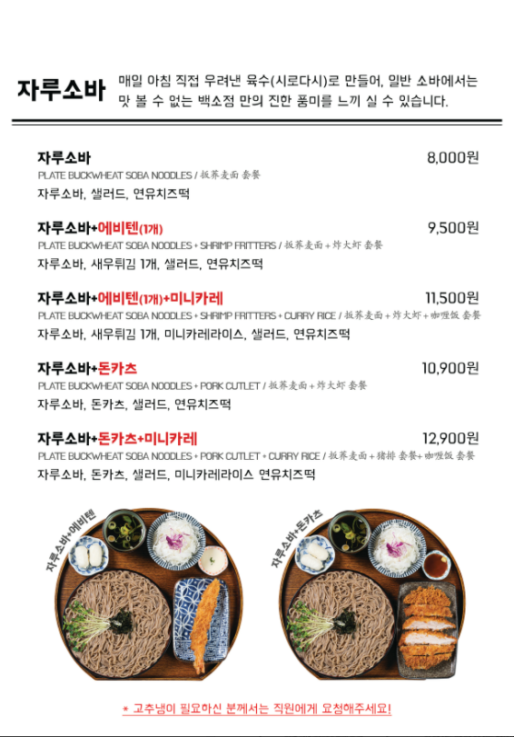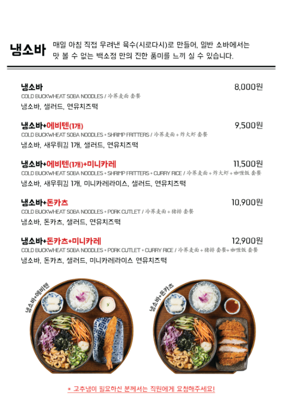 - 아래 네이버 지도 메뉴를 보고 전화를 했는데, 내가 먹고 싶은 메뉴는 현재 다 안 되는 상태였다😭. 우동, 냉소바, 자루소바 다 안되고 면 중에는 "마제소바"만 가능하다고 들었다.