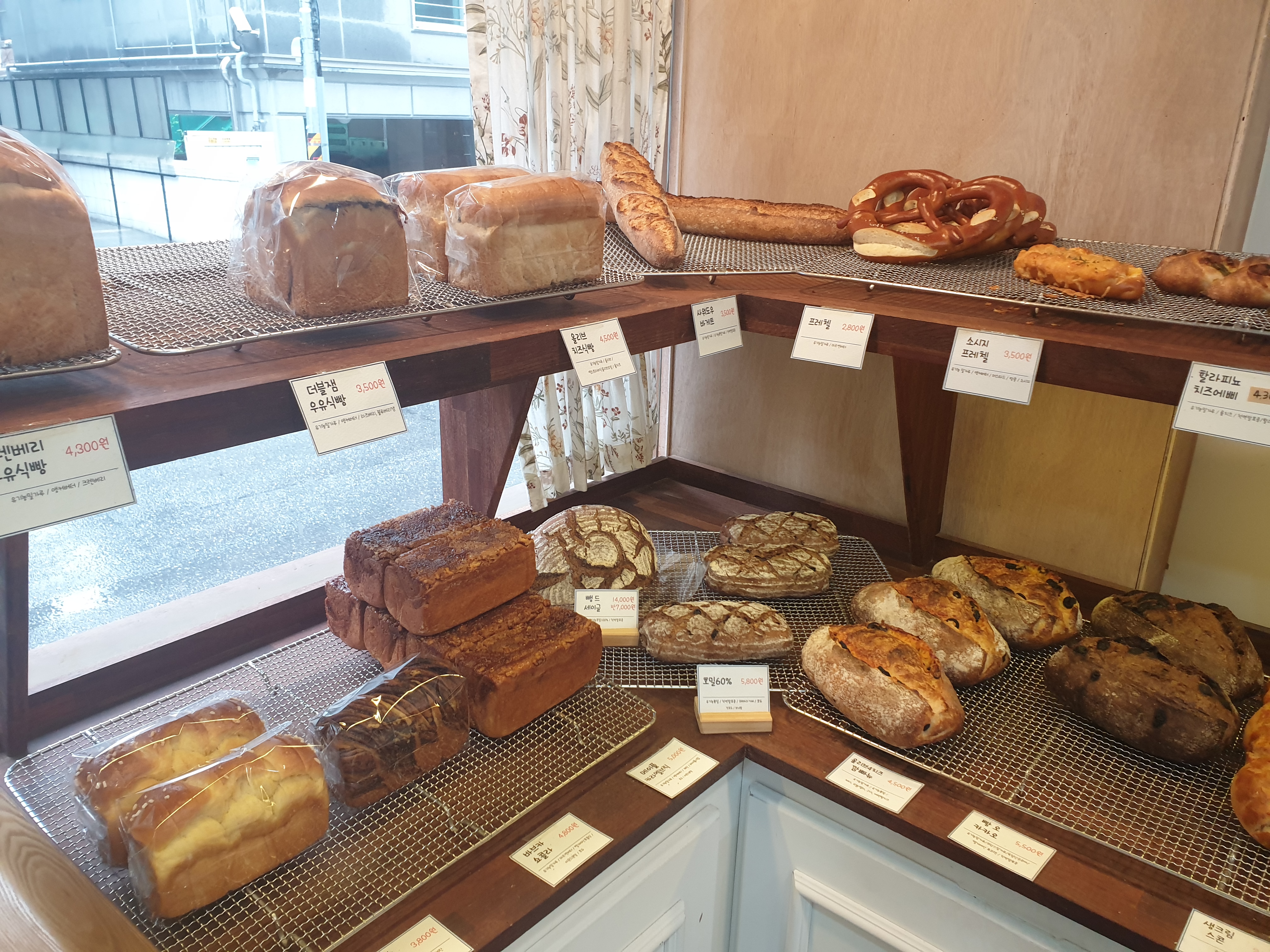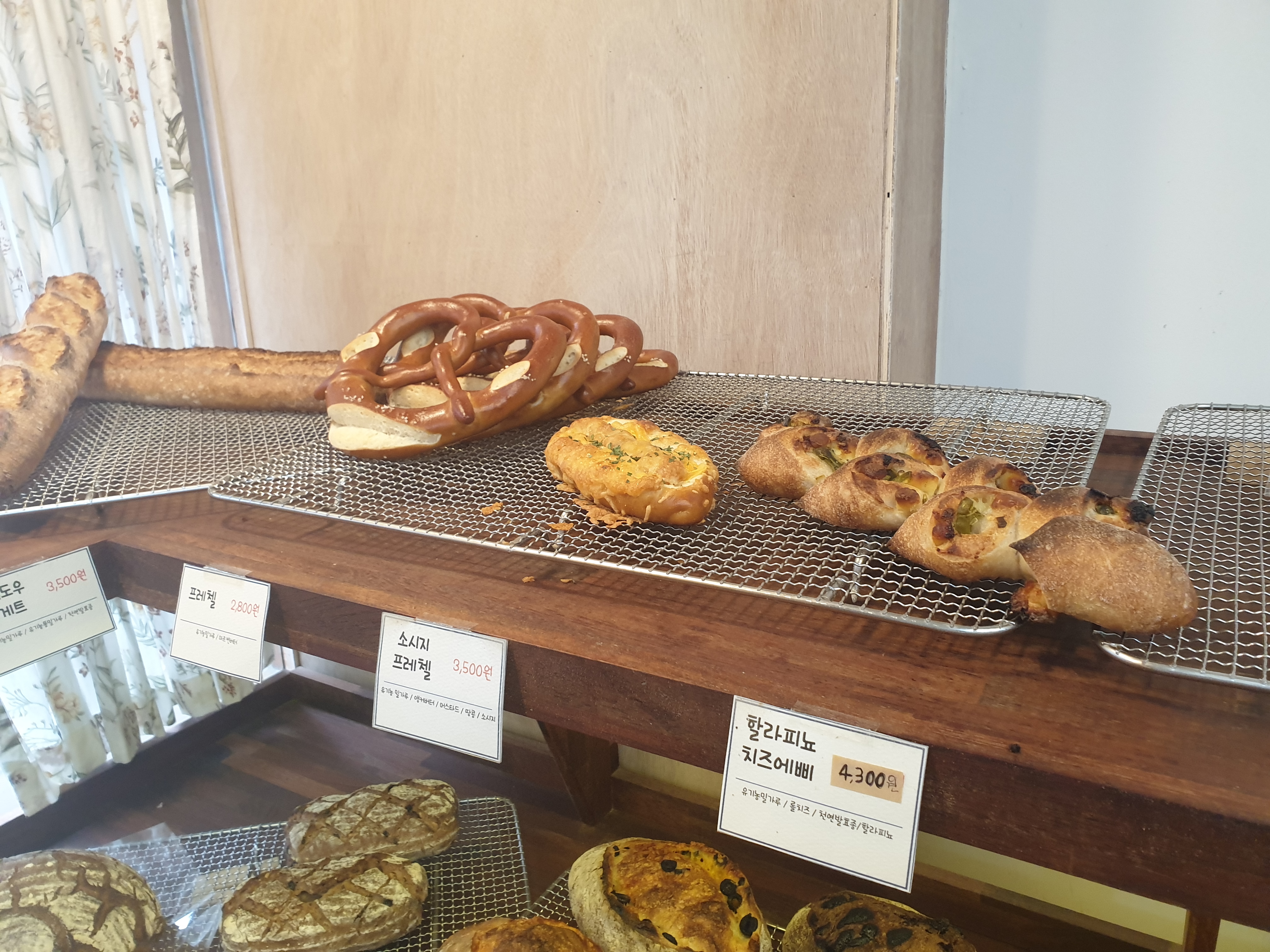 - 빵 종류 일부를 적어보자면, 프레첼(2,800원), 소시지 프레첼(3,500원), 할라피뇨 치즈에삐(4,300원), 앙버터(4,500원), 치아바타(2,500원), 올리브 치아바타(2,800원), 치즈 치아바타(3,300원), 크루아상(3,000원), 크렌베리 우유식빵(4,300원), 더블잼 우유식빵(3,500원), 올리브 치즈식빵(4,500원), 샤워도우 바게트(3,500원), 올리브4치즈 캄빠뉴(4,500원), 빵 오 카카오(5,500원) 등이 있다.
