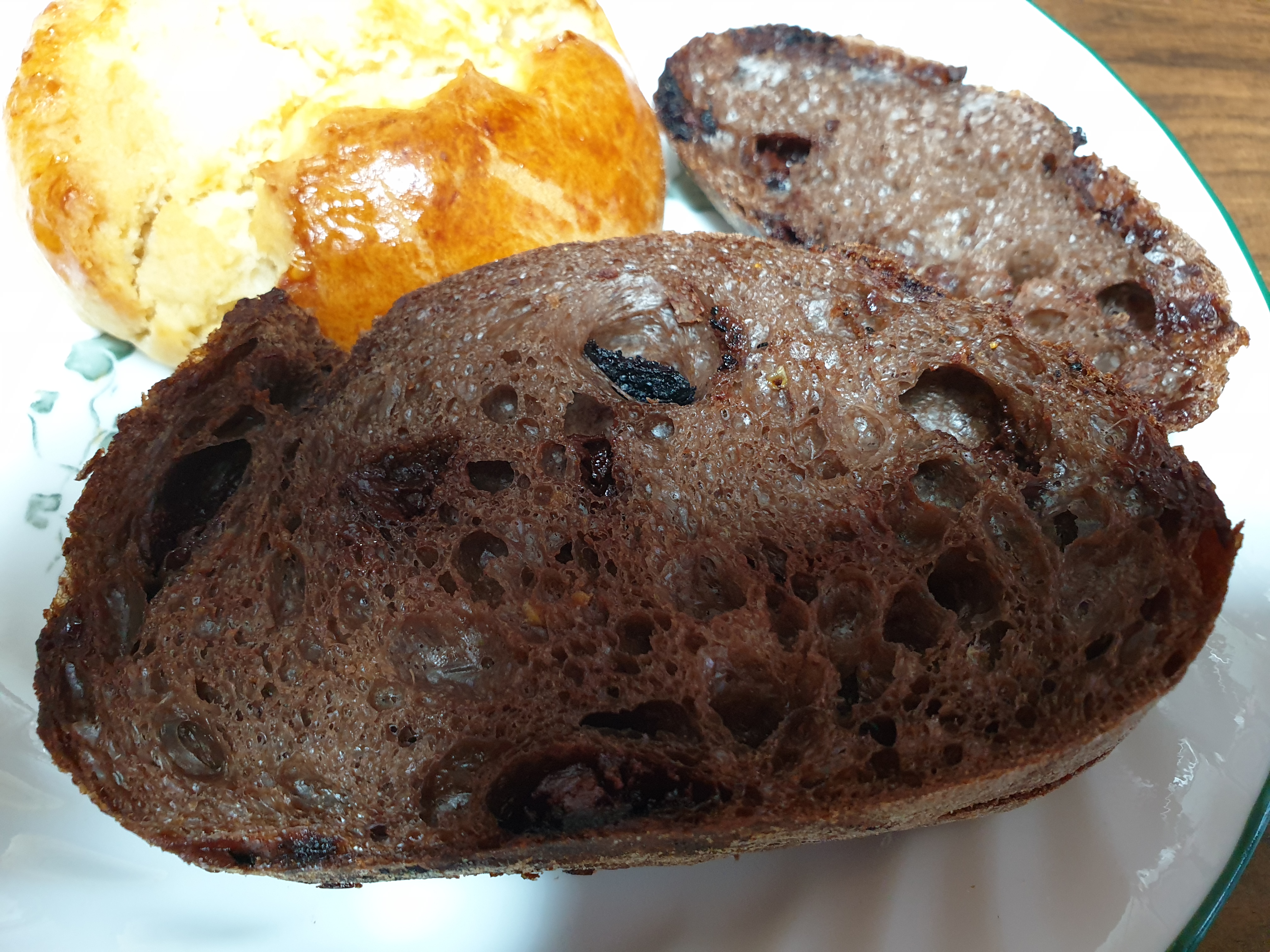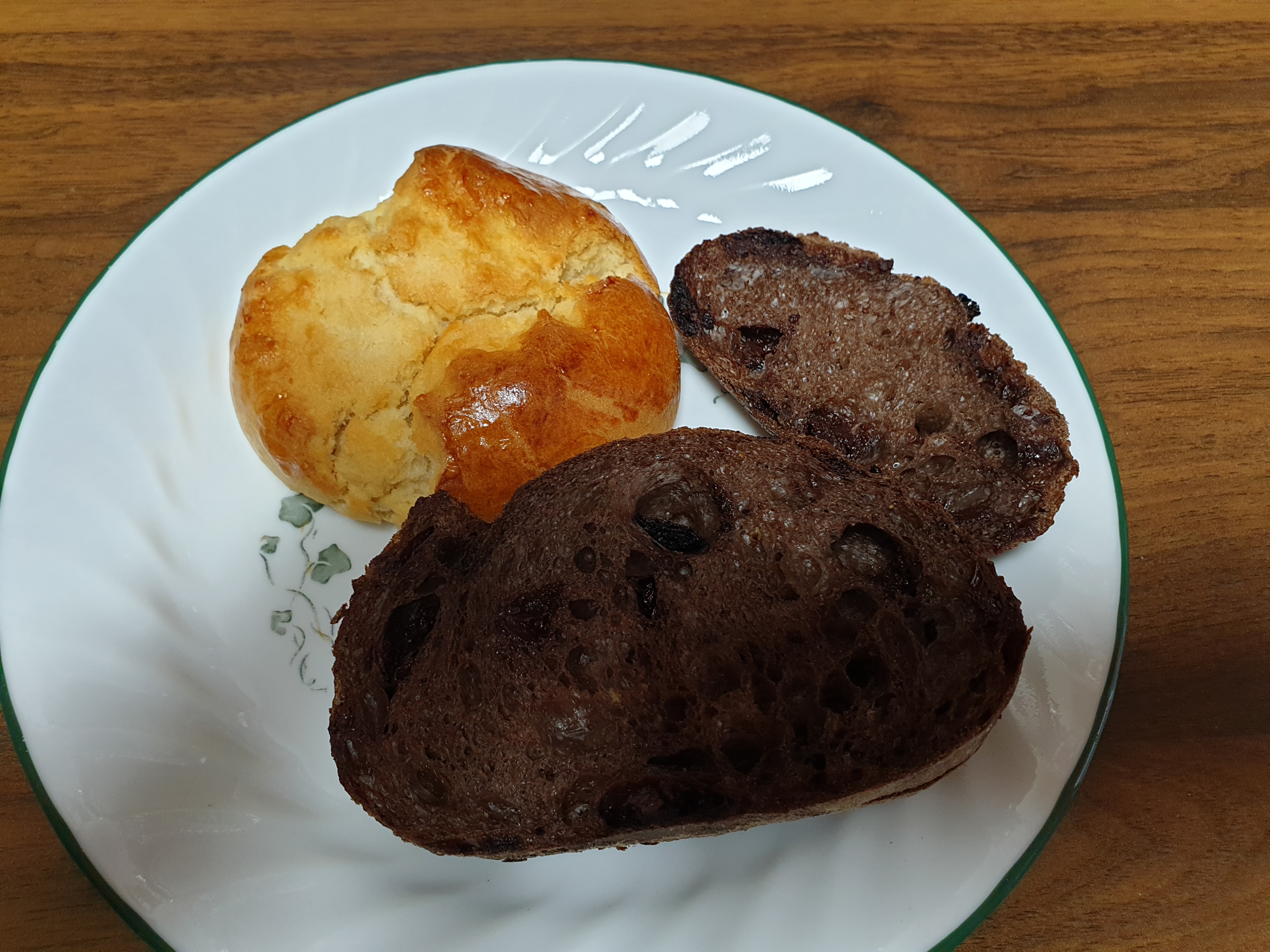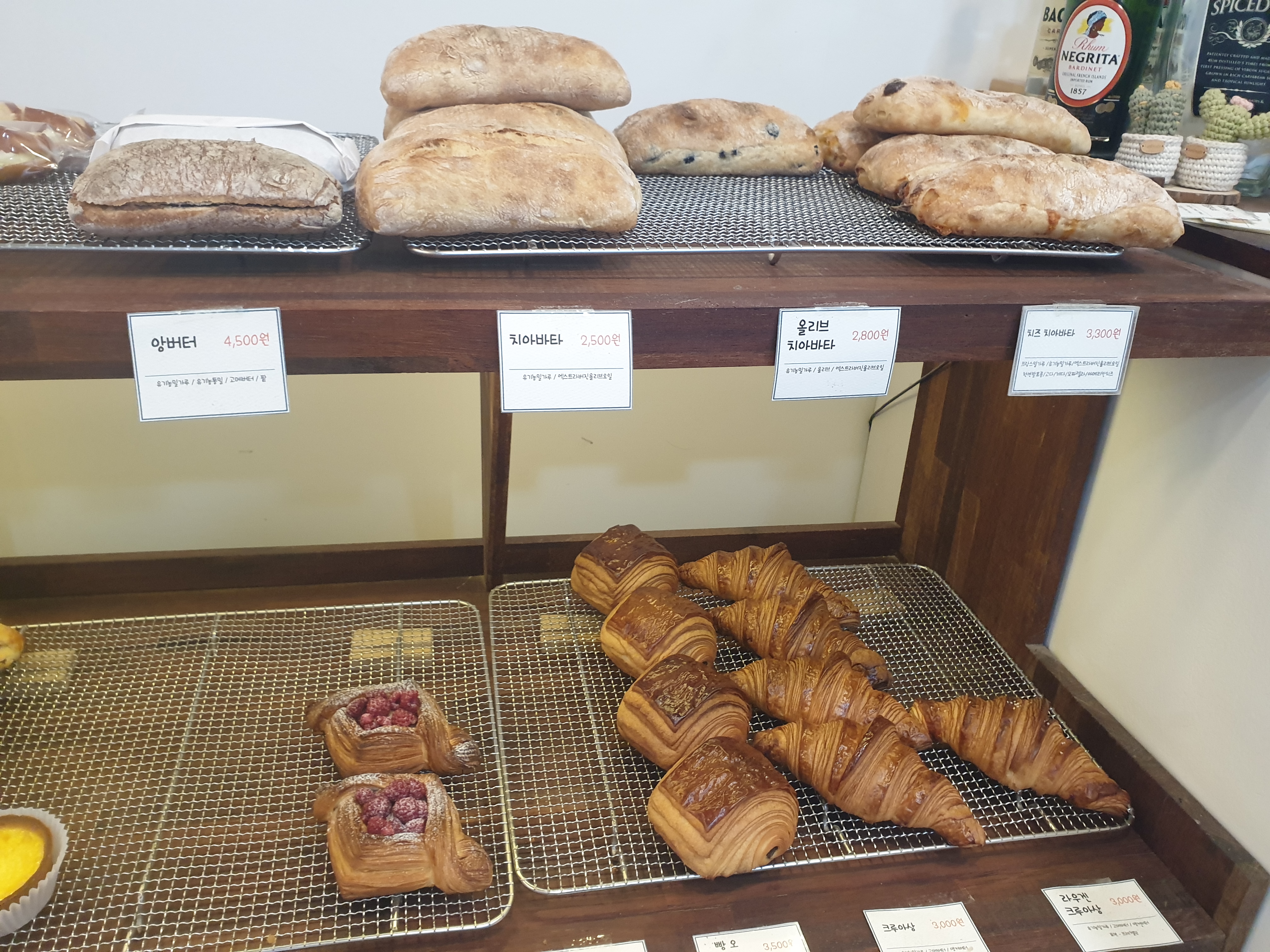- 앙버터가 굉장히 맛있다고 해서 고민을 했지만, 내 취향대로 생크림 스콘/올리브 치아바타/빵 오 카카오 (총 3가지) 빵을 샀다.