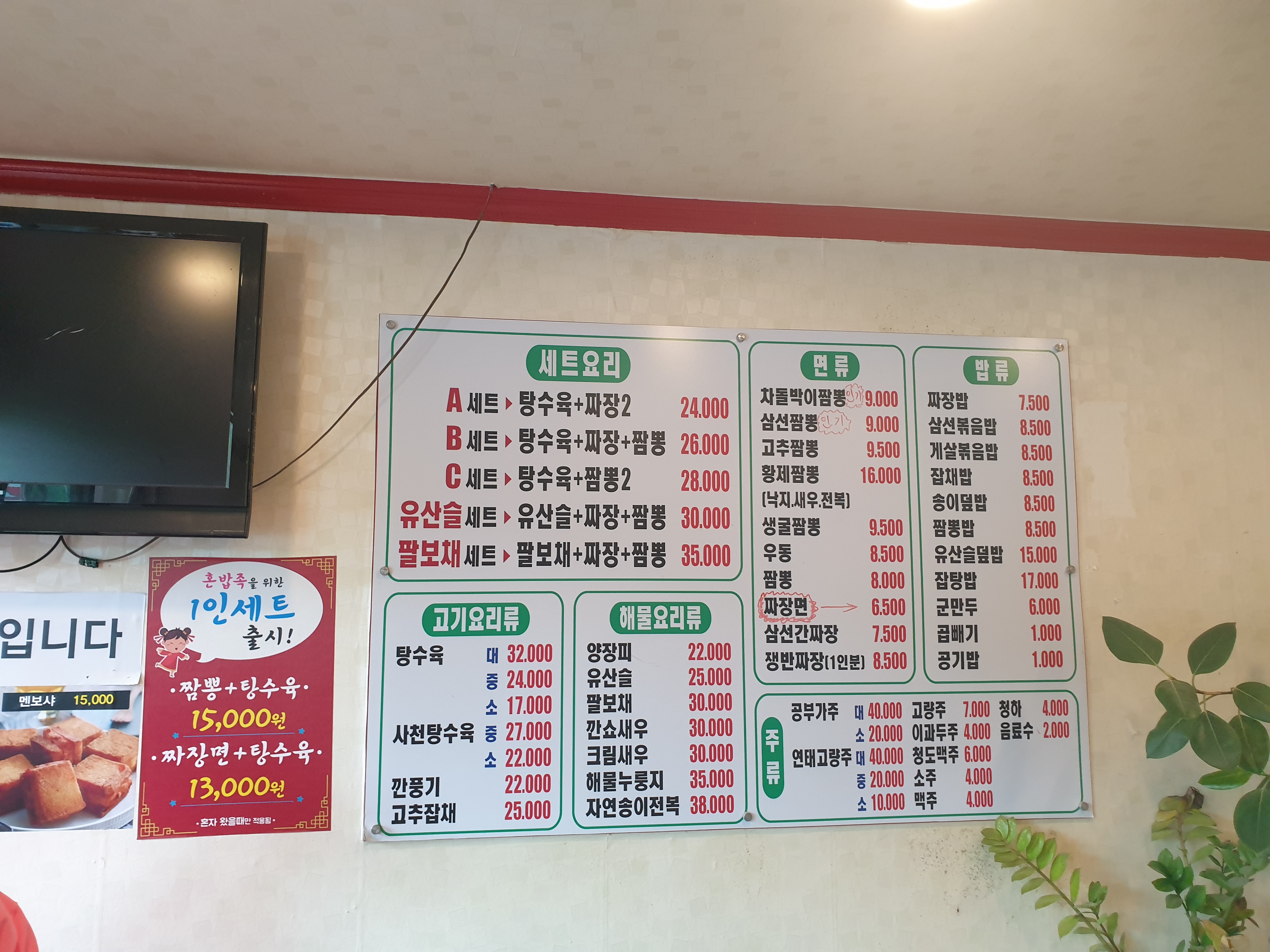 드디어 메뉴🍜! 나와 친구는 B세트를 시키되 짬뽕 하나를 삼선짬뽕으로 바꿨다. 추가금액이 있었지만, 각 메뉴를 시키는 것보다 저렴하고 양도 적당해서(그냥 탕수육 '소'자를 시키면 둘이 먹기엔 양이 많다) 추천한다😍.