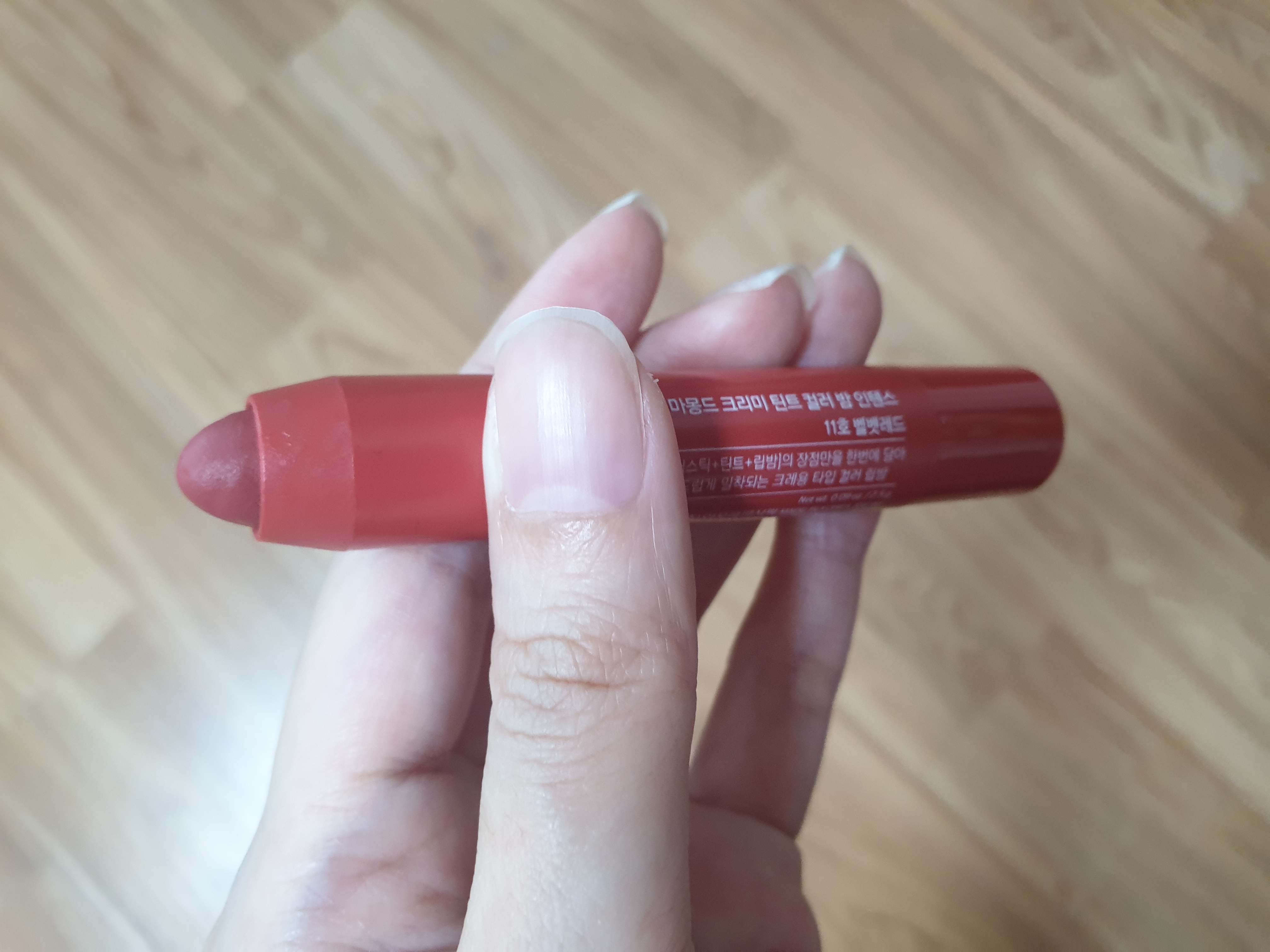 - 마몽드 제품은 컬러 밤이라 크레용처럼 생겼고, 벨벳레드라는 색상명에서도 느껴지듯 진한 장밋빛이다. 약간 가을 가을 한 느낌🧡