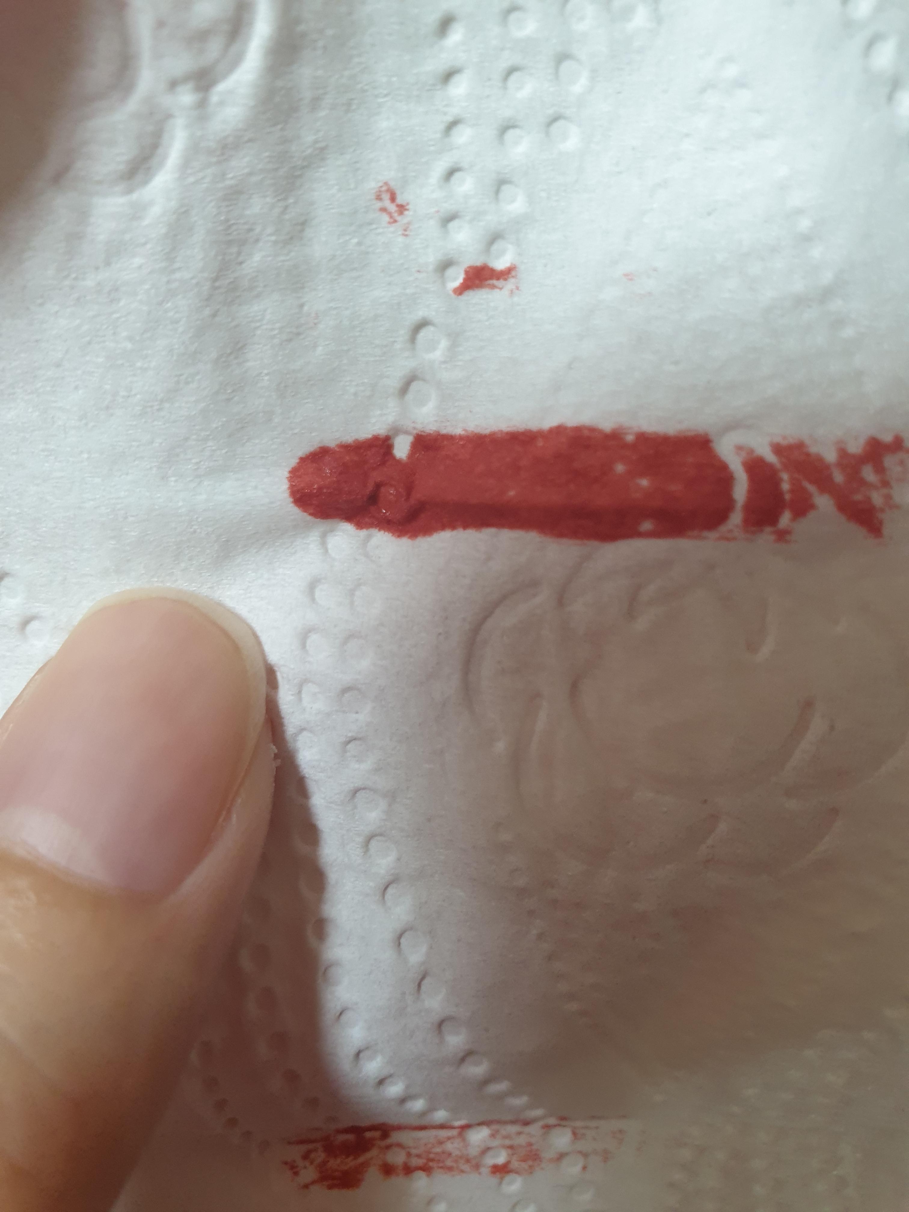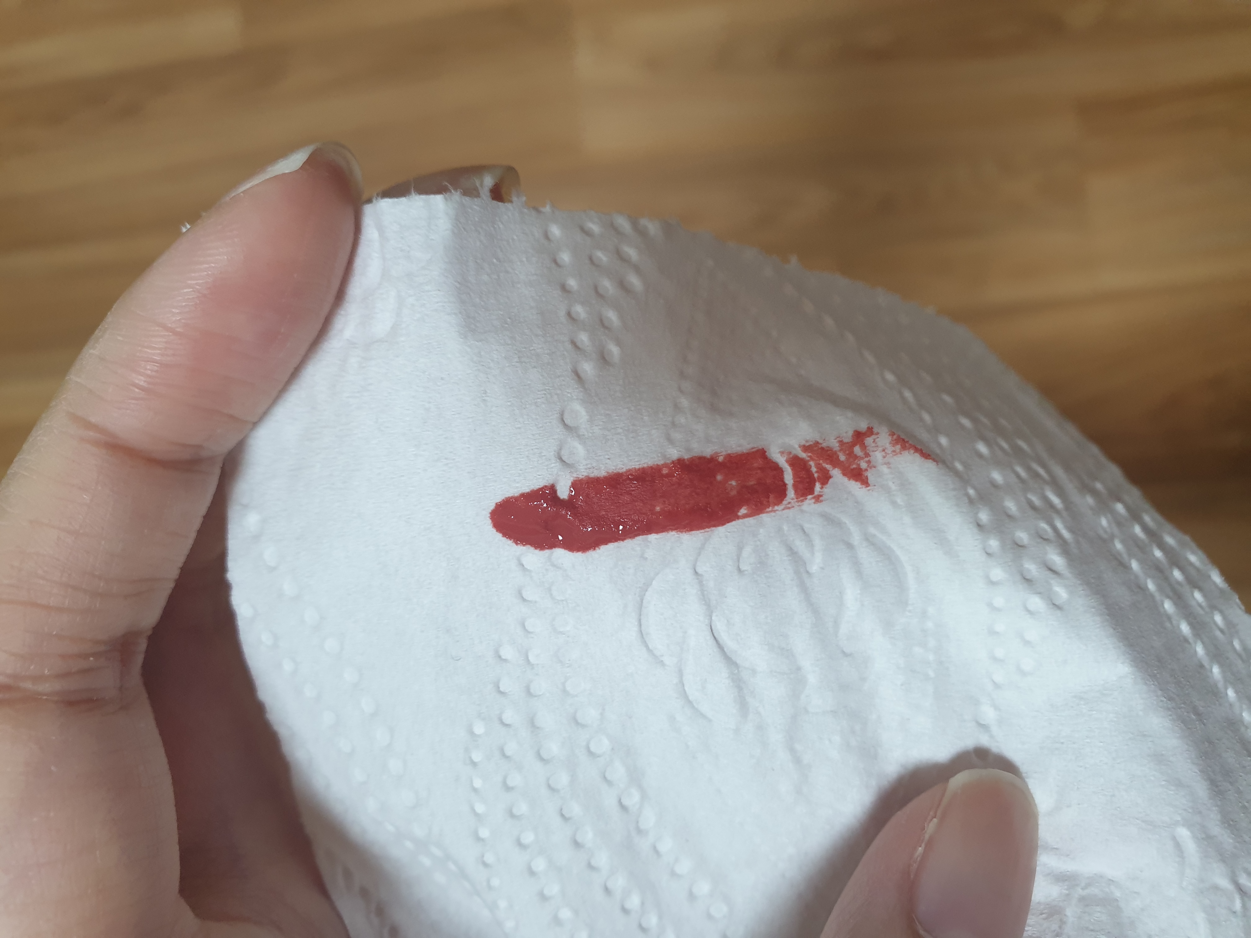- 일단 티슈에 발색을 해봤는데, 노란빛이 도는 진한 핑크였다. 이 제품 하나만 보면 발색을 정확하게 표현하기 어려울 것 같아서 내가 평소에 쓰고 있는 "마몽드 크리미 틴트 컬러 밤 인텐스 11호 벨벳레드"를 가져왔다.