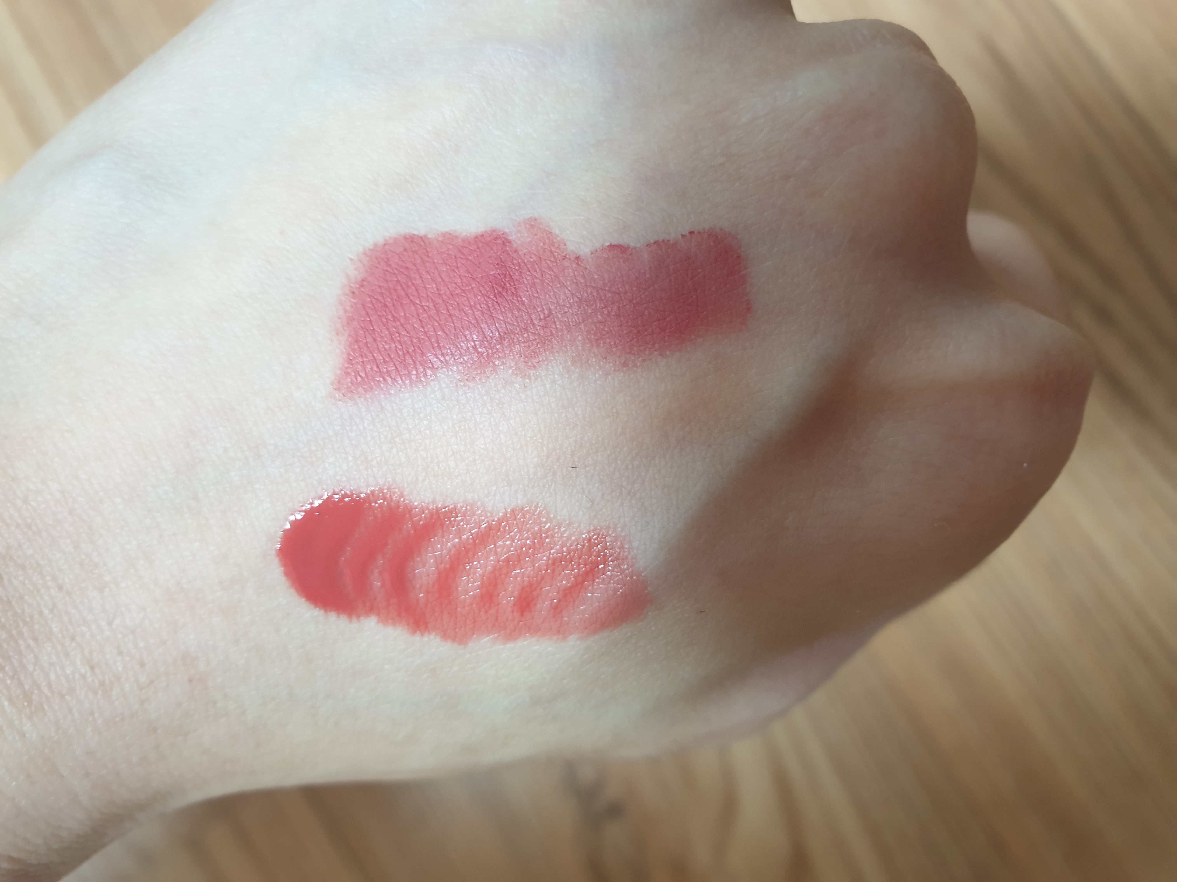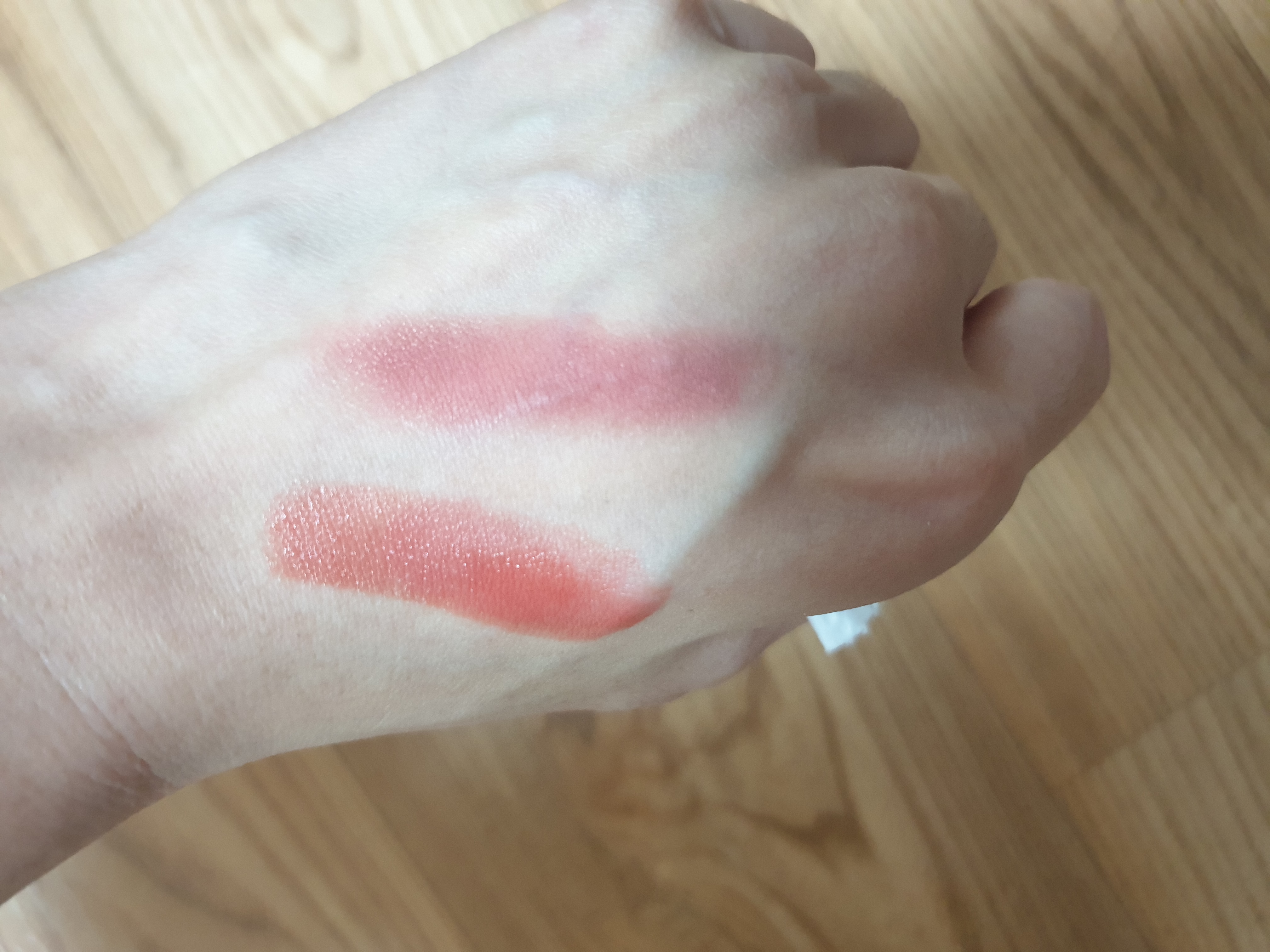 - 드디어 비교샷! 정확한 비교를 위해 티슈와 손등 모두에 발색해봤다. 모든 사진에 위가 마몽드, 아래가 웨이크메이크이다. 티슈에는 둘 다 엄청 진하고 탁하게 발색이 되었지만, 손등에 했더니 둘 다 예쁜 색으로 보였다. 특히나, 웨이크메이크 제품 발색이 너무 예뻤다. 정말 설명 그대로 노랑빛이 담긴 다홍 + 핑크색!
