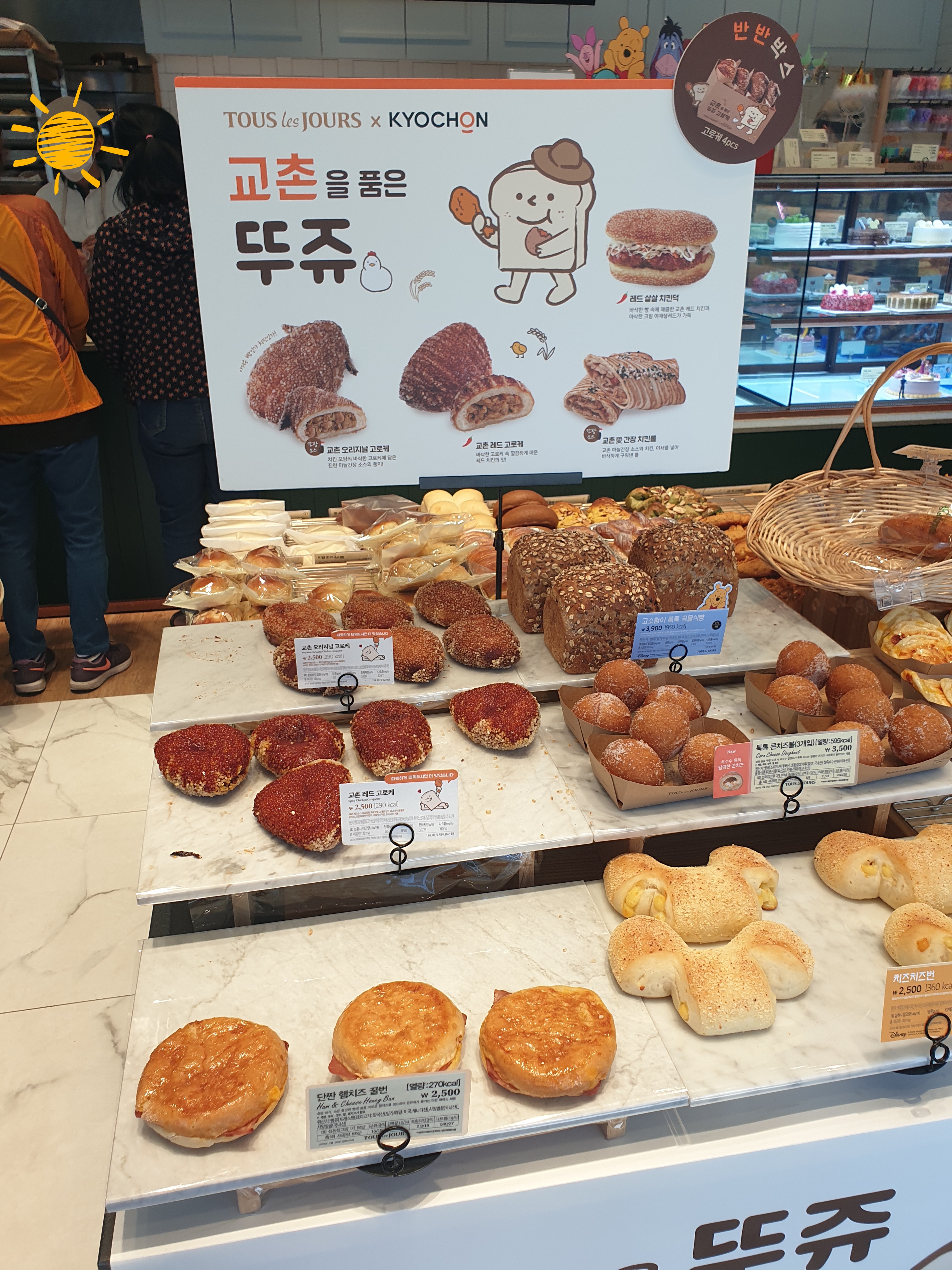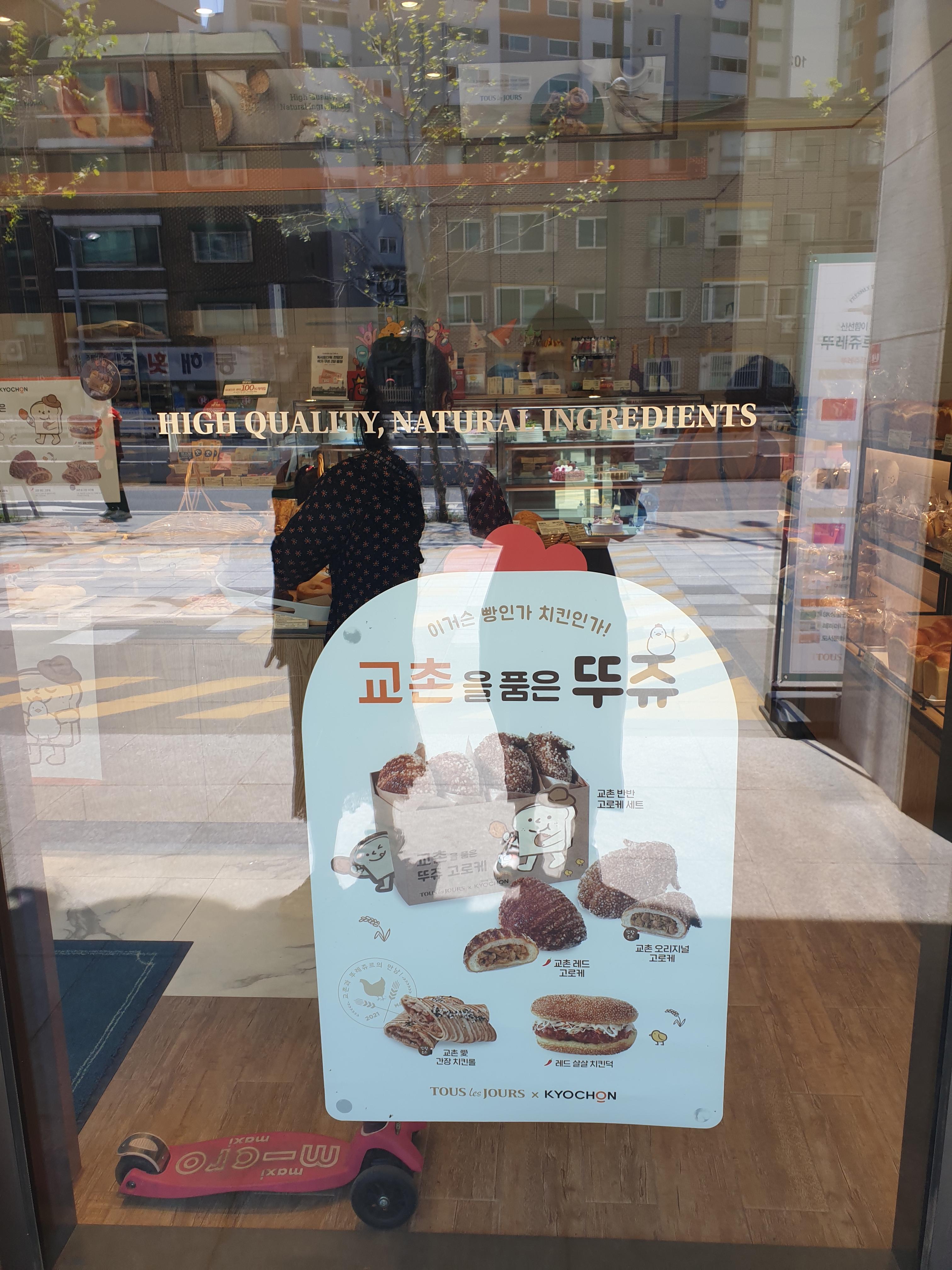 - "카페 해야" 옆에 위치해있다(저 카페도 추천한다😄). 교촌치킨과 콜라보한 빵이 아직도 메인인지 포스터가 부착되어있었다.