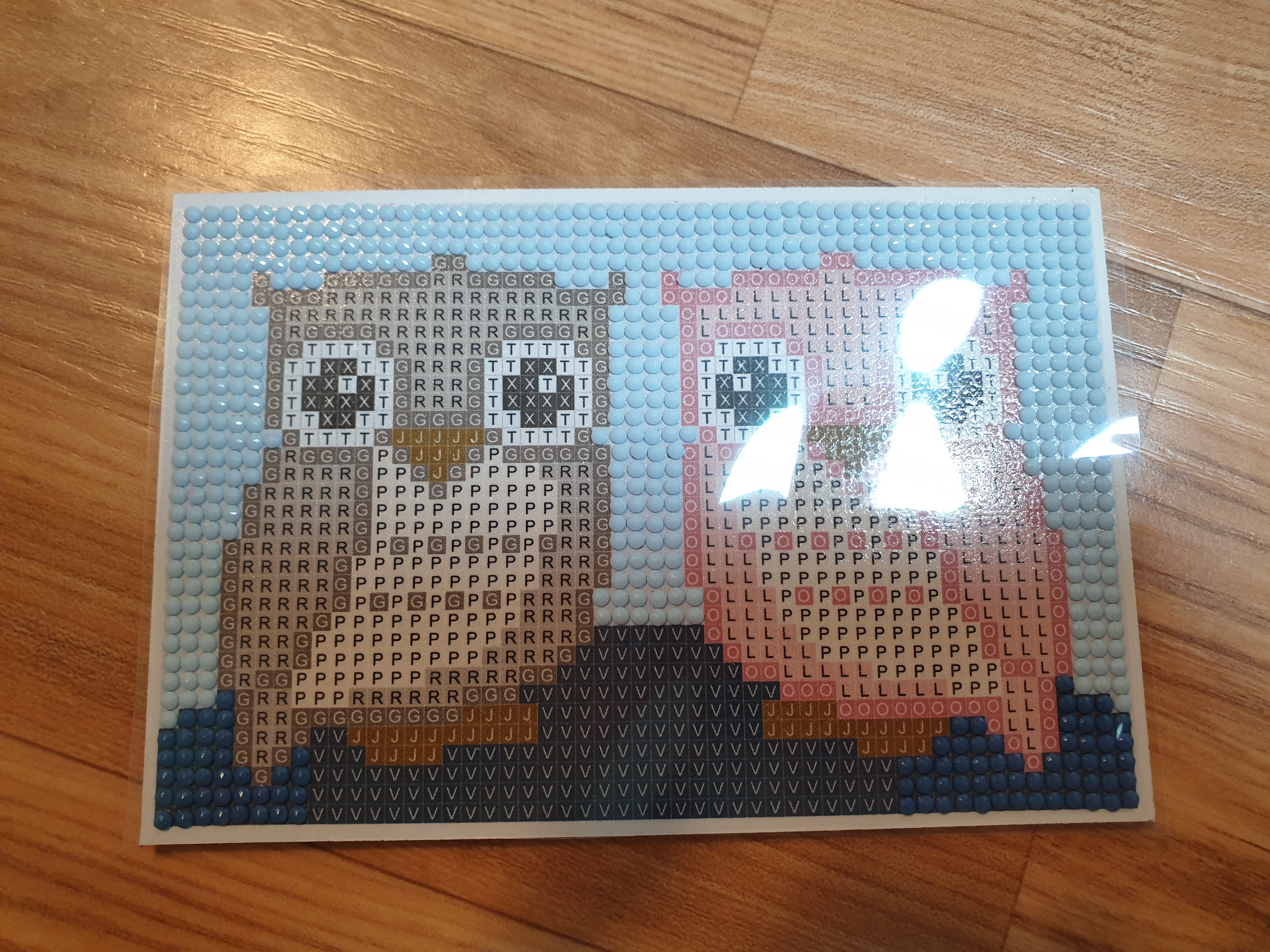 - 고체풀에 보호필름을 조금 열고 펜으로 푹 누르면 고체풀이 묻어난다. 그걸로 비즈를 아주 살짝! 찍어서 도안 정위치에 붙이면 된다.