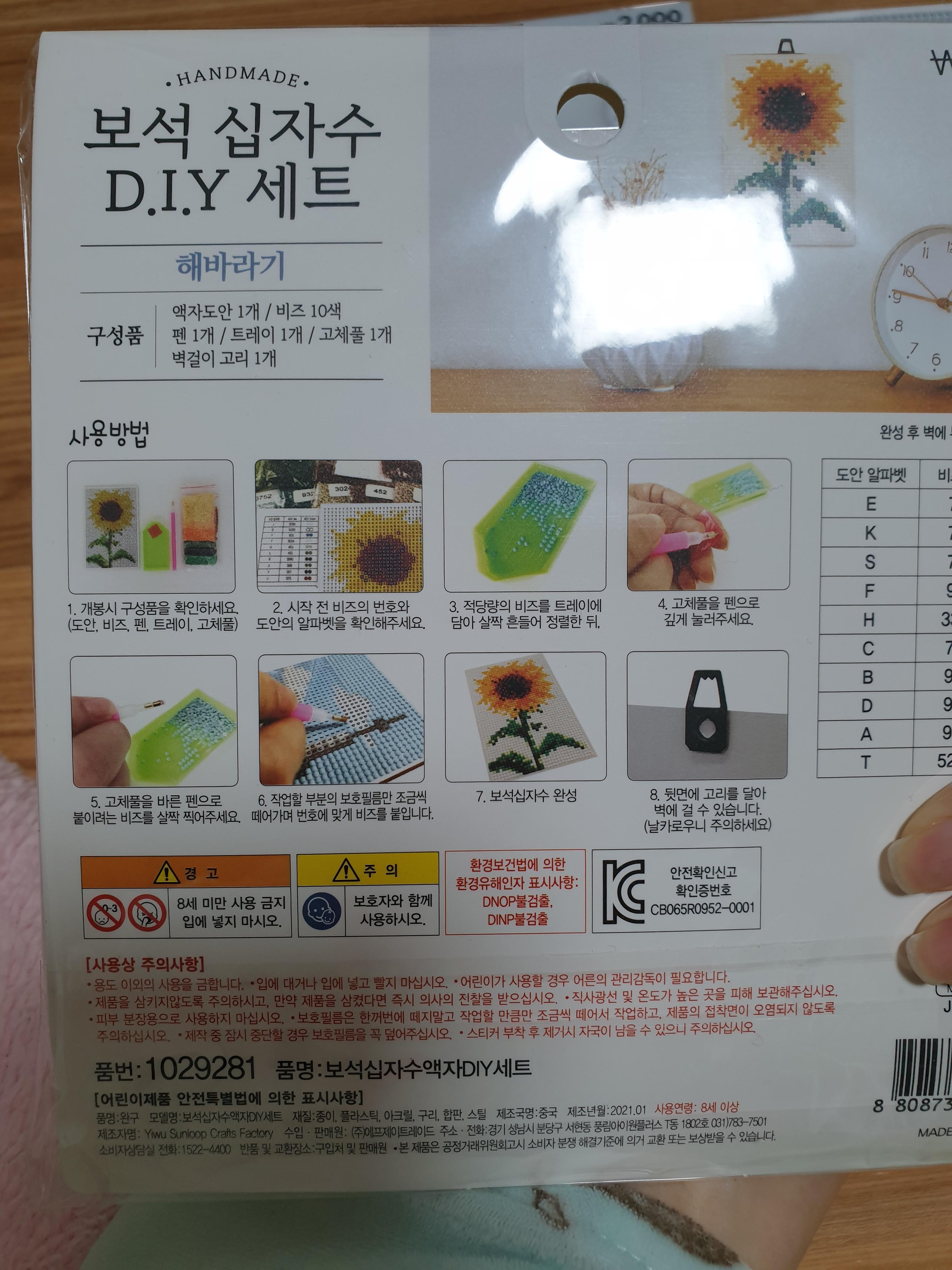 - 도안 1개, 펜 1개, 트레이 1개, 고체풀 1개, 벽걸이고리 1개, 비즈 구성이며 하는 방법도 자세하게 기재되어있다.