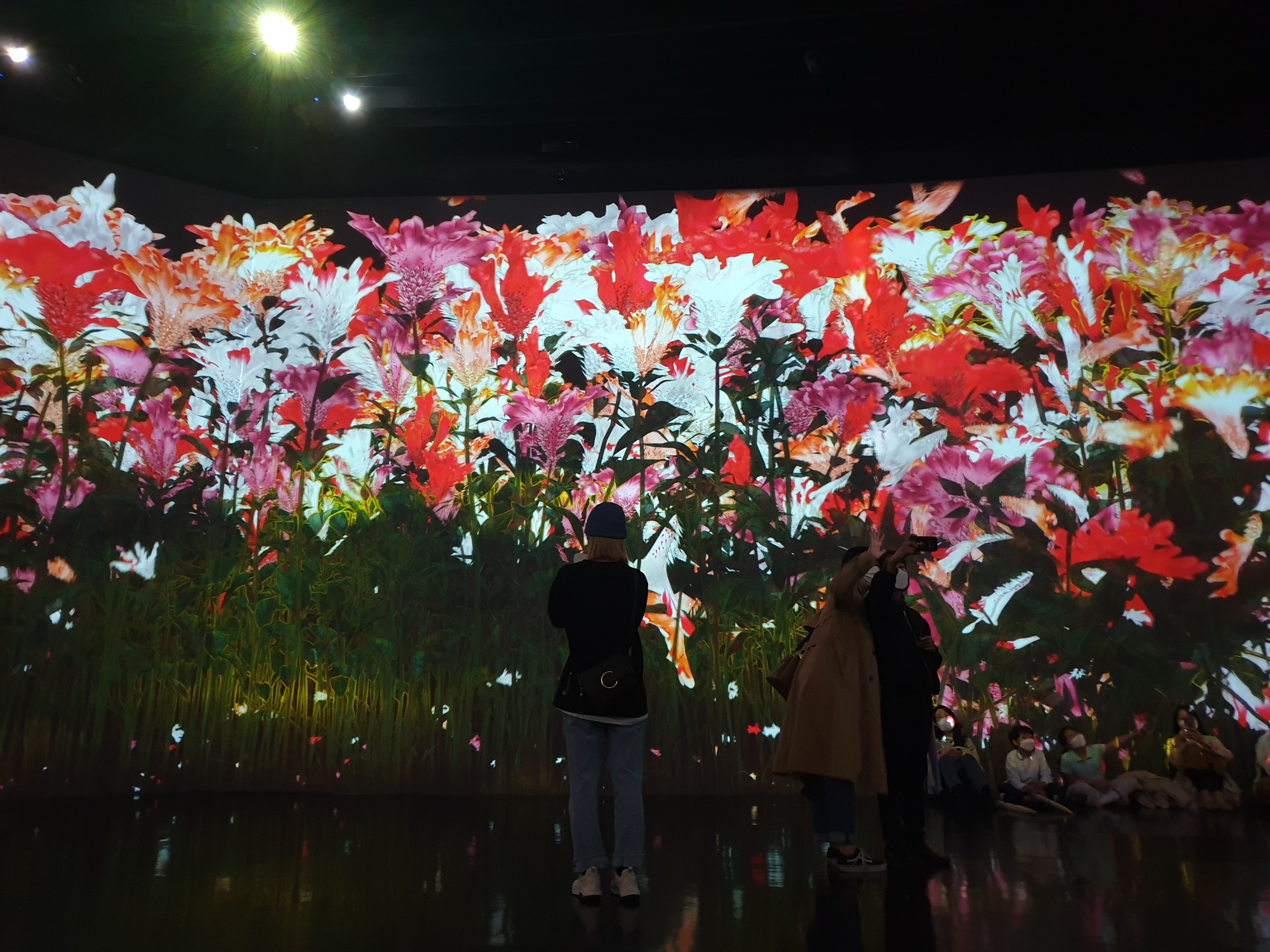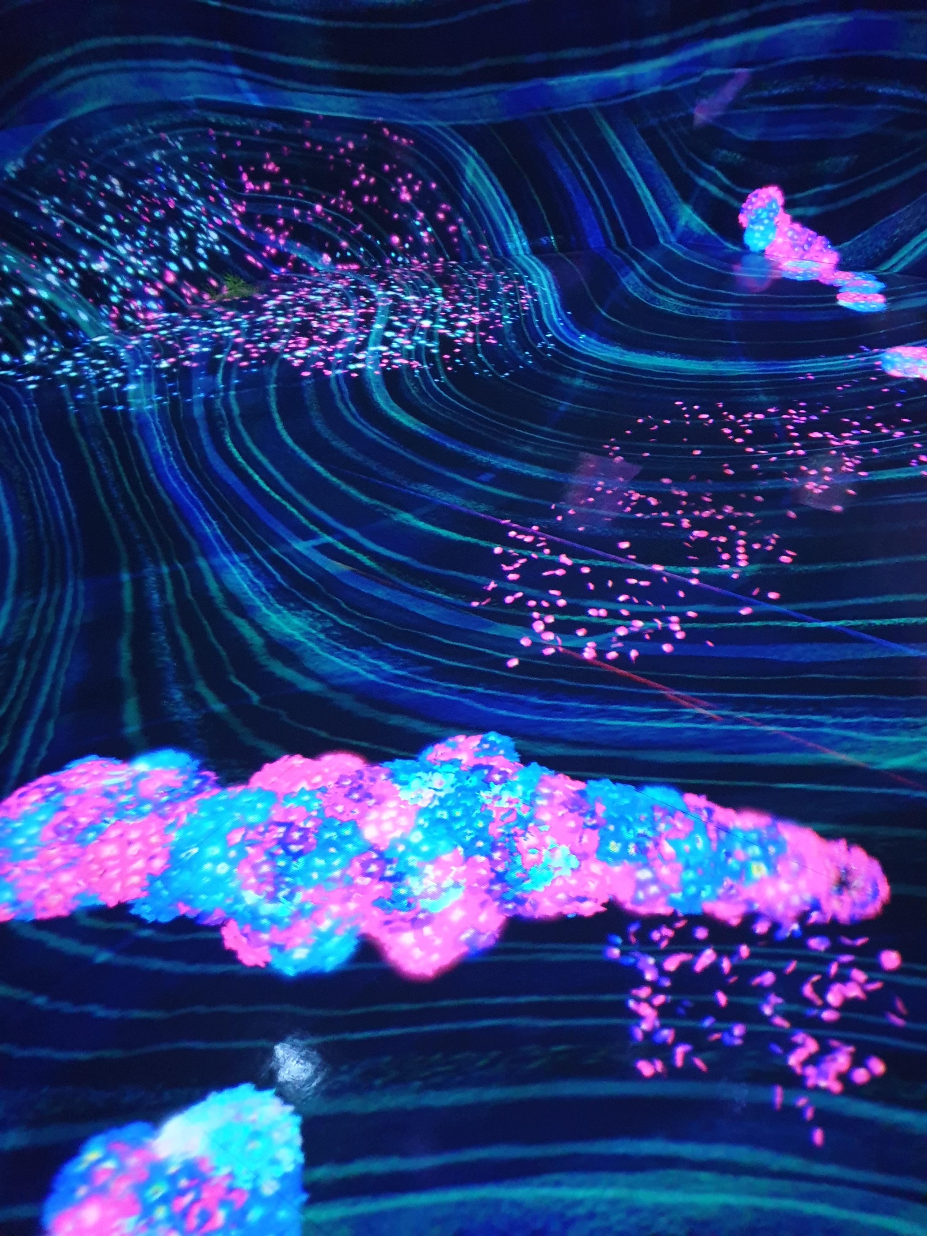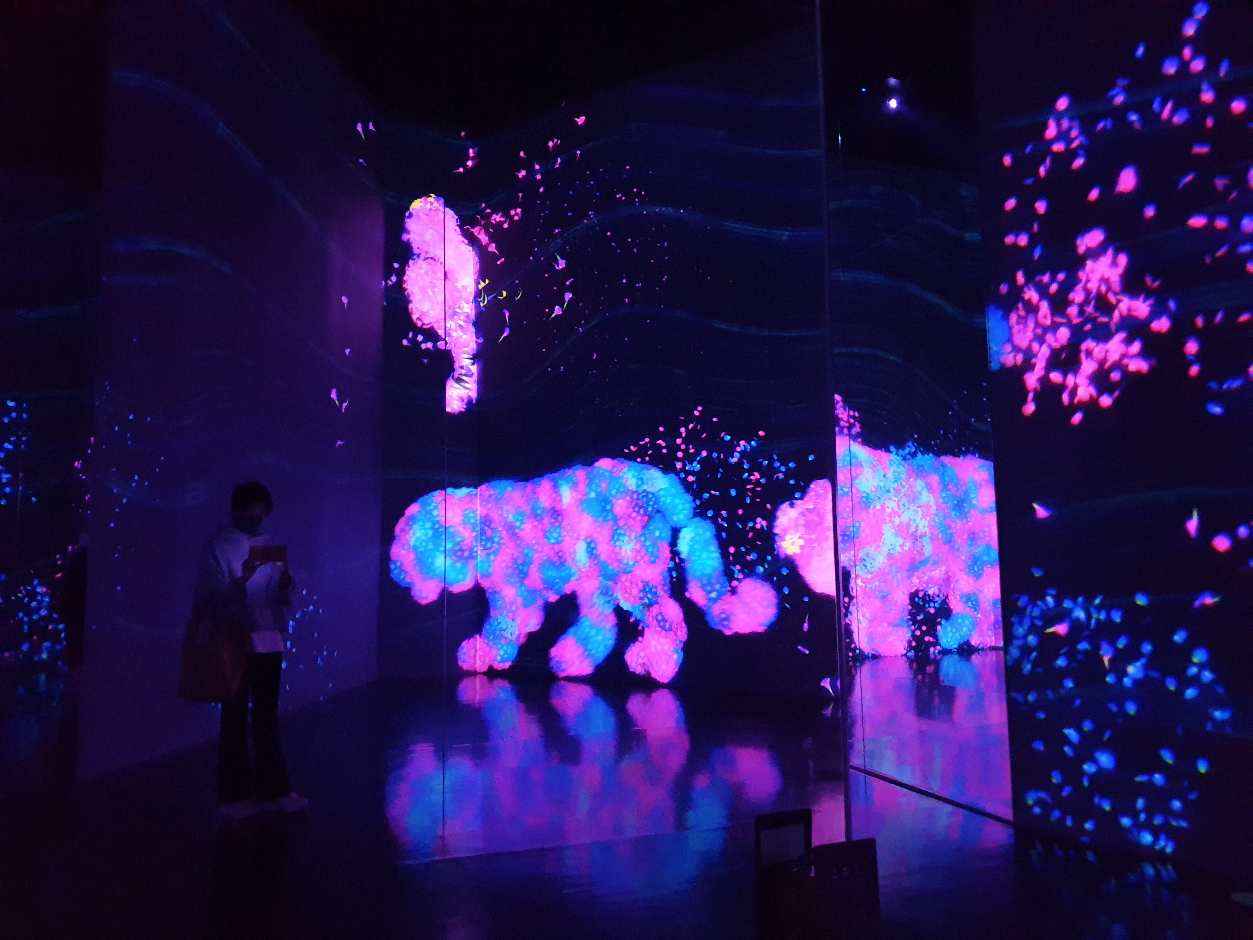 첫 전시는 "꽃과 함께 살아가는 동물들" & "고동치는 대지" & "꿈틀대는 골짜기의 꽃과 함께 살아가는 생물들"이다. 각 전시마다 간단하게 설명해주시는 분들이 있어서 더 좋았다. 꽃을 만지만 꽃이 떨어지고, 동물도 만지면 소리를 내거나 반응을 한다. 작품은 컴퓨터 프로그램에 의해 실시간으로 그려지기 때문에 사람들의 움직임의 영향을 받아들여 끝없이 변화한다고 한다. 지금 이 순간의 장면은 두 번 다시 볼 수 없다.