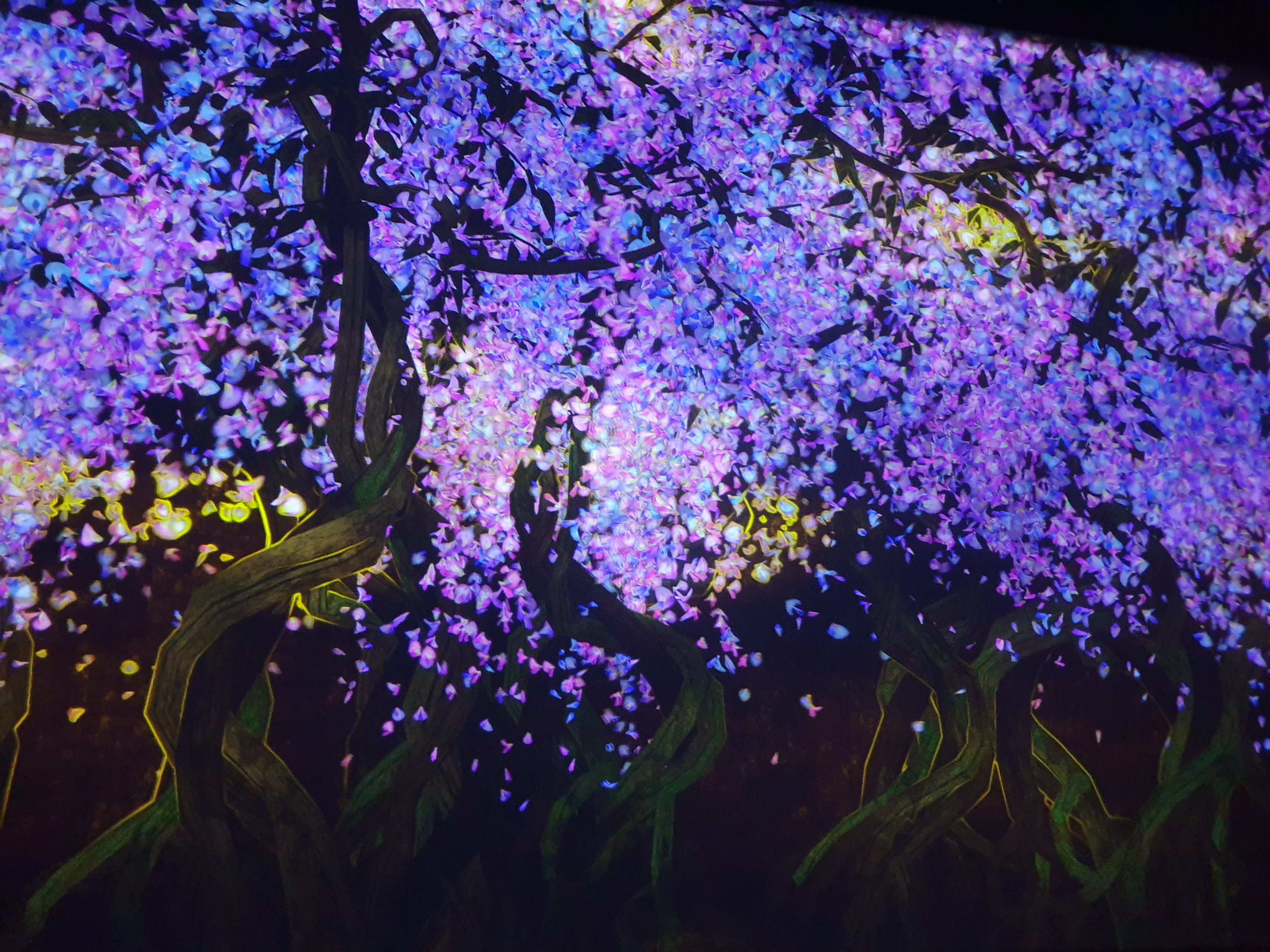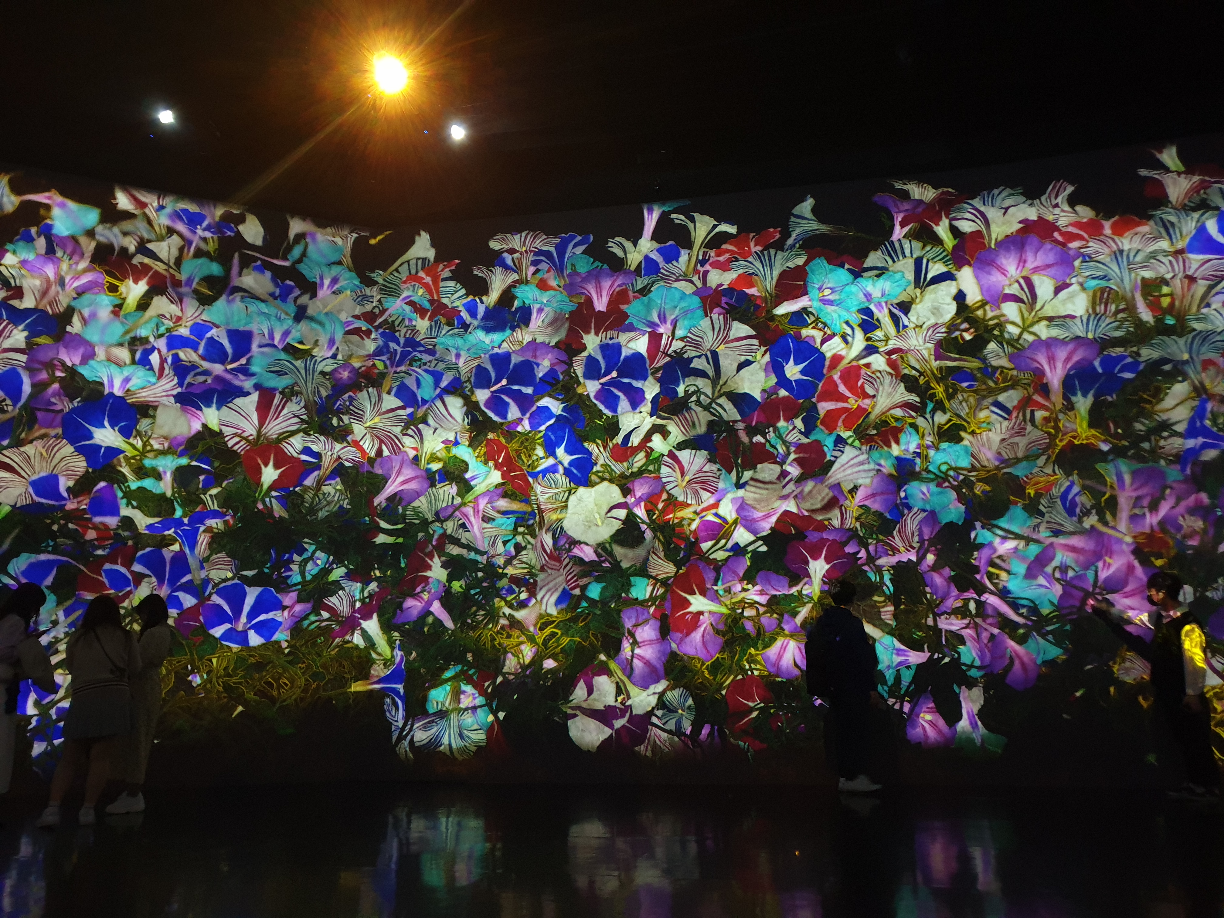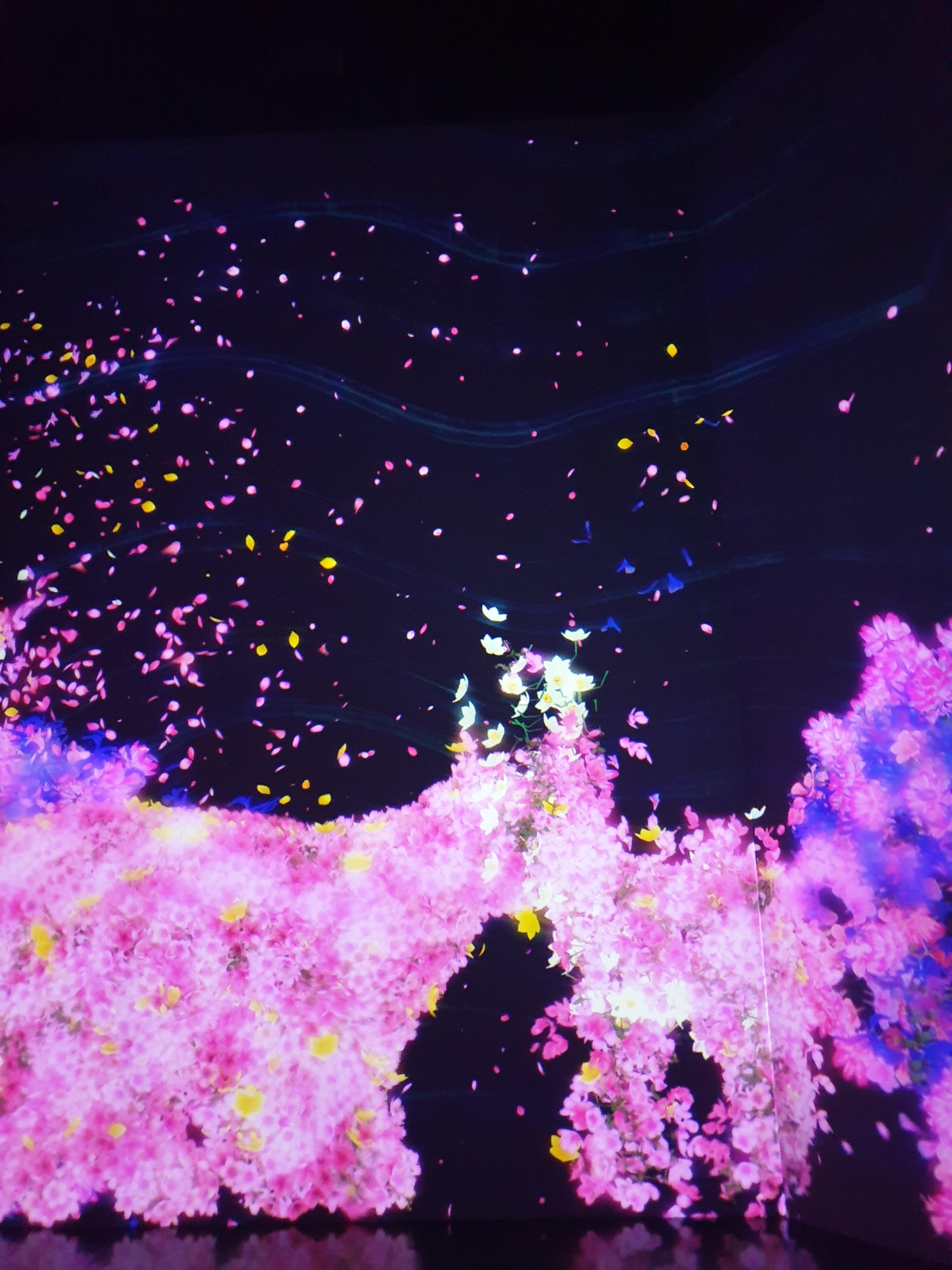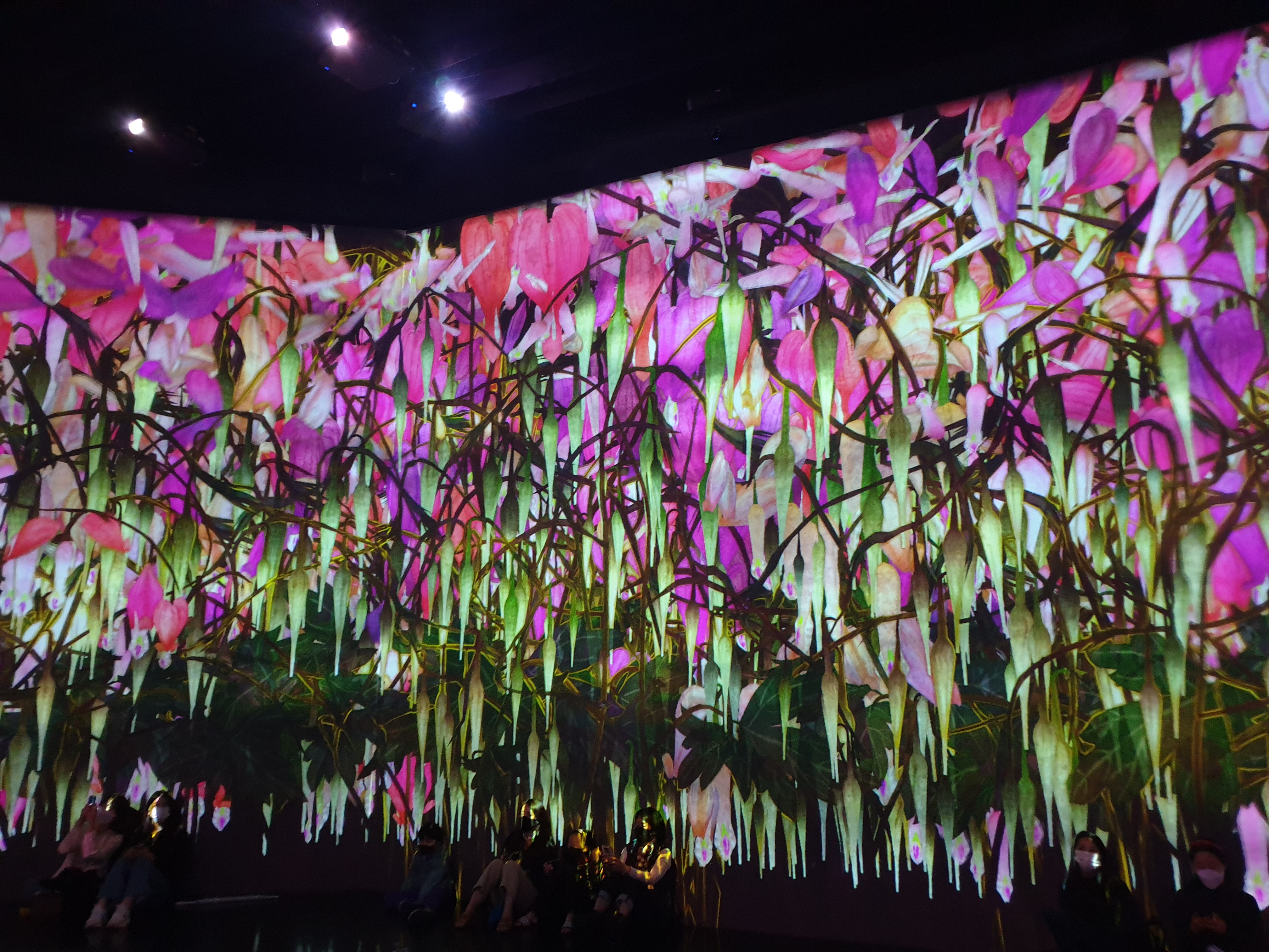 첫 전시는 "꽃과 함께 살아가는 동물들" & "고동치는 대지" & "꿈틀대는 골짜기의 꽃과 함께 살아가는 생물들"이다. 각 전시마다 간단하게 설명해주시는 분들이 있어서 더 좋았다. 꽃을 만지만 꽃이 떨어지고, 동물도 만지면 소리를 내거나 반응을 한다. 작품은 컴퓨터 프로그램에 의해 실시간으로 그려지기 때문에 사람들의 움직임의 영향을 받아들여 끝없이 변화한다고 한다. 지금 이 순간의 장면은 두 번 다시 볼 수 없다.