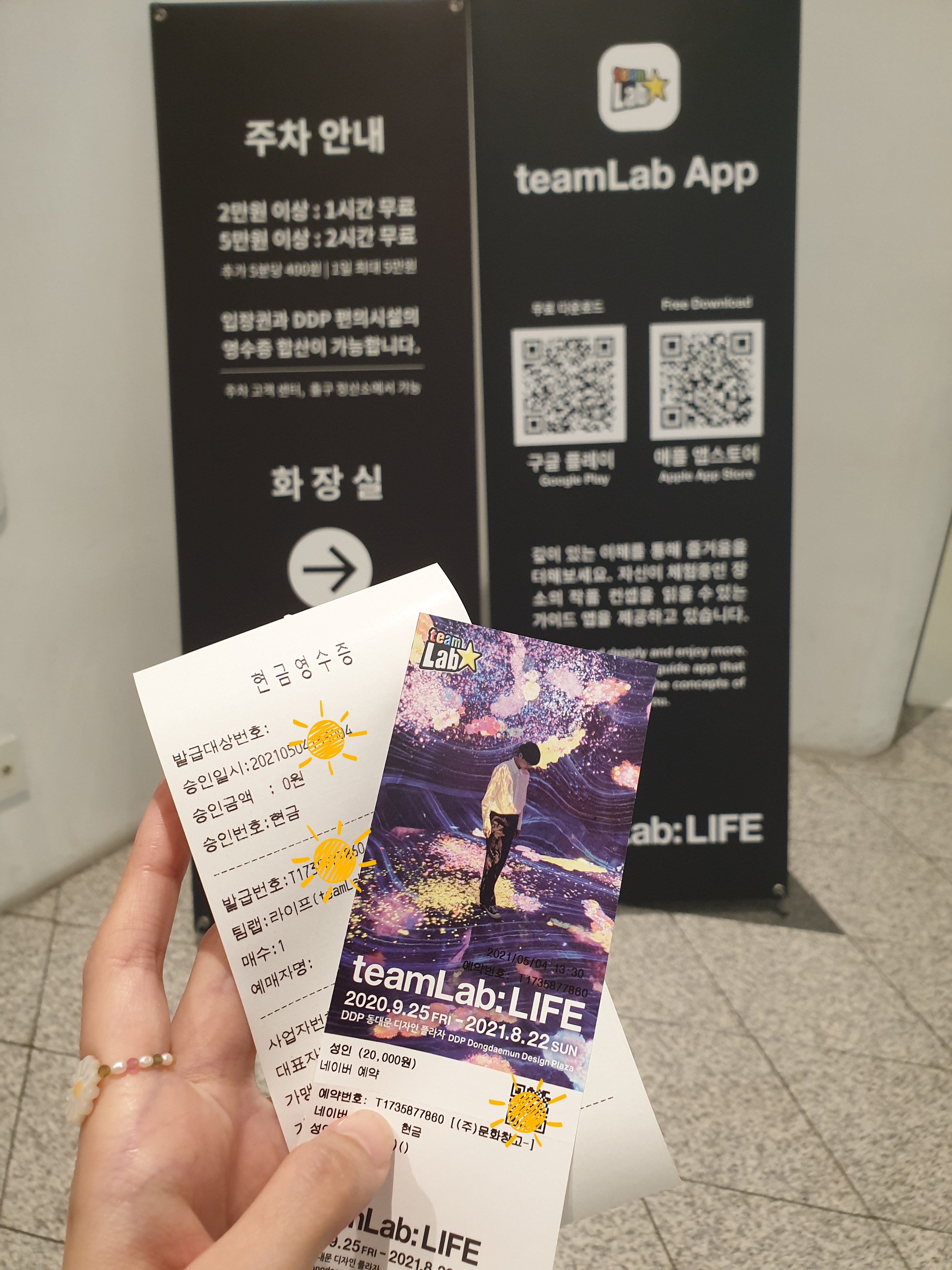 배움터M1으로 가서 어디서 예약했는지, 예약한 핸드폰 번호는 무엇인지, 이름은 뭔지 확인한 후 실물 티켓을 받을 수 있었다. 당연히 체온 측정과 QR코드도 찍고 드디어 입장이다😊. 주차는 티켓이 2만원이니 1시간 무료 가능하다.