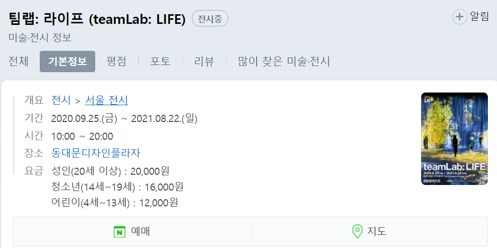 인터넷을 찾아보다가 예전에 제주도에서 한달살기를 할 때 보았던 전시와 방식이 비슷한 "팀랩:라이프"가 눈에 띄었다. 제주도에서 봤을 때 너무 좋아서 다음에 가게 되면 또 봐야지...했는데 멀지 않은 곳에서 비슷한 스타일에 전시를 하는 게 마음에 들어서 바로 네이버 예약을 했다.