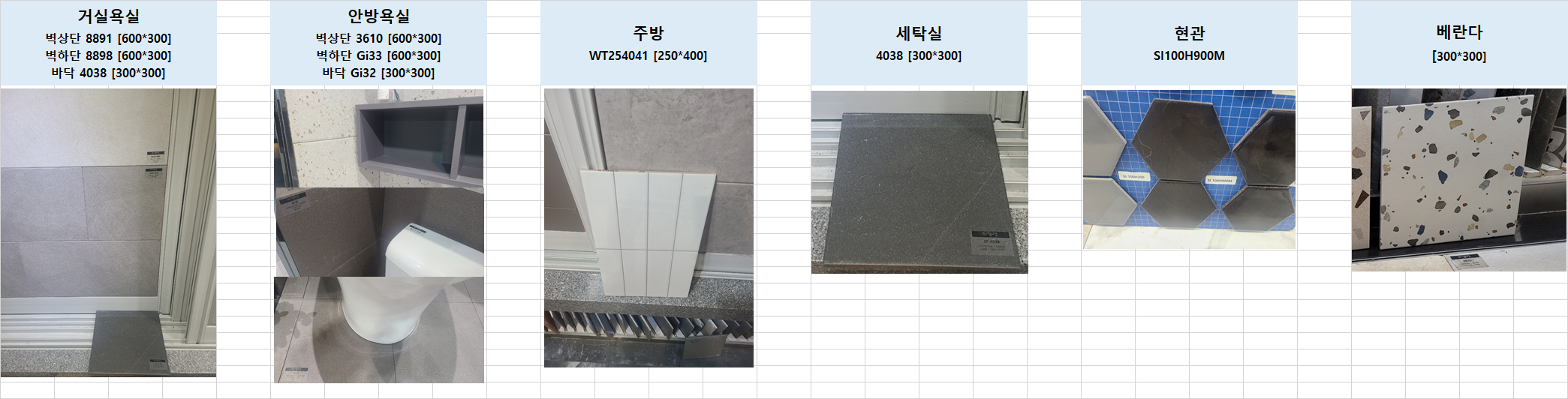 그리고 인테리어 업체에서 타일을 정리해서 보내줬다고 한다. 요렇게 요렇게! 남자친구가 골랐지만 무난무난하니 다 마음에 든다 (다시 한 번 말하지만, 나는 깔끔하고 깨끗하기만 하면 인테리어 신경 안 씀).