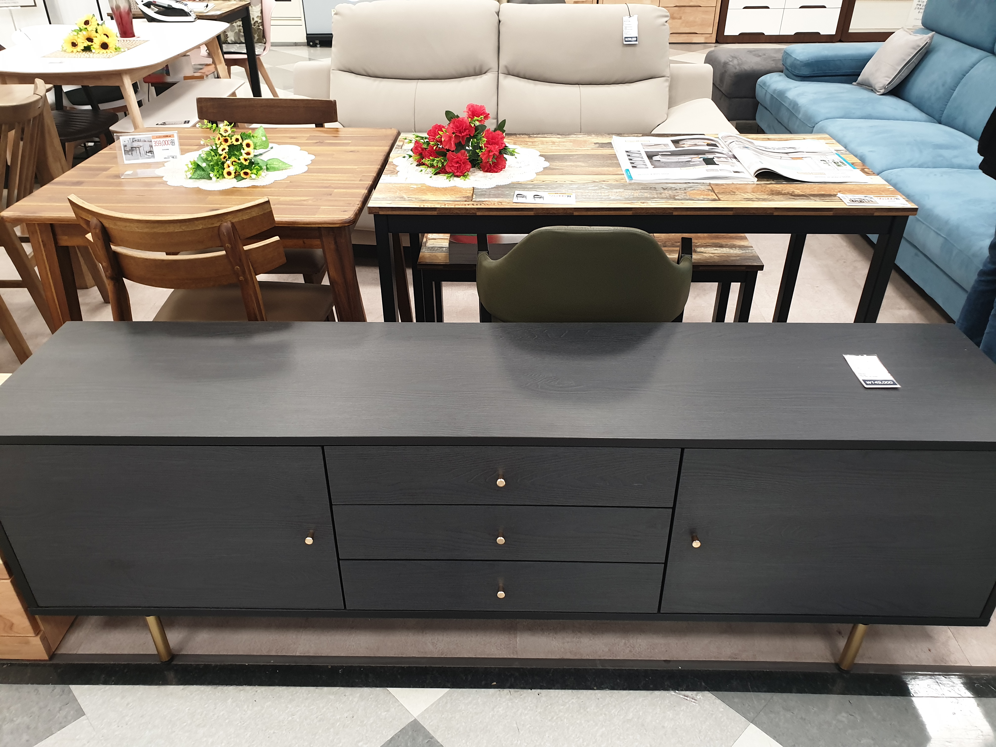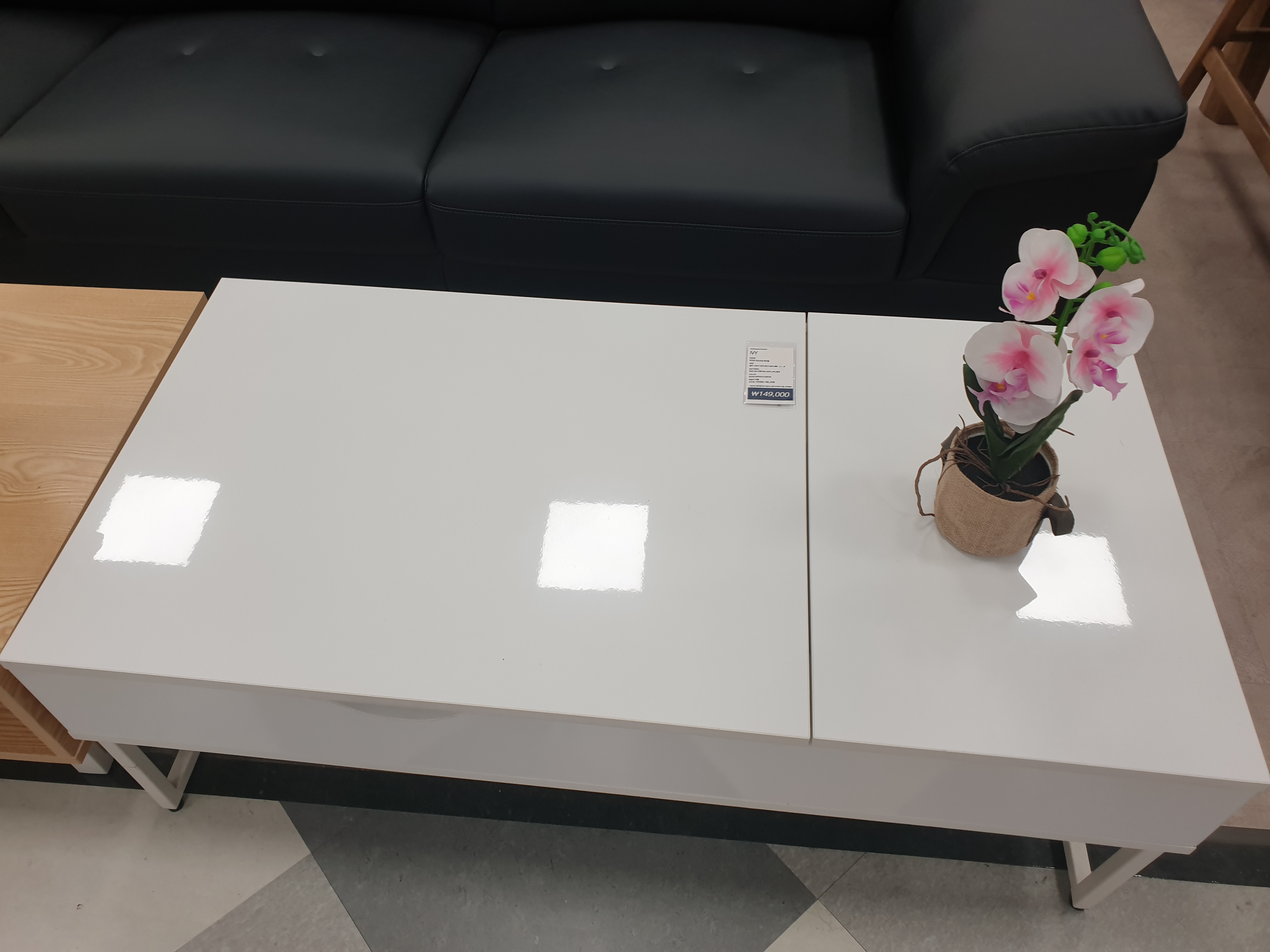 아이비 리프트업 소파 테이블, 메리골드 거실장도 구경하였다. 사진에서도 보이시겠지만 화이트는 유광 느낌이 확실했고, 네이비는 나무결이 느껴지는 디자인이었다. 색상 자체는 화이트가 마음에 들지만 너무 빤딱빤딱한 느낌이 들어 조금 아쉬웠다. 테이블과 거실장은 다른 회사 제품도 더 구경해보고 구매해보기로 했다.