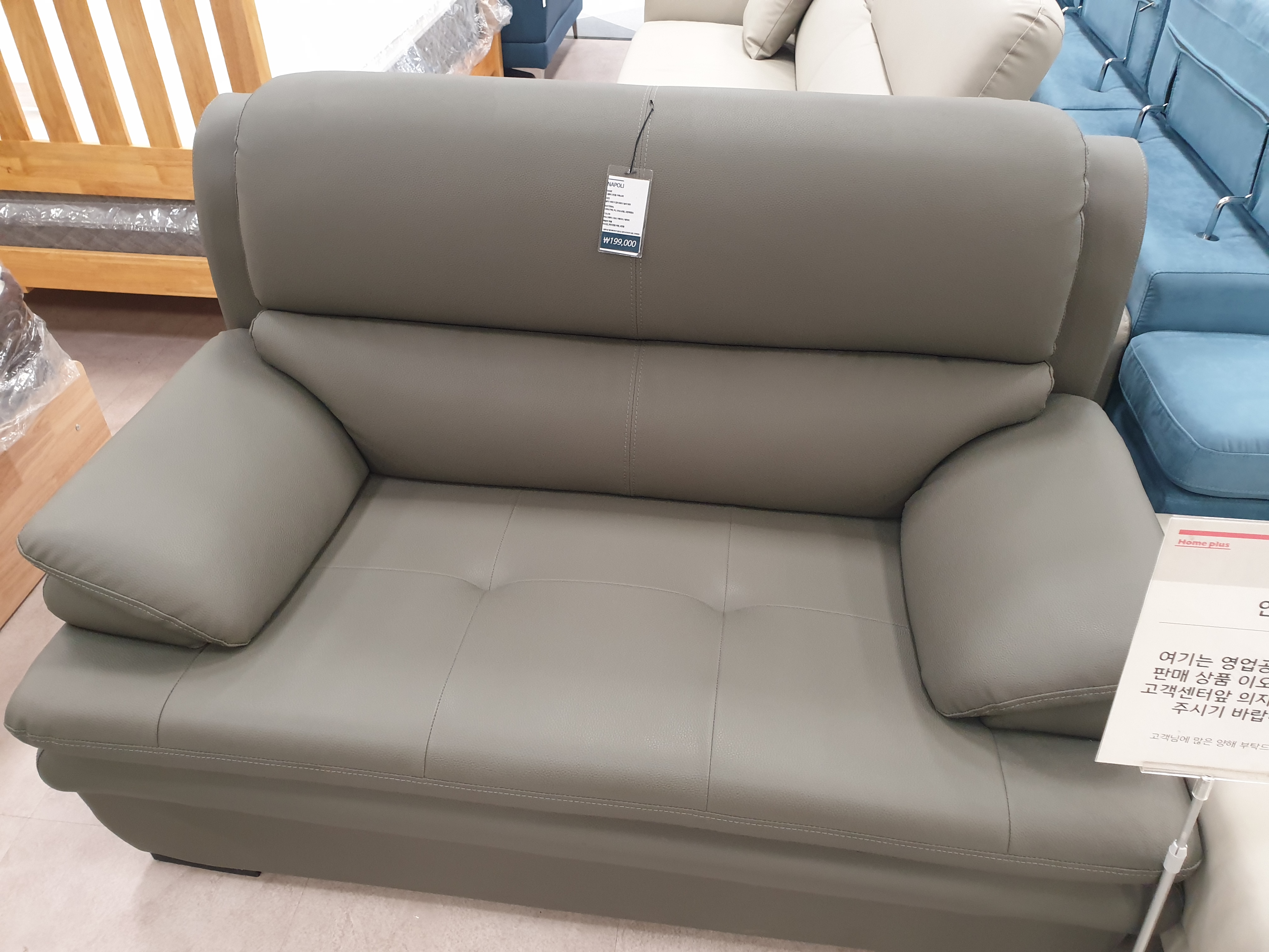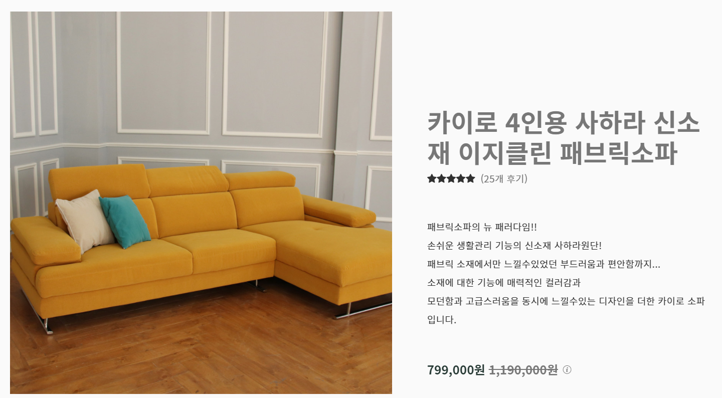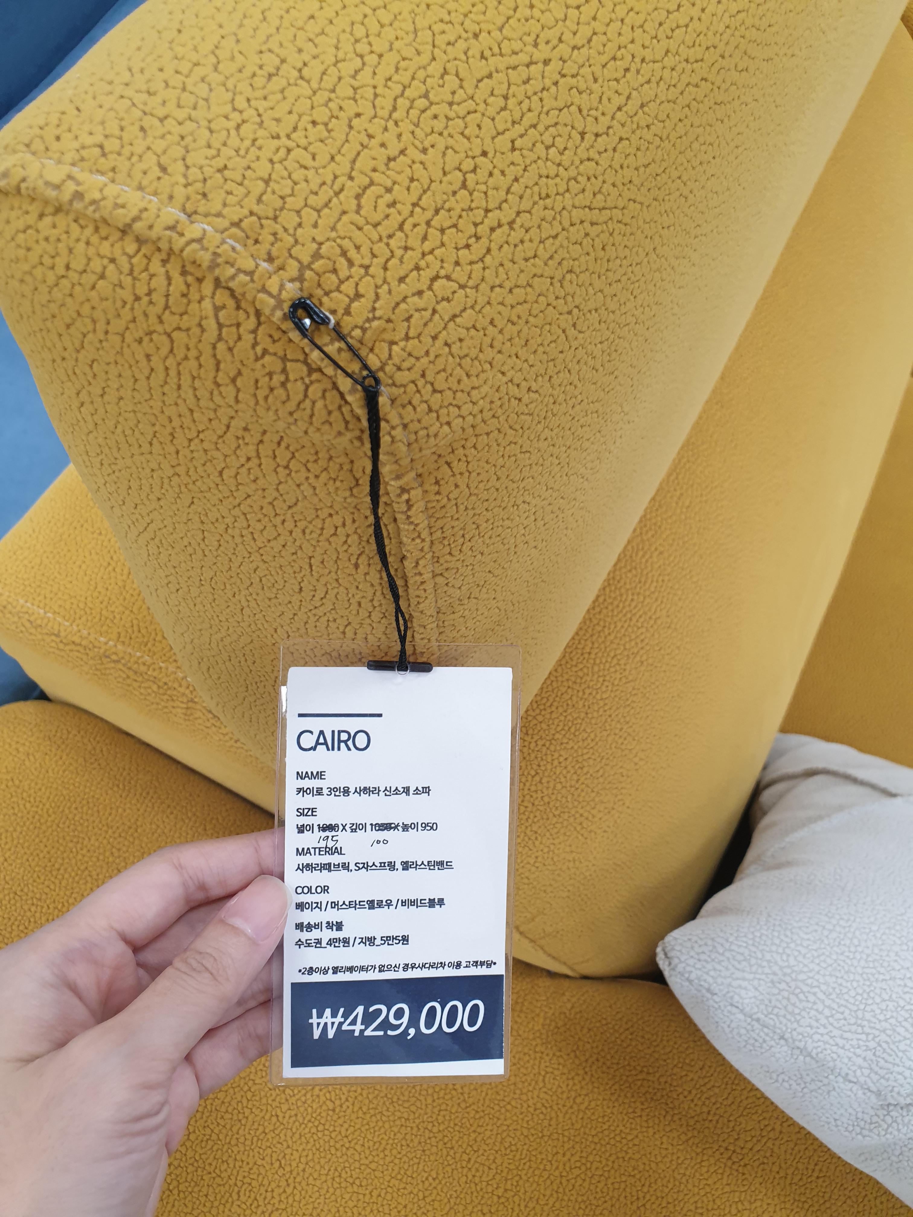 우리가 구매하려고 한 건 카이로 4인용인데, 쇼룸에는 2~3인용만 전시가 되어있어서 이걸로 색과 푹신함, 구조 등을 확인했다. 카이로는 패브릭 소파이고, 생활관리가 쉬운 신소재 사하라 원단을 썼다고 한다. 4인용 가격은 799,000원 (배송비 별도)이다.