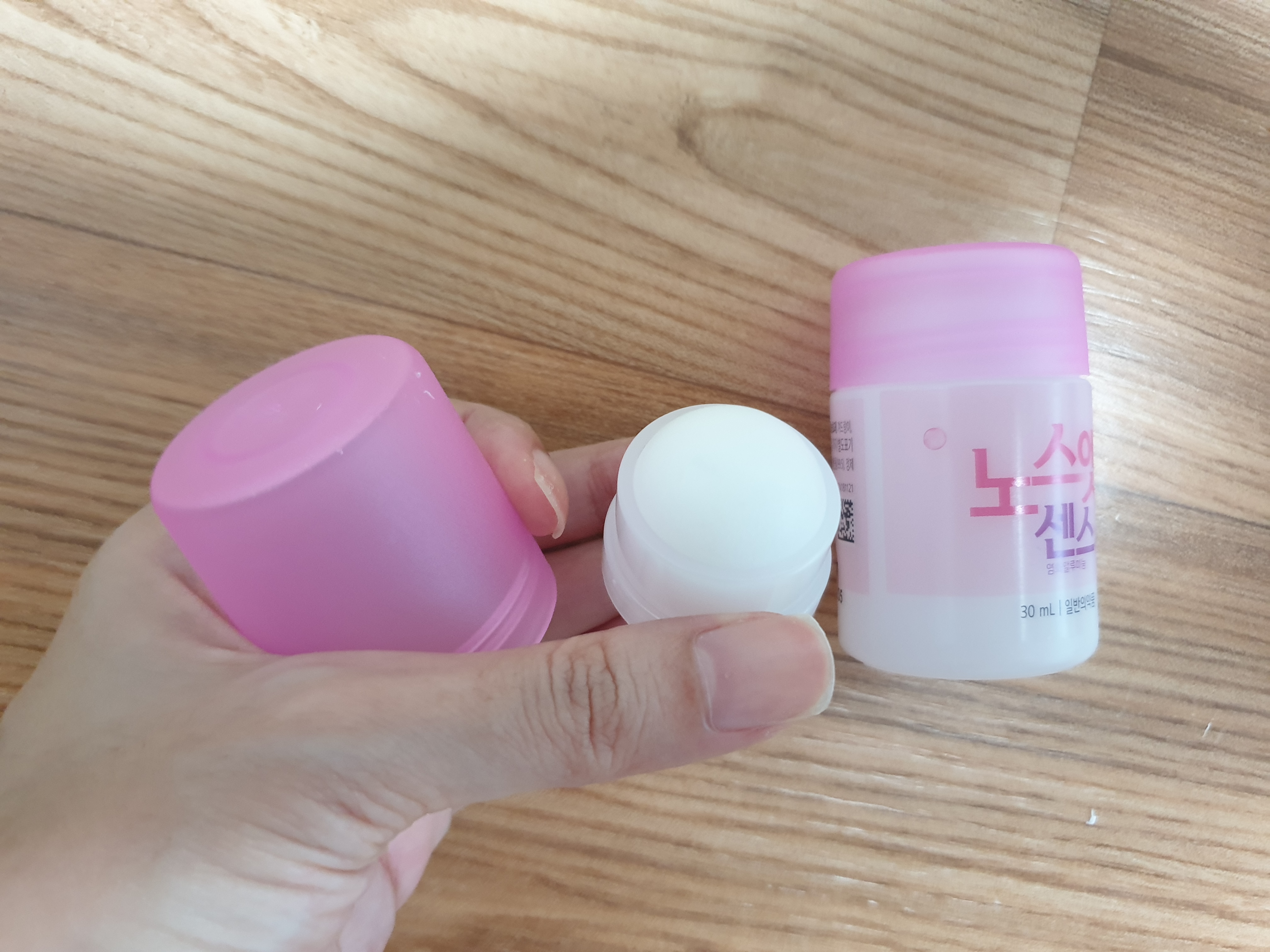 처음 박스를 열면 아래와 같이 구성이 되어있다. 그러면 이걸 조립을 해야 한다. 일단 내용물이 쏟아지지 않게 수평인 상태에서 마개를 열고, 동봉된 롤온캡을 용기와 단단히 결합하면 된다. 그 다음 뚜껑 씌우면 끝!