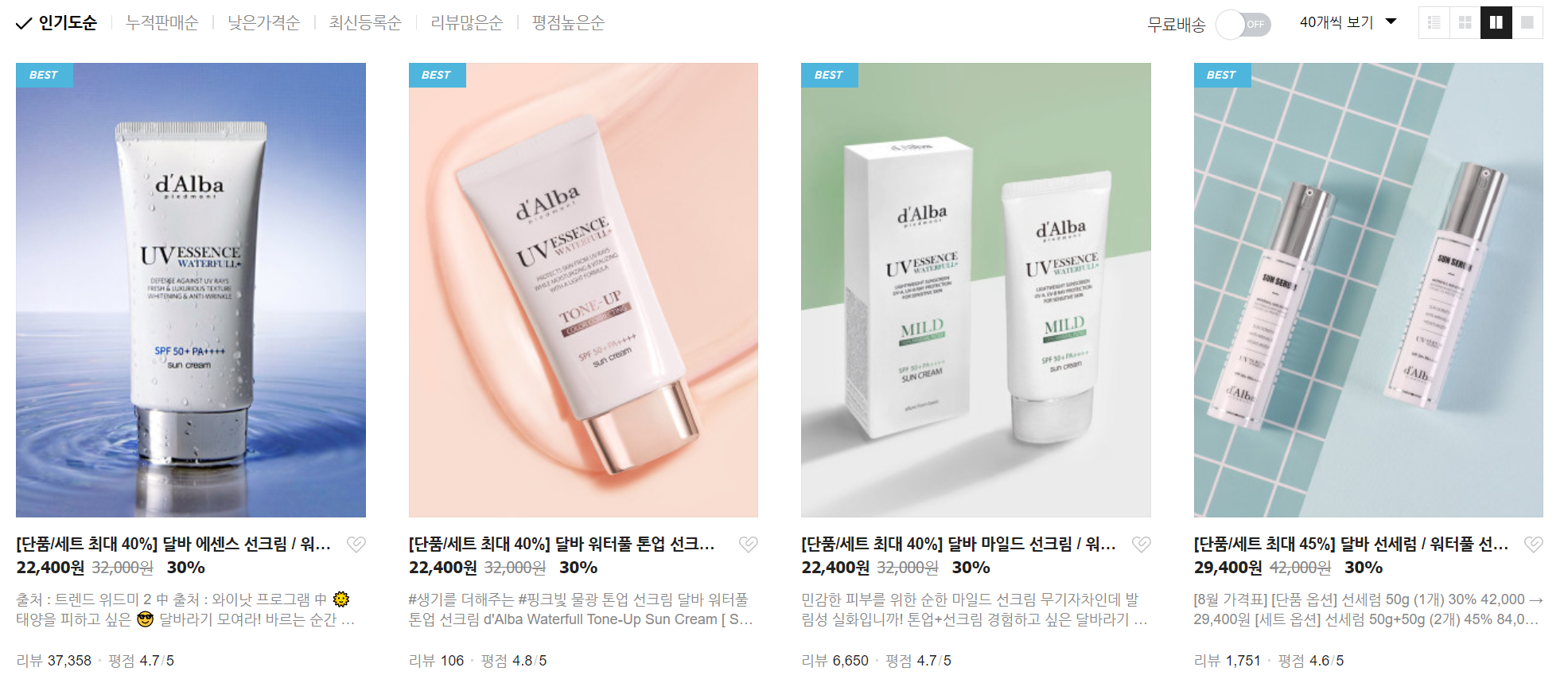 나는 이중에 "달바 에센스 선크림 + 달바 마일드 선크림"을 할인받아서 싸게 구매하였다. 이 중 현재는 마일드 선크림을 써보고 있는 중이다.