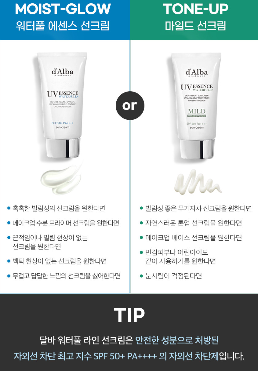 원래 달바에서 유명한 선크림은 에센스 선크림이다. 그래서 에센스 선크림만 구매하려고 하다가 비교도 할 겸 하나씩 구매를 해보았다. 2개 선크림의 구분은 아래 이미지가 정확하다.