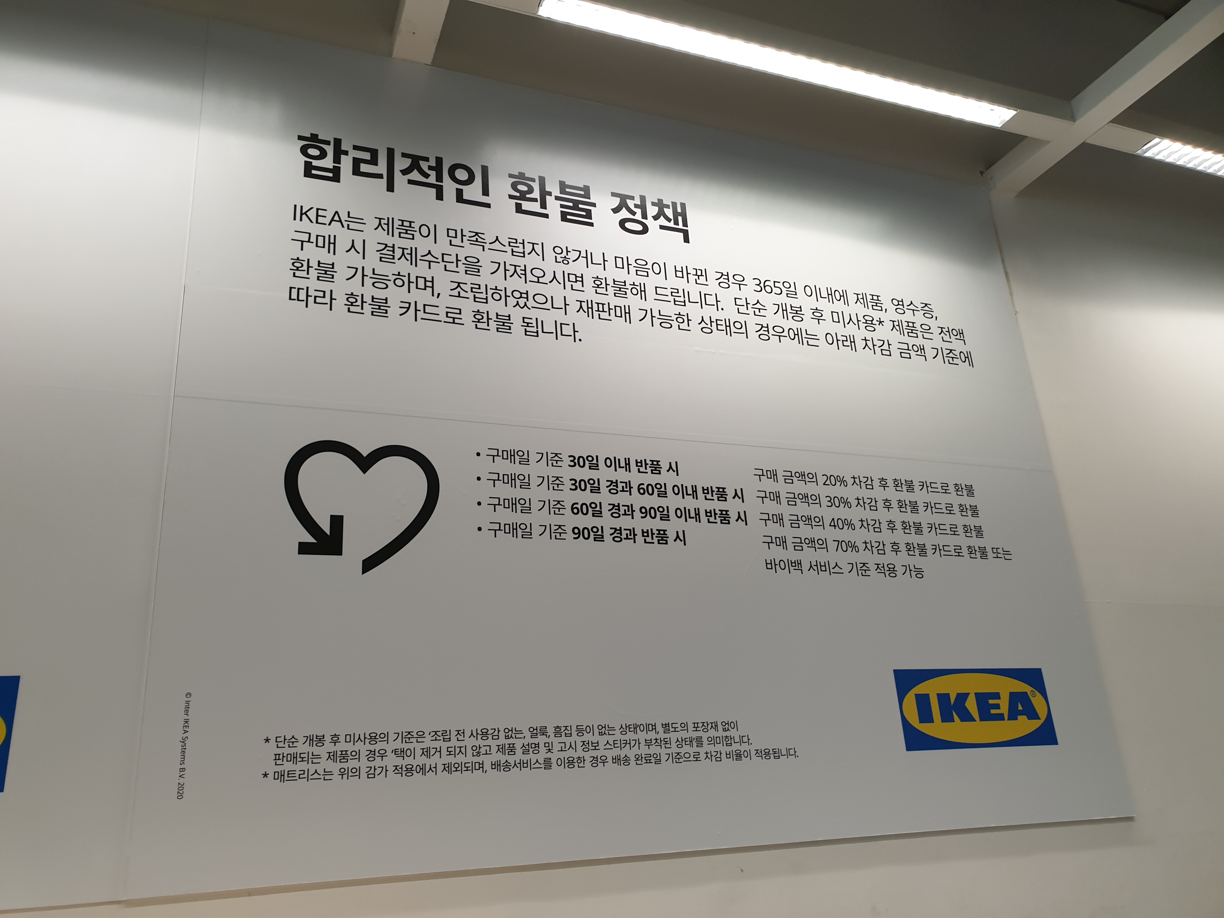 남자친구가 이케아 환불 정책이 매우 마음에 든다며 좋아했는데, 일단 단순 개봉 후 미사용 제품 또한 환불이 가능하다. 전액 환불이 되는 경우도 있고, 아래 이미지처럼 조건에 따라 일부 차감 후 환불 카드로 제공되기도 한다.