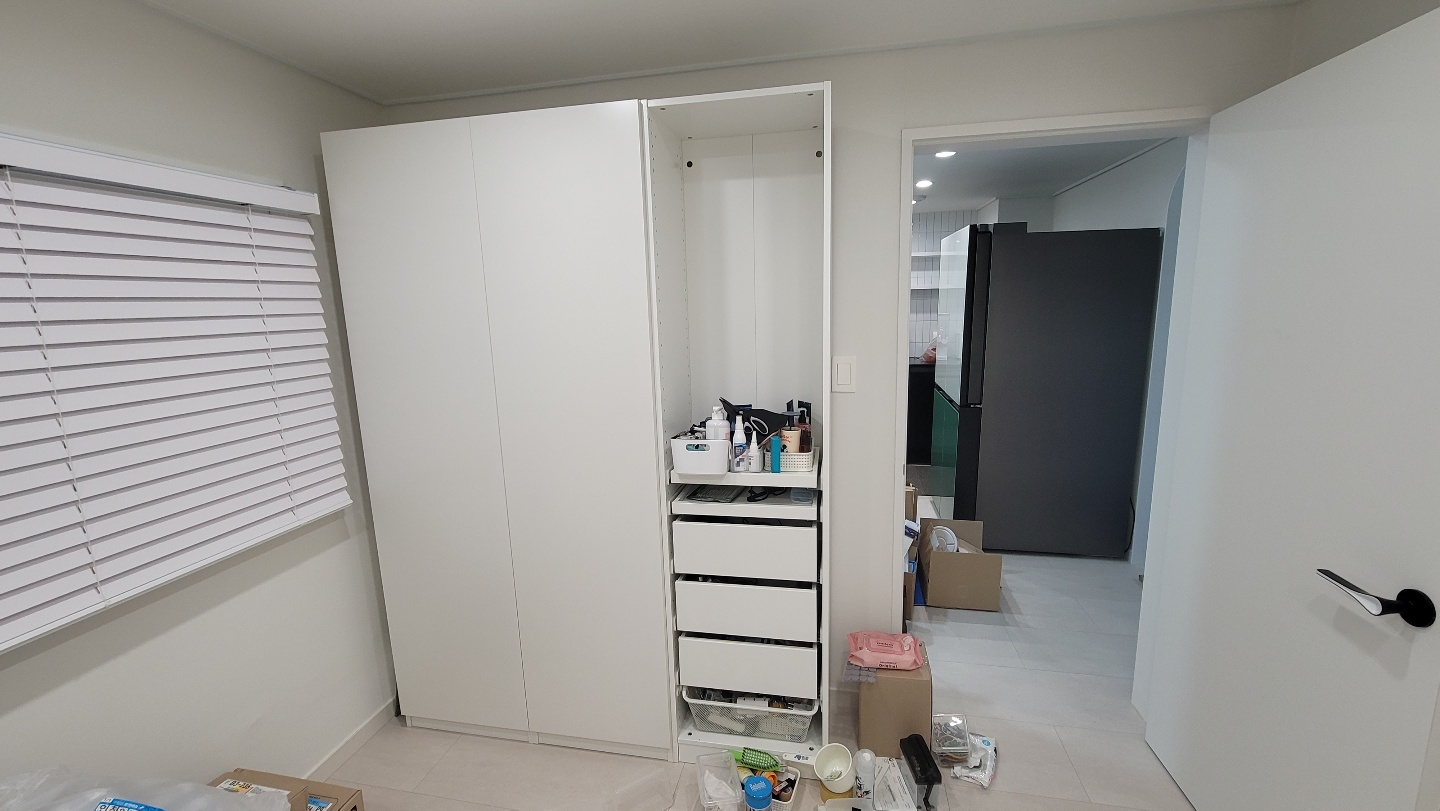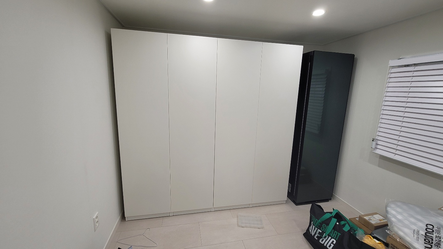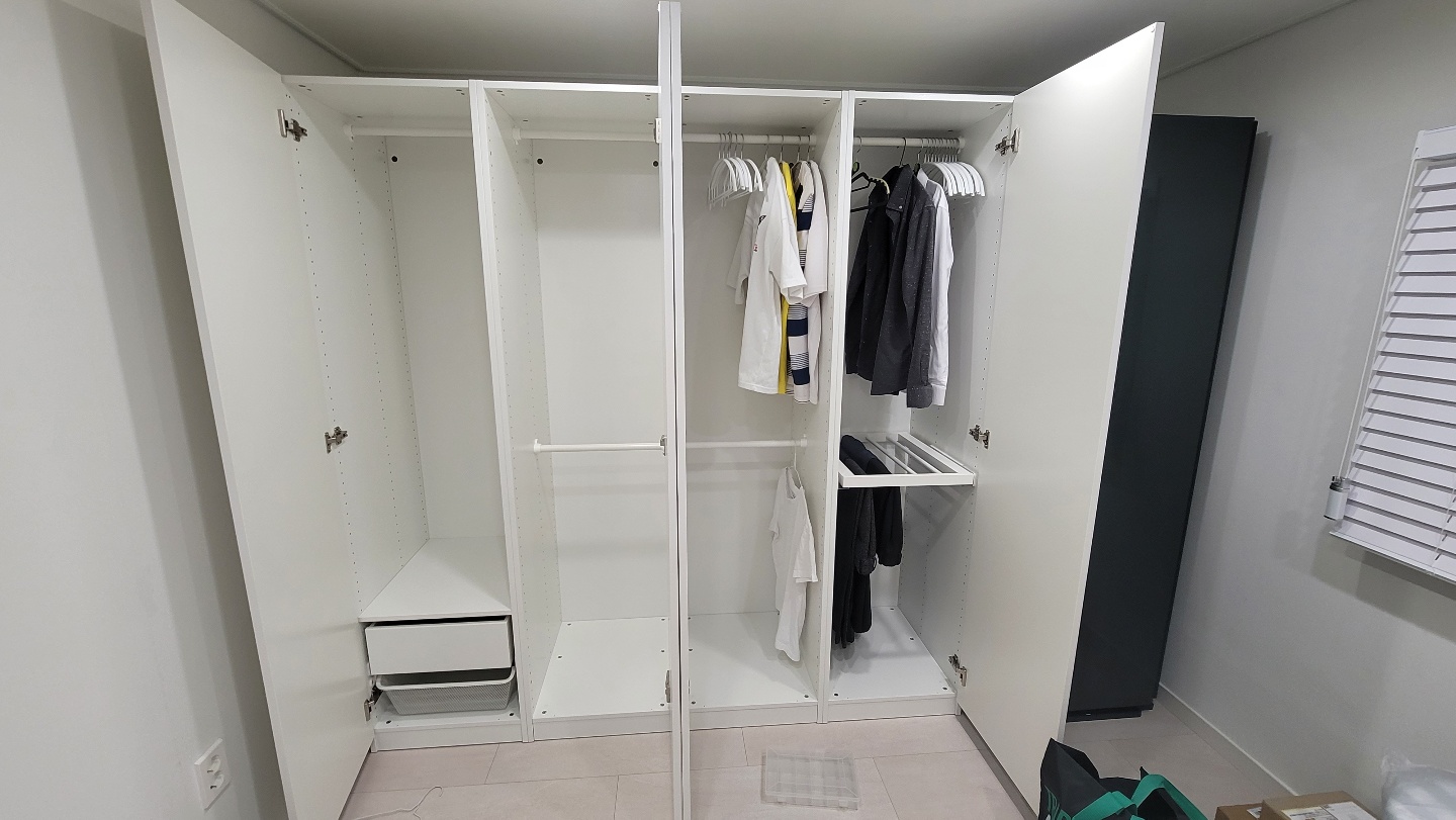아! 궁금하실 것 같아서 조립한 이케아 장롱을 잠시 보여드리고자 한다. 내가 직접 하지 않았지만 옆에서 지켜본 소감은... 음... 그냥 조립된 걸 사는 게 좋은 것 같다🤣 (가격도 저렴하고, 원하는 스타일로 할 수 있고 다 좋은데 생각보다 배달 온 양이 엄청 많고 무겁고 조립도 기술이 없다면 엄청 힘들다)