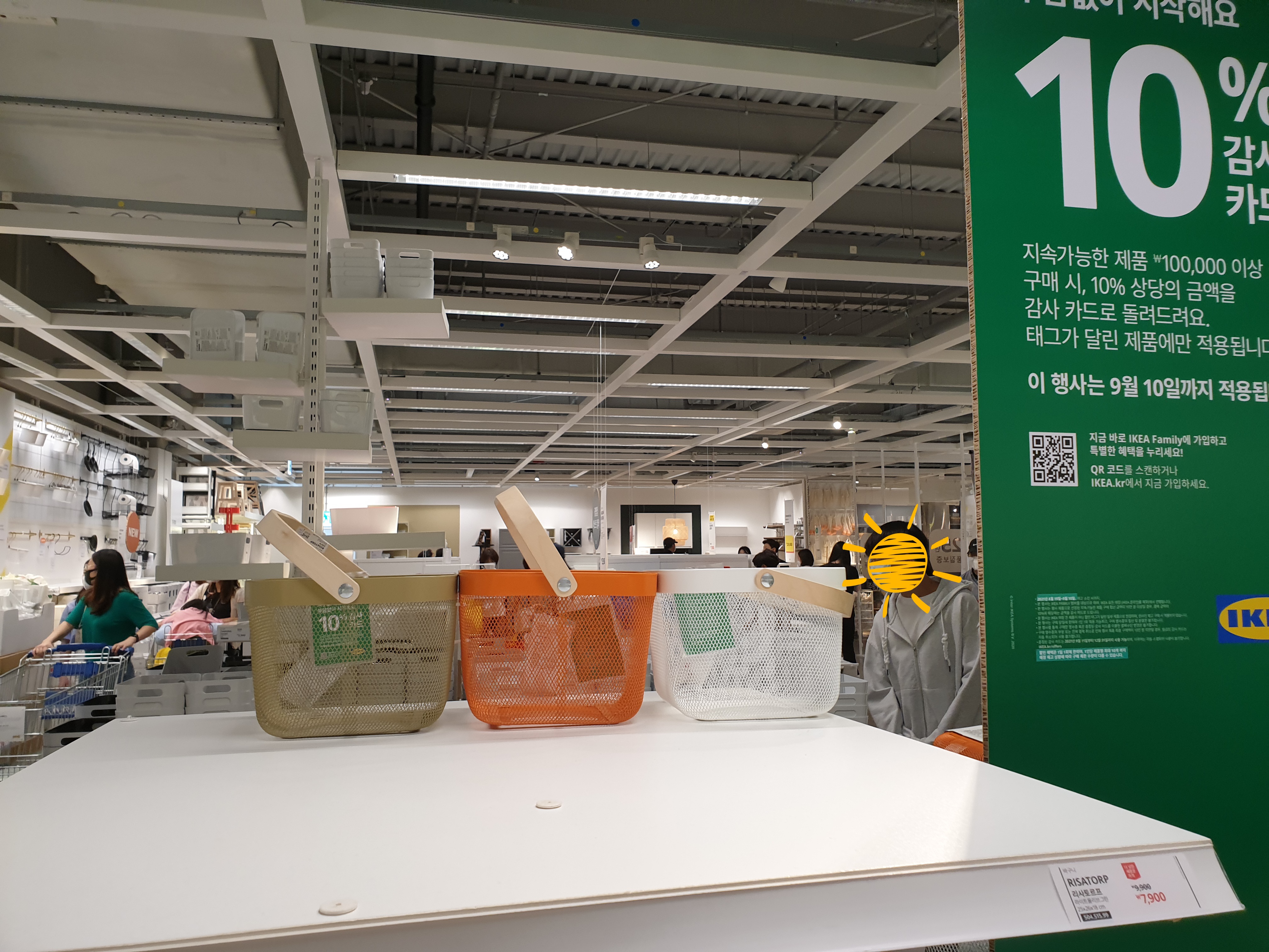 이케아에서 유명하다고 하는 바구니 리사토르프(RISSTORP) 7,900원. 바구니가 예쁜 건 알겠는데 이건 다들 어디에 쓰시는지 궁금했다. 활용 방법을 알 수 없어 구매하지 못한 1인. 흰색, 오렌지색, 카키색 이렇게 3가지 색상이 있었는데 3개 뭔가 세트로 예뻐 보였다.