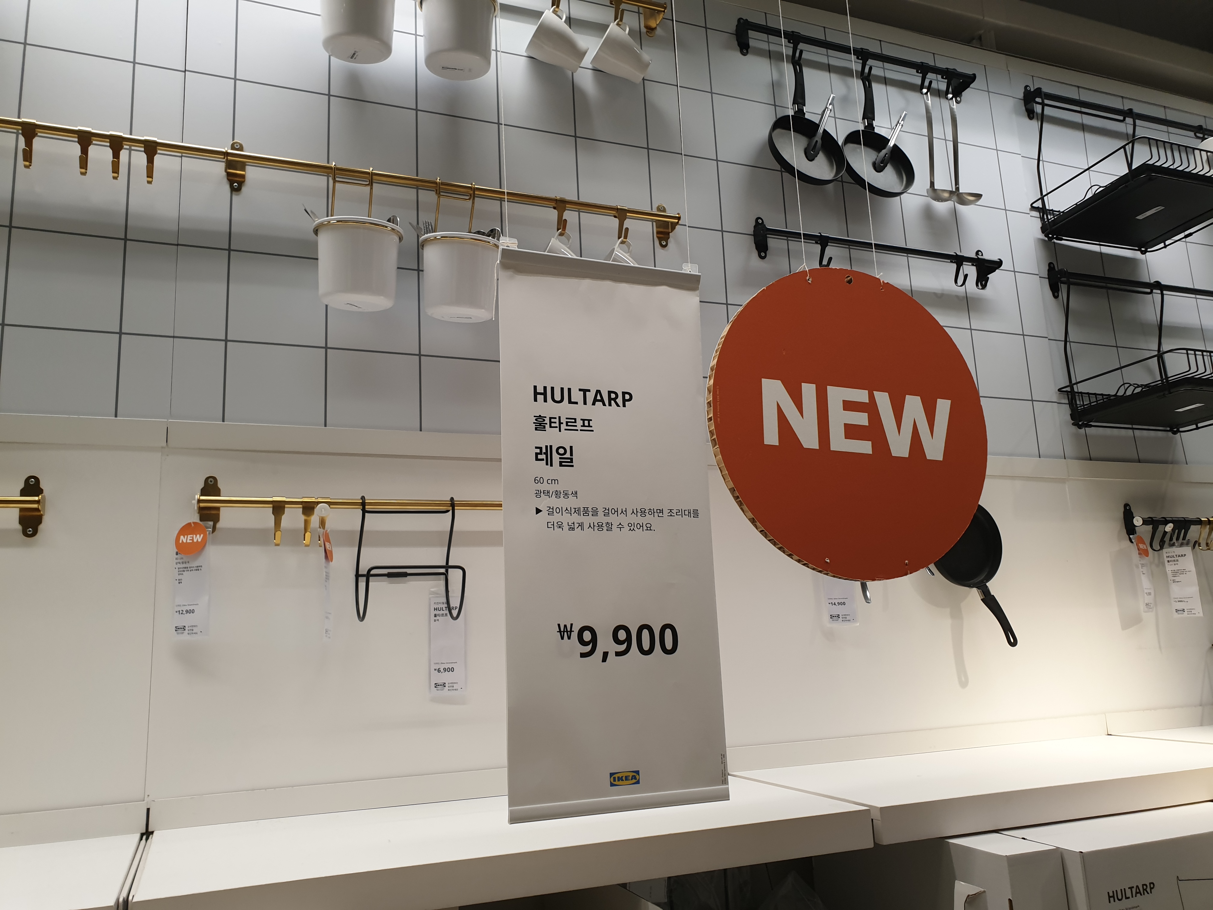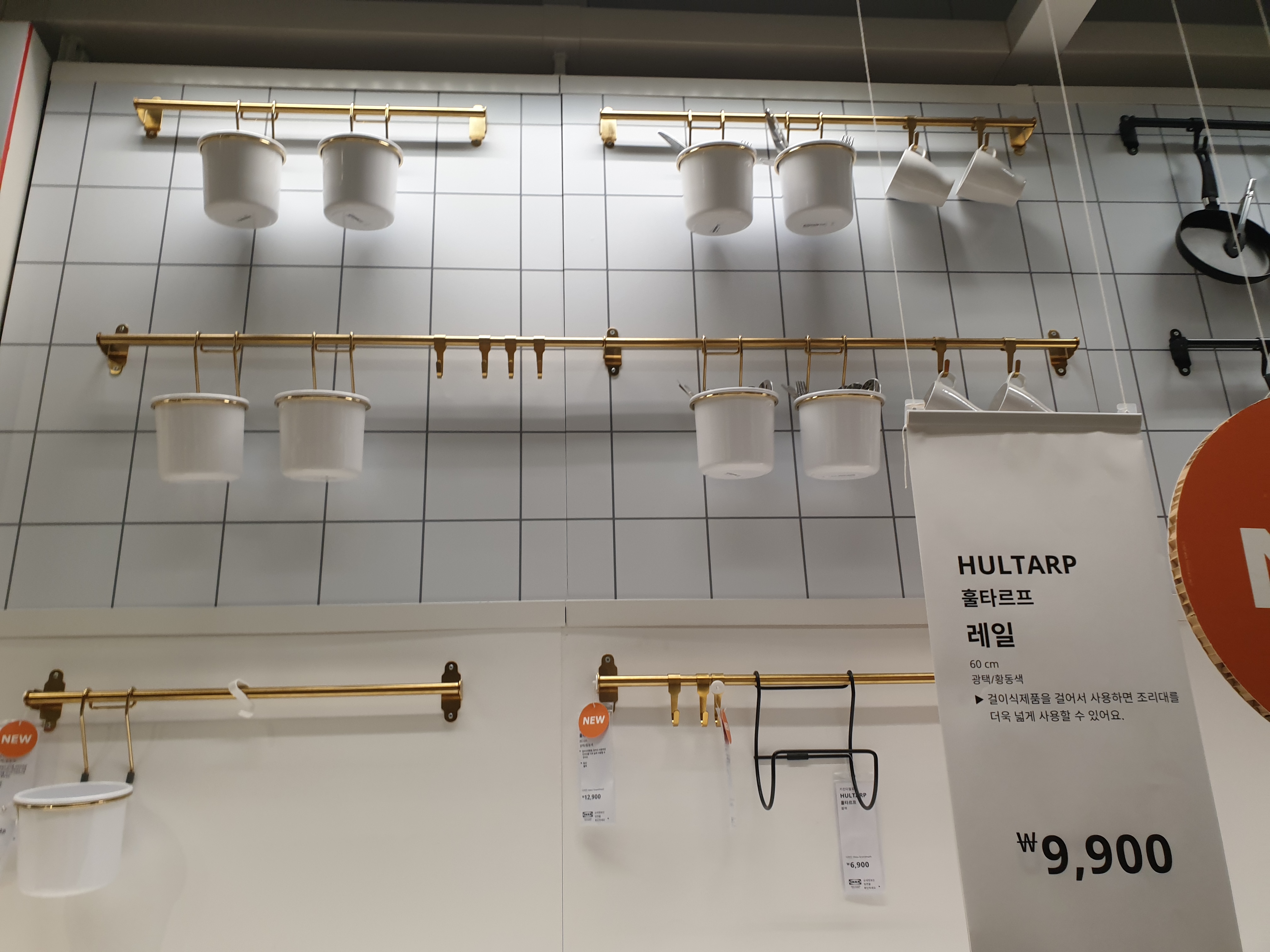 갑자기 등장한 레일! 훌타르프(HULTARP) 9,900원! 레일도 내가 사진 찍은 황동색 제품, 약간 무광 스테인리스 같은 느낌의 제품, 검은색 제품 등 다양했는데 뭔가 황동색 이거 예뻤다.