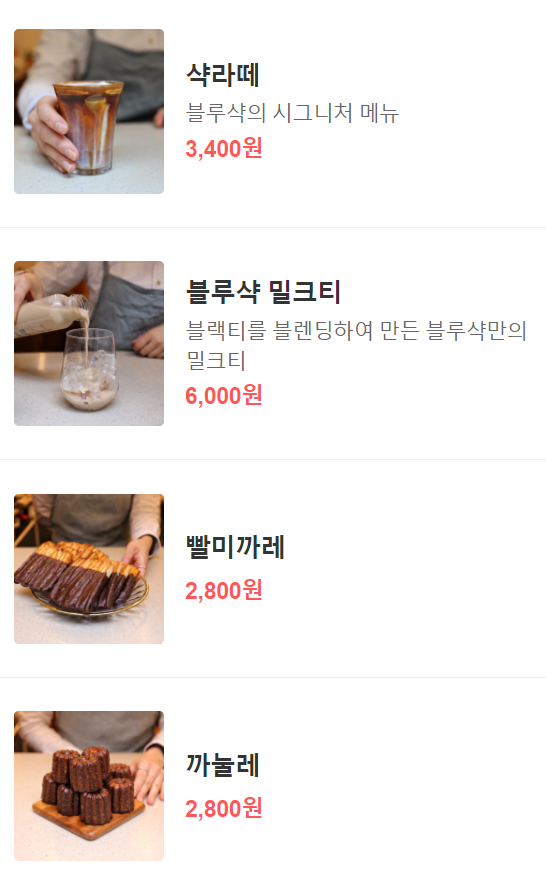 3. 메뉴 : 샥라떼 (3,400원), 블루샥 밀크티 (6,000원) 등
