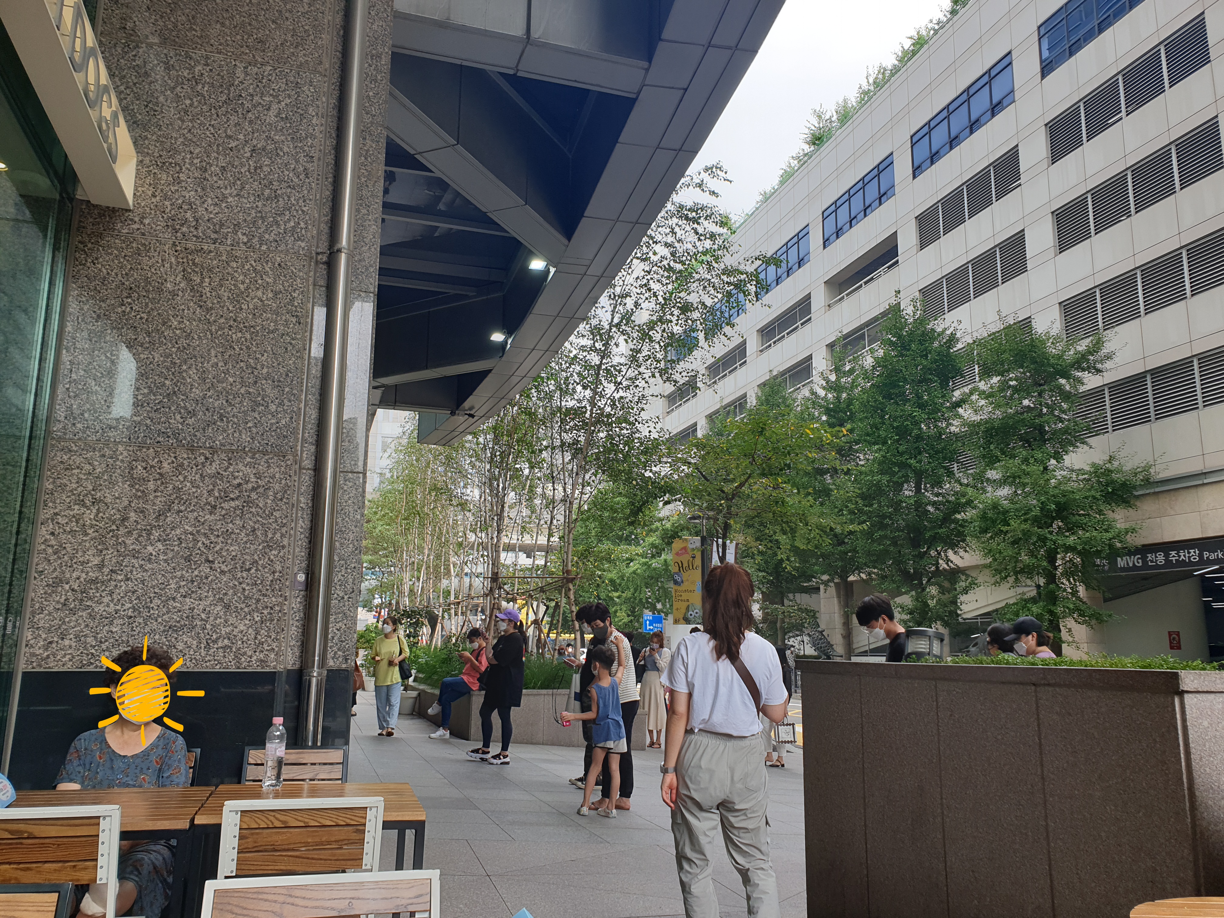 1층에 있는 쉑쉑버거 바깥쪽 자리에 앉아서 대기하다가 체온 재고 QR코드 찍고 입장하였다.