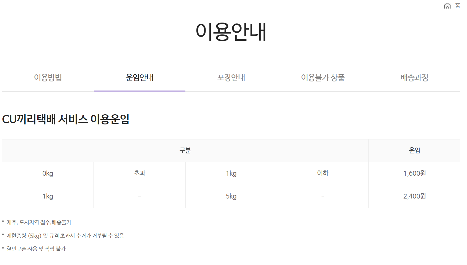 다른 건 운임(가격) 하나인듯! CU 반값택배는 운임이 굉장히 단순하다. 1,600원 or 2,400원!