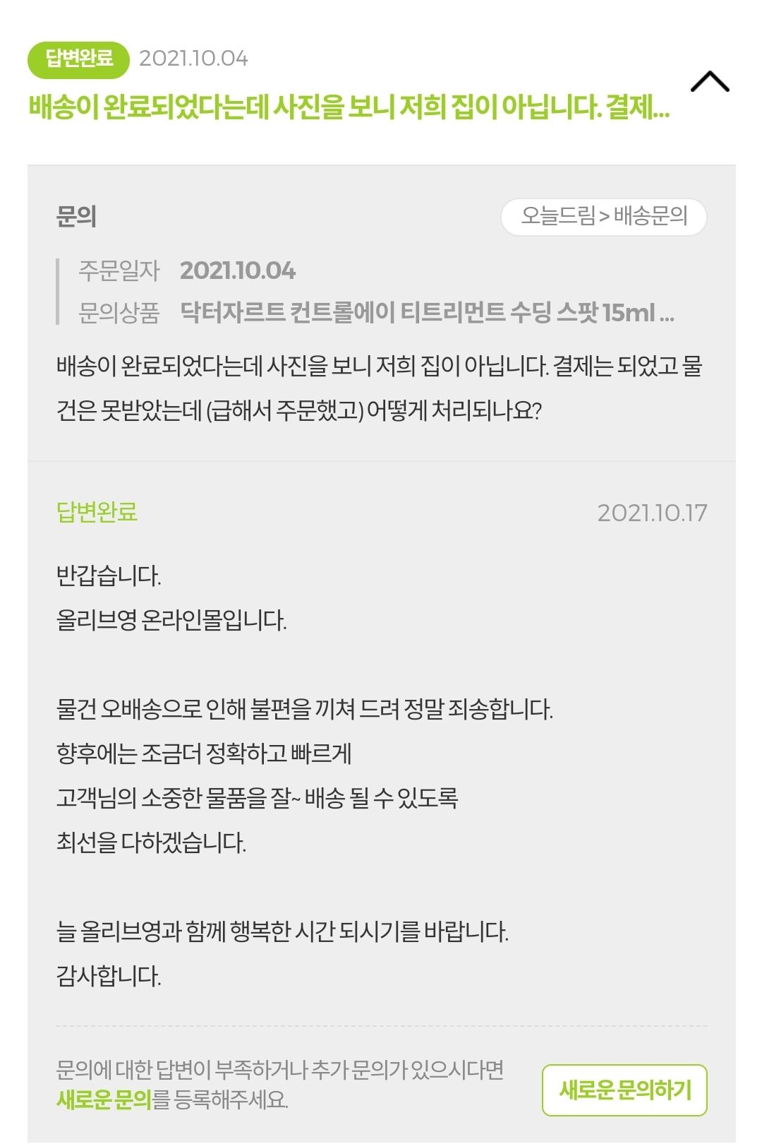 그런데 반전이 있다. 내가 쓴 글 둘 다 한~~~ 참이 지나서야 댓글이 달렸다. 오늘드림 서비스가 무색하게 오배송 문의글에 대한 댓글이 13일 후에 달리다니... 아마 일단 물건을 받은 건이라 이렇게 처리했을 거라 좋게 생각해본다.
