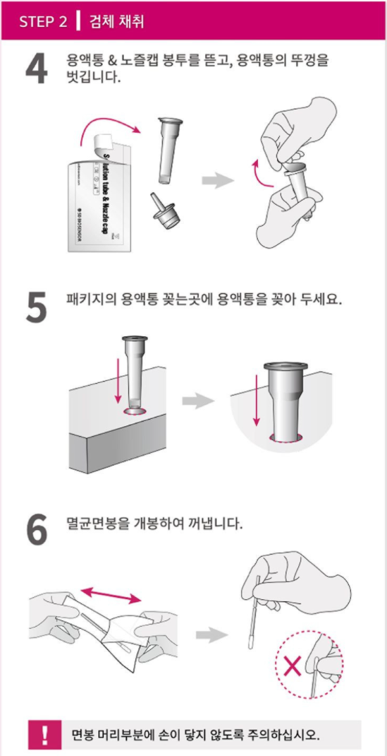 4. 구성품 : 검사용 디바이스, 용액통&노즐캡, 멸균 면봉, 아주 긴 설명서