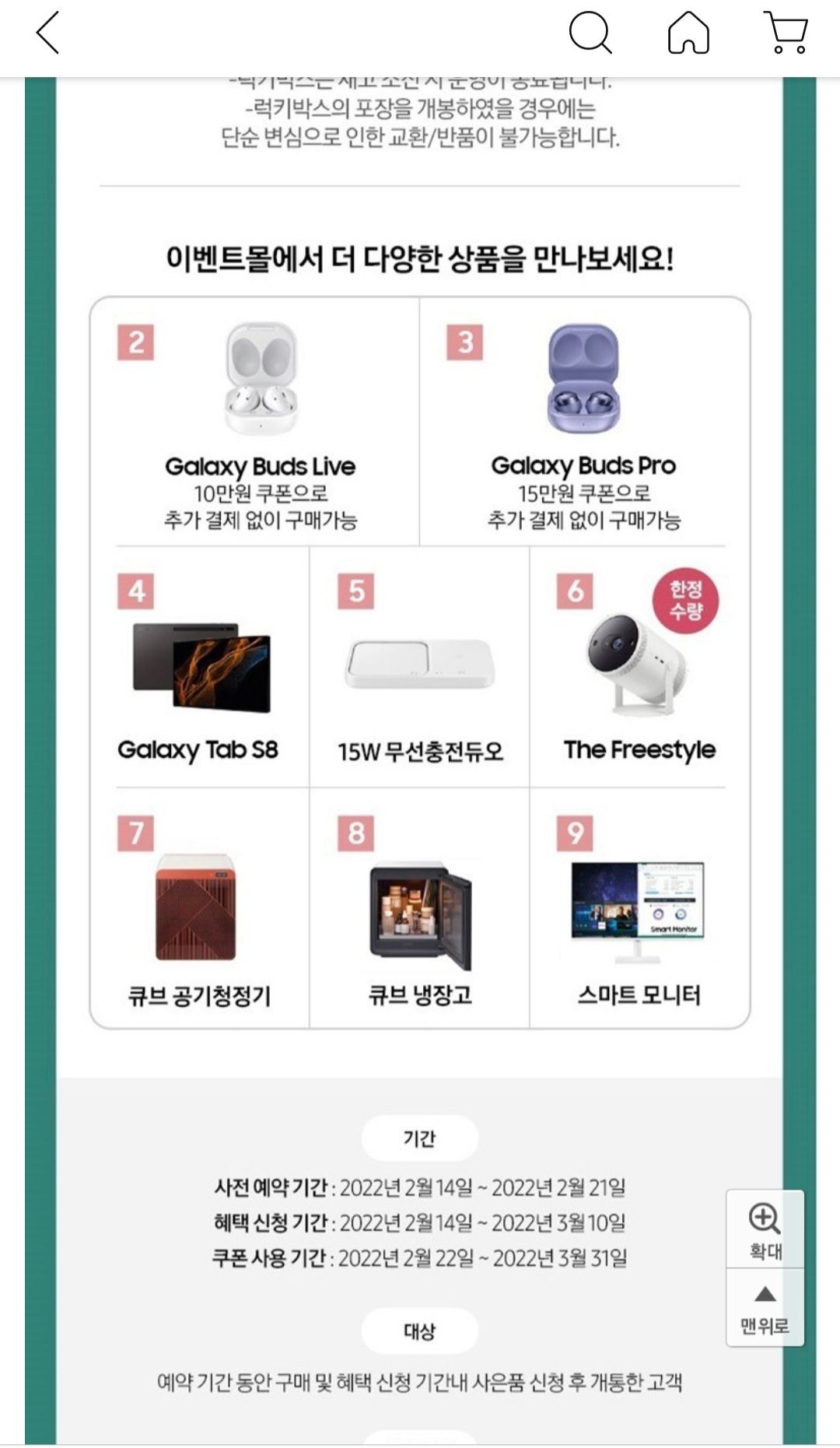 1) 삼성 이벤트 몰에서 이용 가능한 쿠폰 제공 (S22 울트라는 15만원)