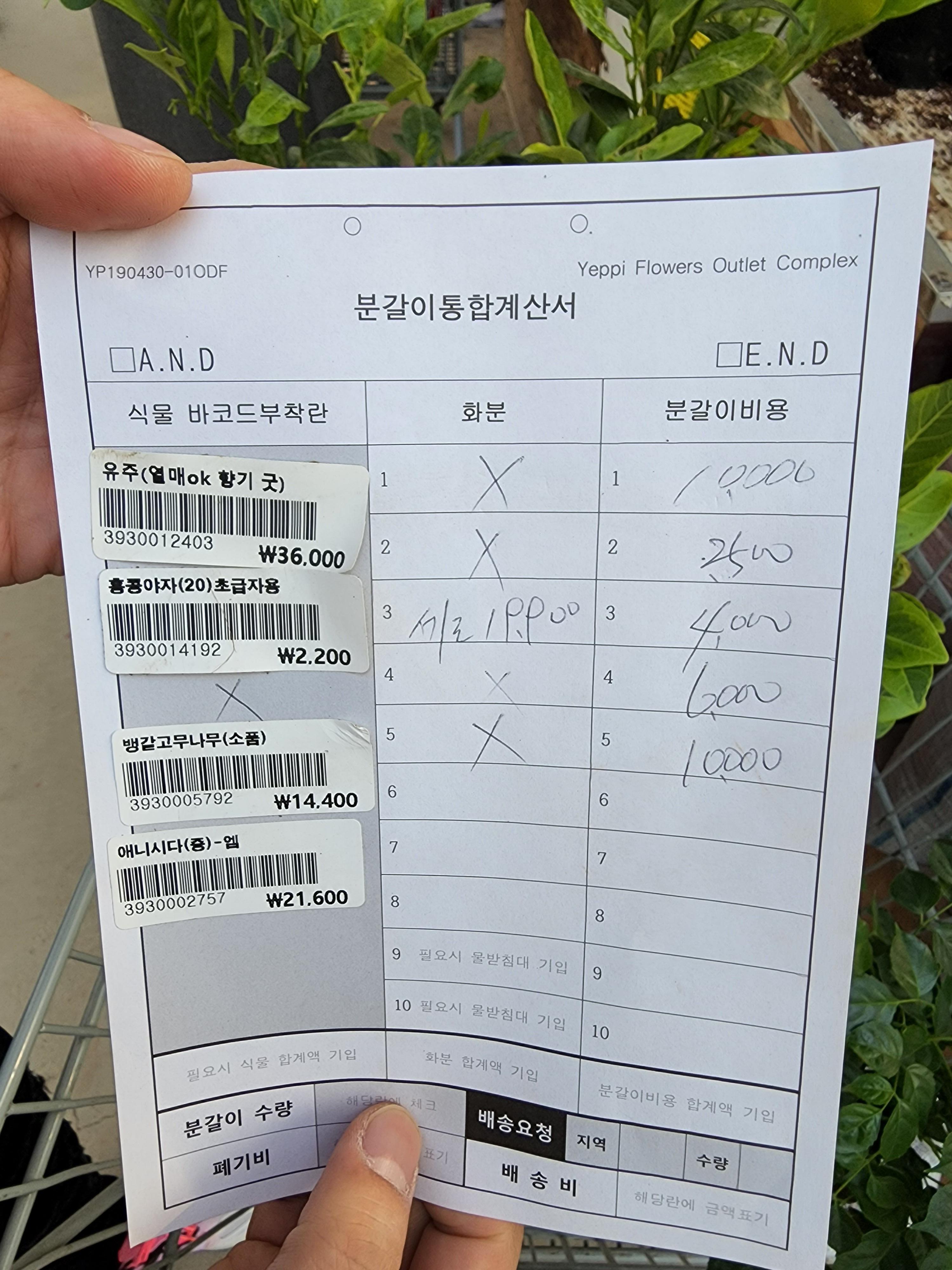 지난번에 분갈이 영상 자세히 보여드려서 이번에는 계산서만 보여드린다. 분갈이는 식물/화분 크기에 따라 달라지는데 이번에 다 엄청 큰 식물들만 해서;; 비용이 꽤 나왔다. 그래도 분갈이는 하는 게 훨씬 이득이다. 정말 잘해주신다.