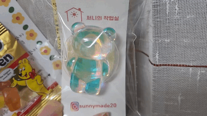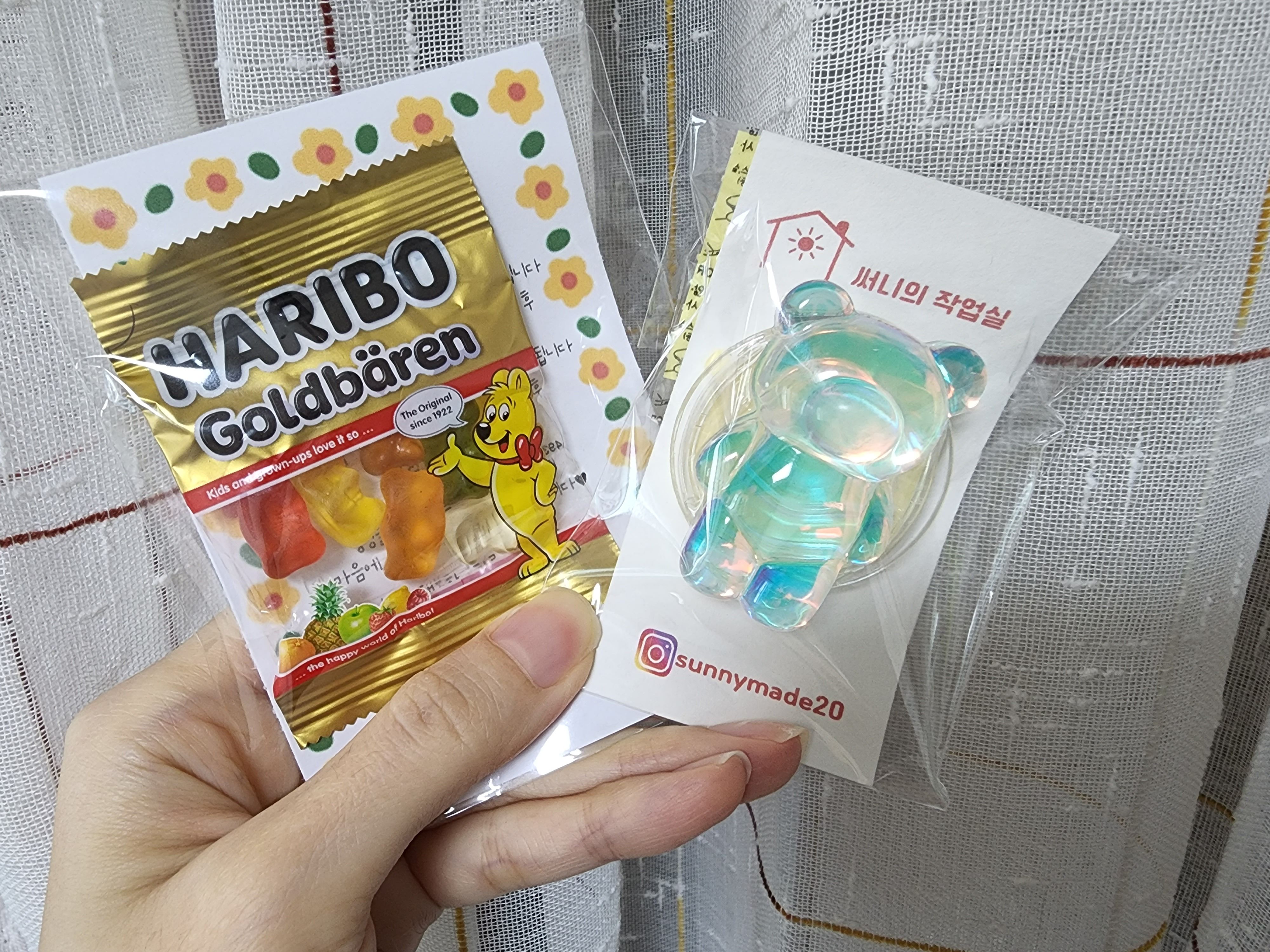 구매 후 5~12일 정도 소요된다고 안내받았는데 빨리는 아니지만 적당히 예상했던 때쯤 그립톡이 도착했다. 두근두근! 하리보 젤리와 함께 온 나의 오로라 곰돌이 그립톡 (미니곰돌이, 블루)💙