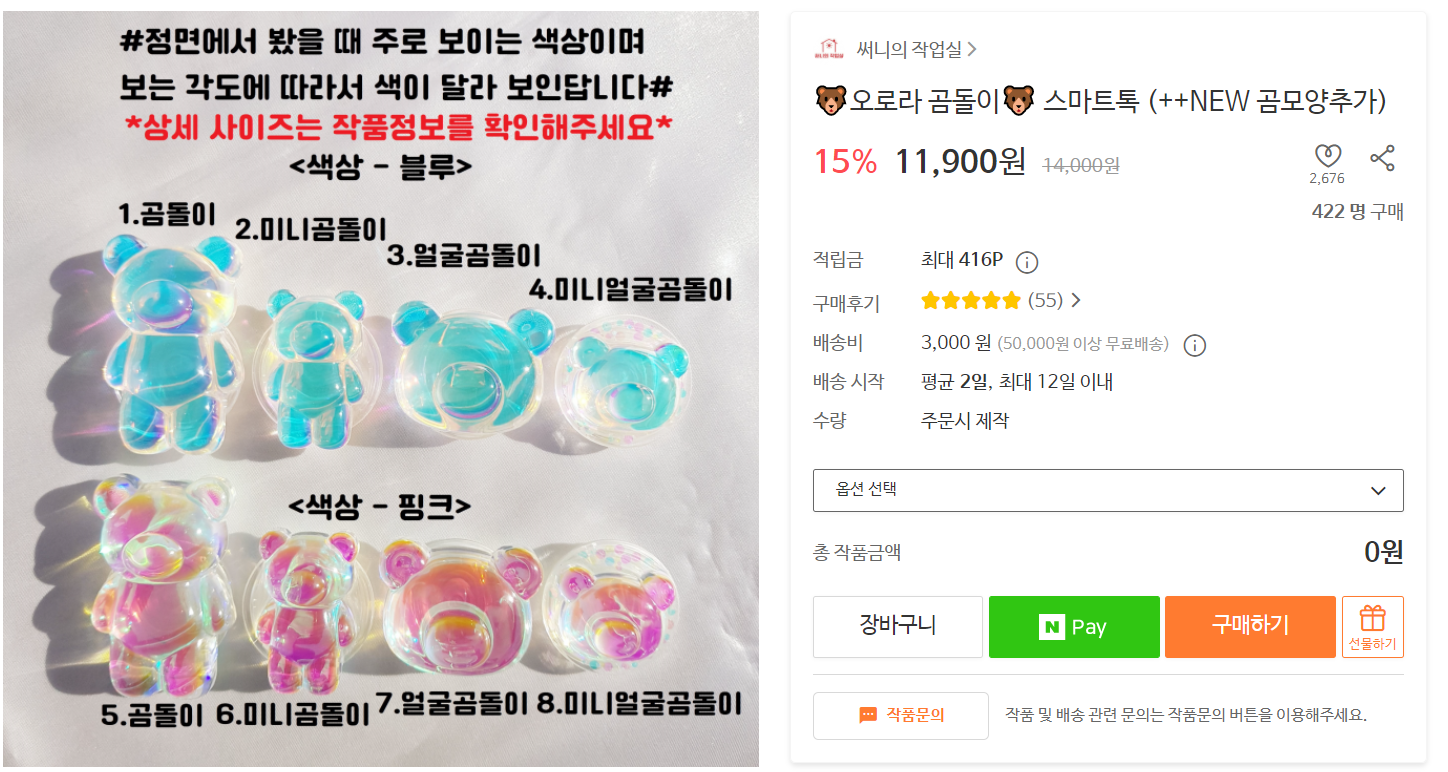 문제는 이제 어디서 구매하느냐였다. 유행하는 아이템답게 다양한 판매처가 있는데 후기들을 찾아보니, 중국 너무 저가 제품을 사면 레진에 공기층이 많거나 값싸 보이는 느낌이 있다는 글이 많았다. 그래서 내가 종종 구매하는 아이디어스 (핸드메이드 제품이 모여있는 플랫폼)에 들어가서 찾아봤다. 아이디어스에도 곰돌이 그립톡 제품이 많았다.