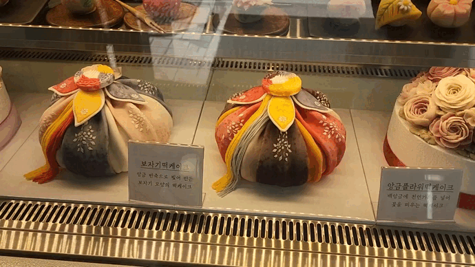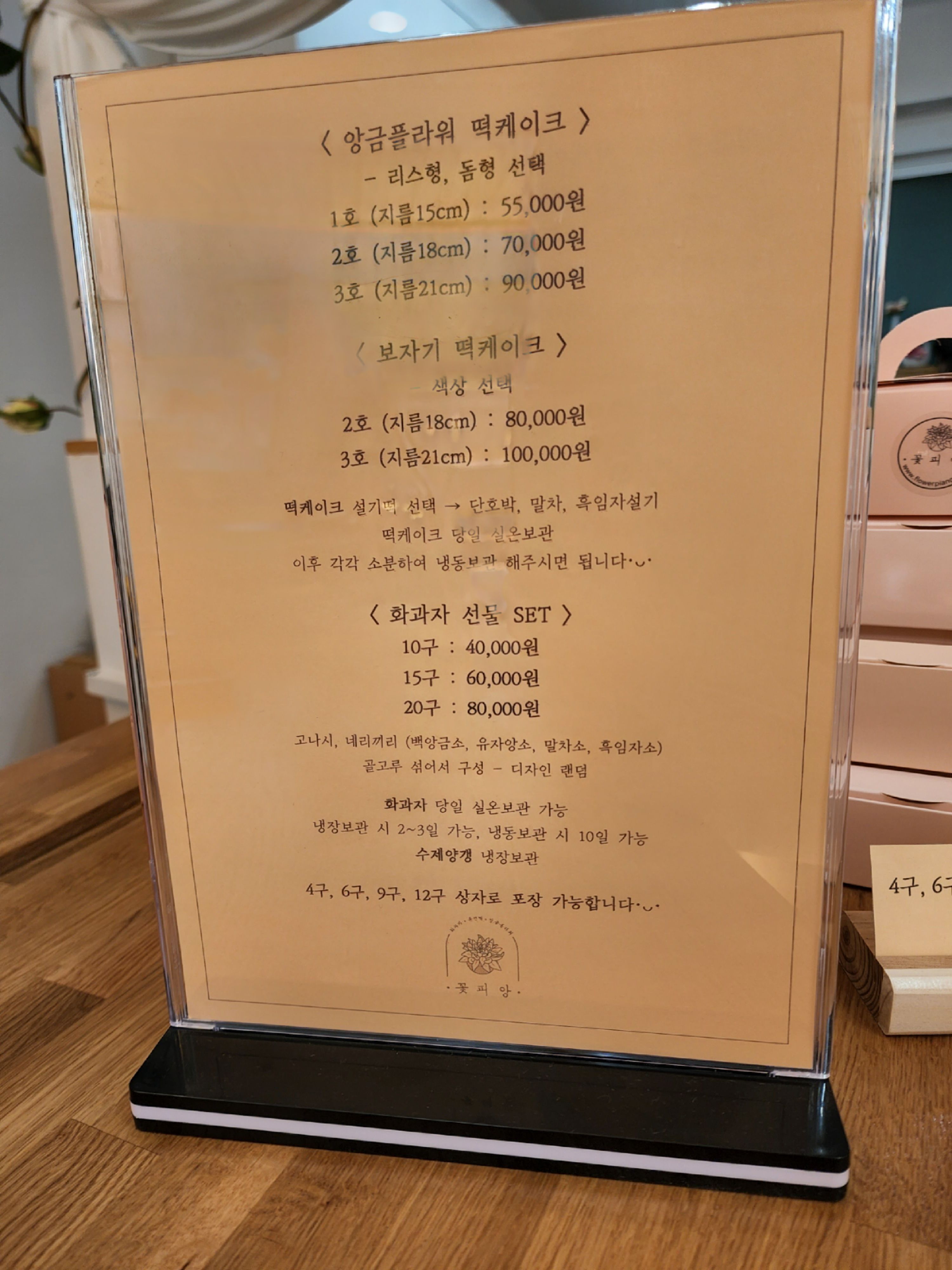 위에 소개해드린 것까지가 매장에서 구매가 가능하고, 앙금플라워 떡케이크와 보자기 떡케이크 같은 경우는 1주일 전에 미리 주문하고 픽업하면 된다고 한다. 함께 구경을 간 엄마가 이미 케이크를 보고 눈이 하트 뿅뿅🥰이셔서 매장에서 가격과 주문 방법에 대해 확인하고 사진도 찍어왔다.