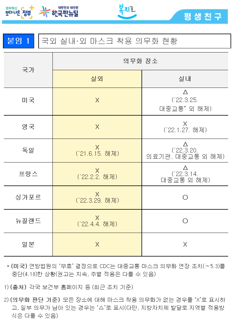 질병관리청에서 공유한 국가(미국, 영국, 독일, 프랑스, 싱가포르, 뉴질랜드, 일본)는 실외 마스크 착용 의무가 해제되었다. 하지만 실내는 아직 유지하고 있는 곳들이 많다.