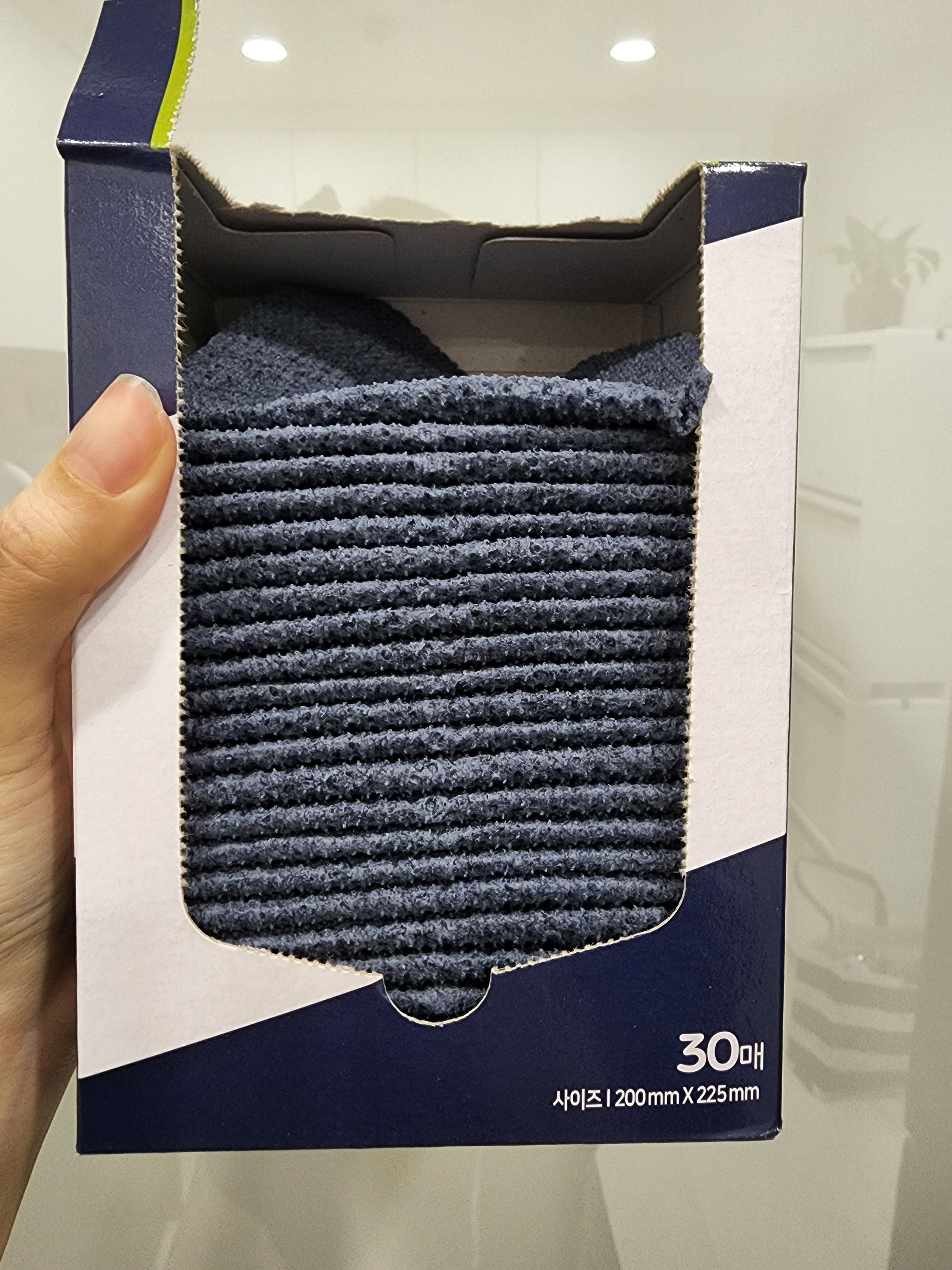 이렇게 생긴 박스를 뜯으면 이렇게 1장씩 접혀있는 형태다. 이런 거 말고 롤로 된 일회용수세미도 있는데 개인의 취향과 가성비를 따져서 본인의 취향인 걸 구매하면 될 것 같다.