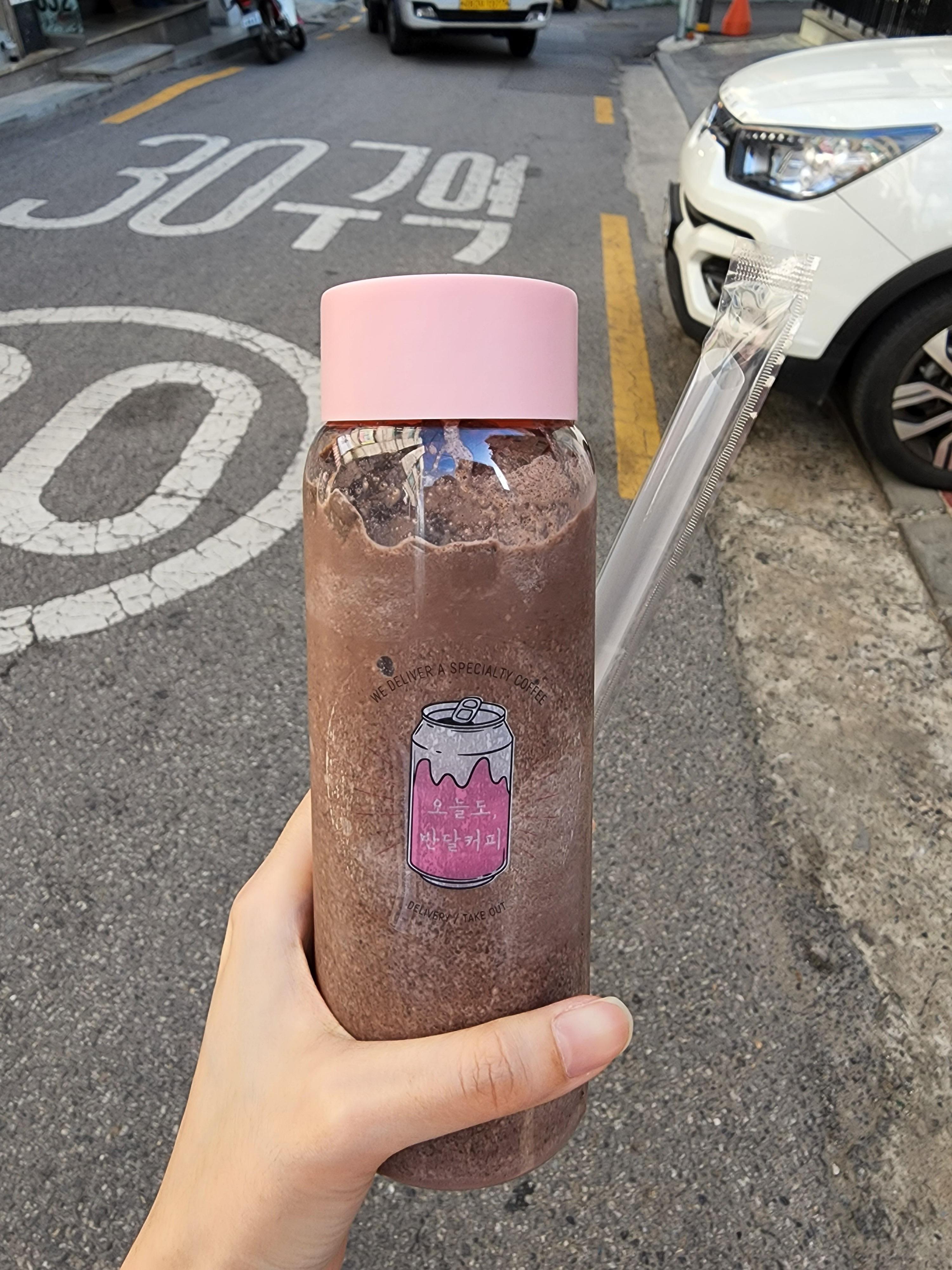 자두크러쉬와 쿠앤크스무디 중 고민하다가 당이 떨어져서 누가 봐도 달달해보이는 "쿠앤크스무디(5,500원)"를 주문했다. 재활용 가능한 병에 안전하게 담아주시니 받으면서부터 기분이 좋았다. 가격이 저렴한 건 아니지만 양이나 용기까지 생각했을 땐 괜찮은 가격이라 생각되었다.