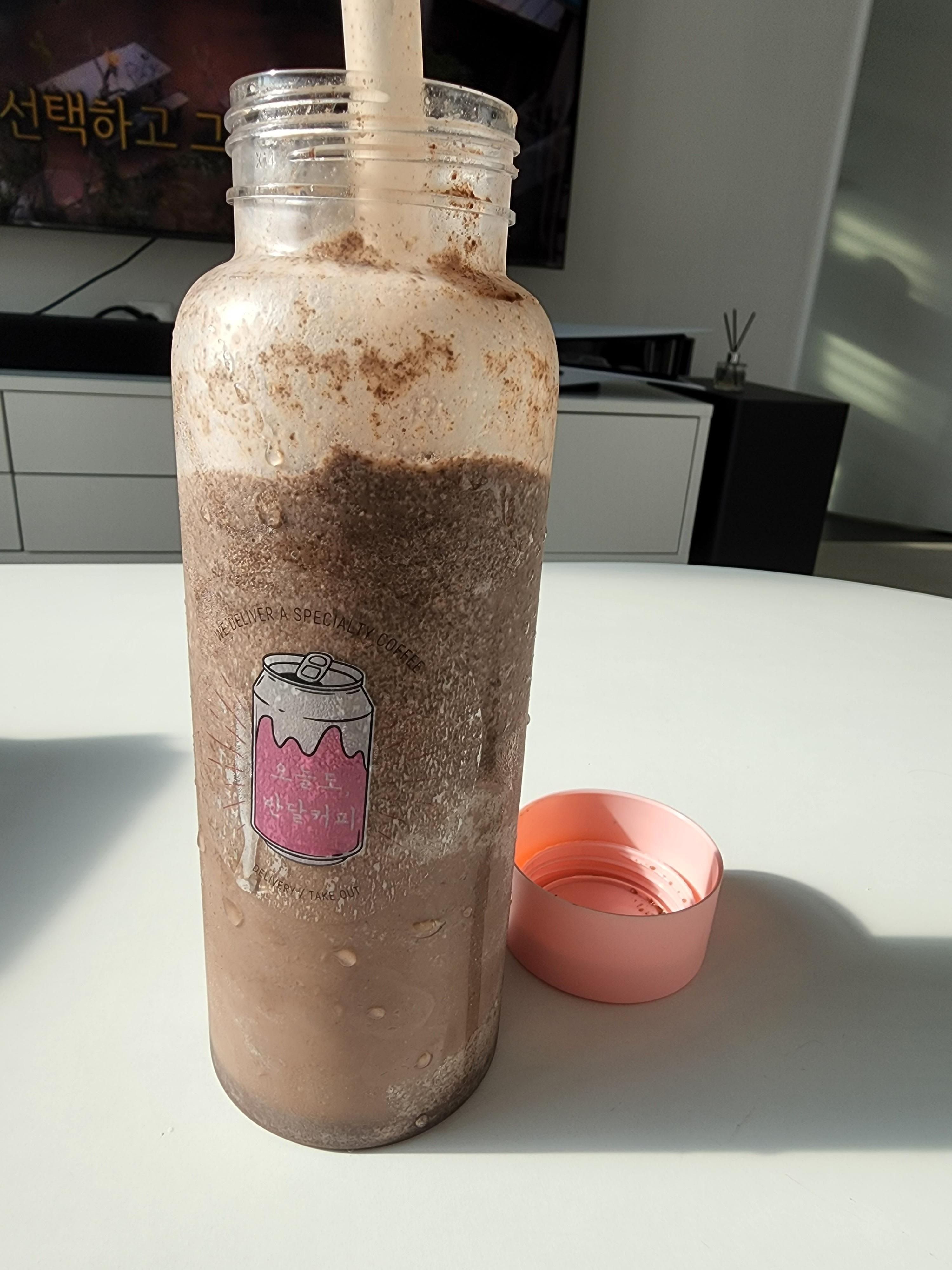 가장 위쪽에는 매장 이미지처럼 초콜릿이 딱 보였다. 넓은 빨대로 먹기 때문에 중간중간 초코렛이 올라오는데 맛있었다.