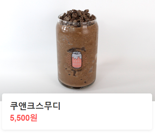 - 스무디 : 요거트스무디, 요거트 망고스무디, 수제 블루베리 요거트스무디, 자두크러쉬, 복숭아 크러쉬 등