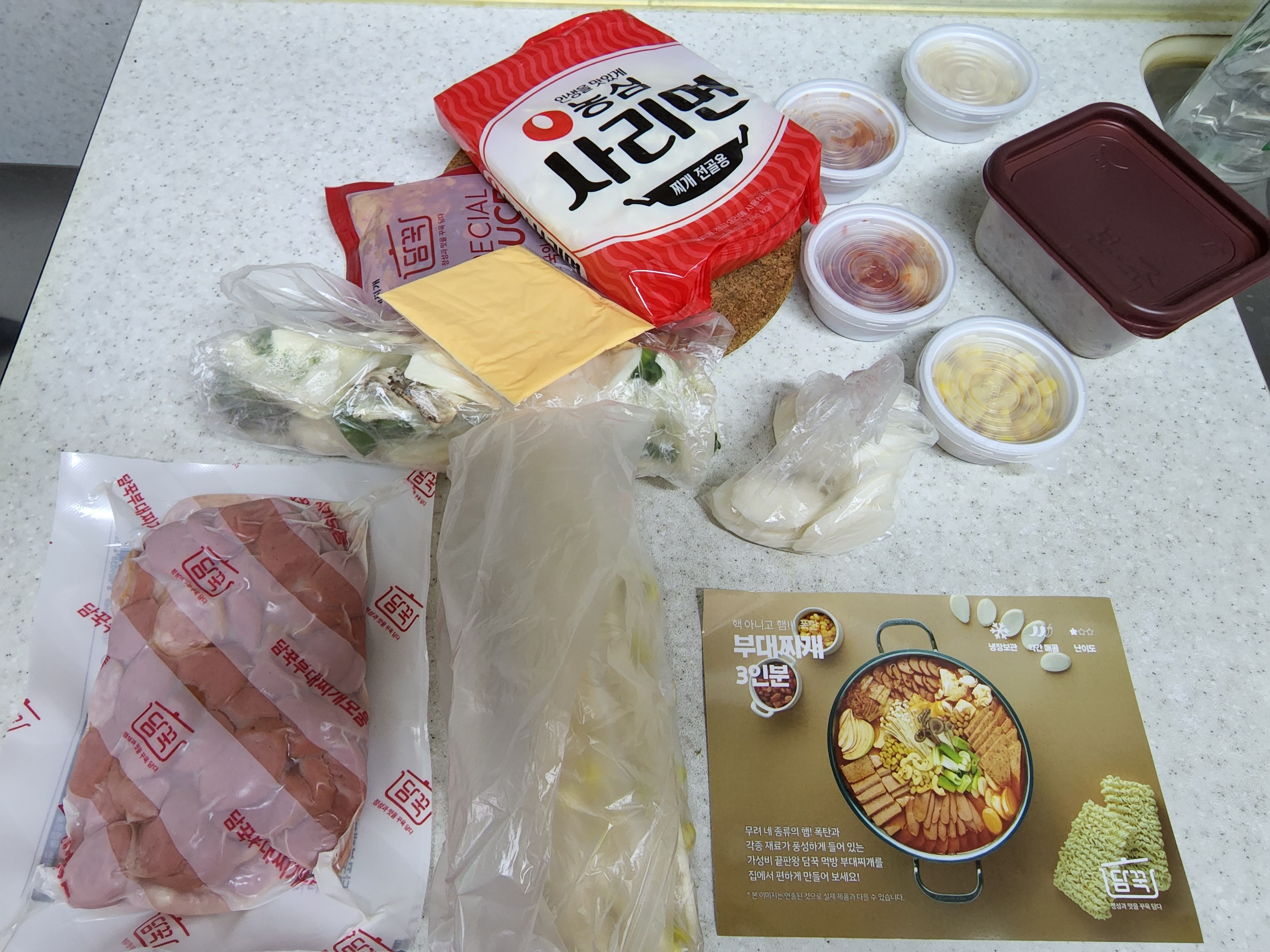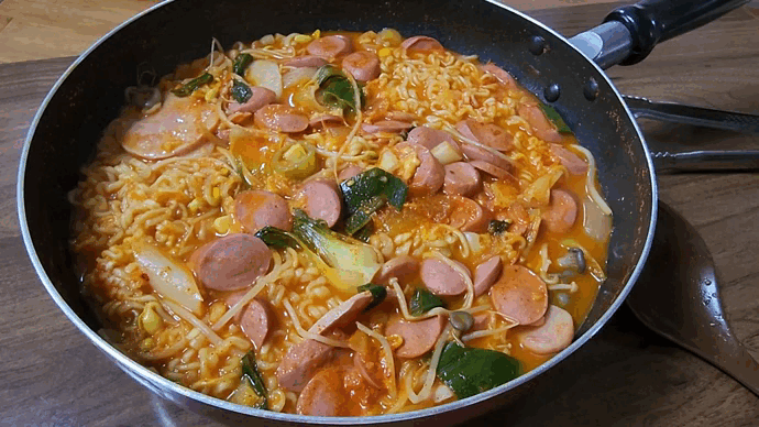 - 재료 : 부대찌개 팩(소시지 및 햄류), 떡꾹떡, 양배추, 양파, 청양고추, 대파, 팽이버섯, 김치, 베이크드빈, 옥수수콘, 마카로니, 콩나물, 부대찌개소스, 체다치즈, 사리면