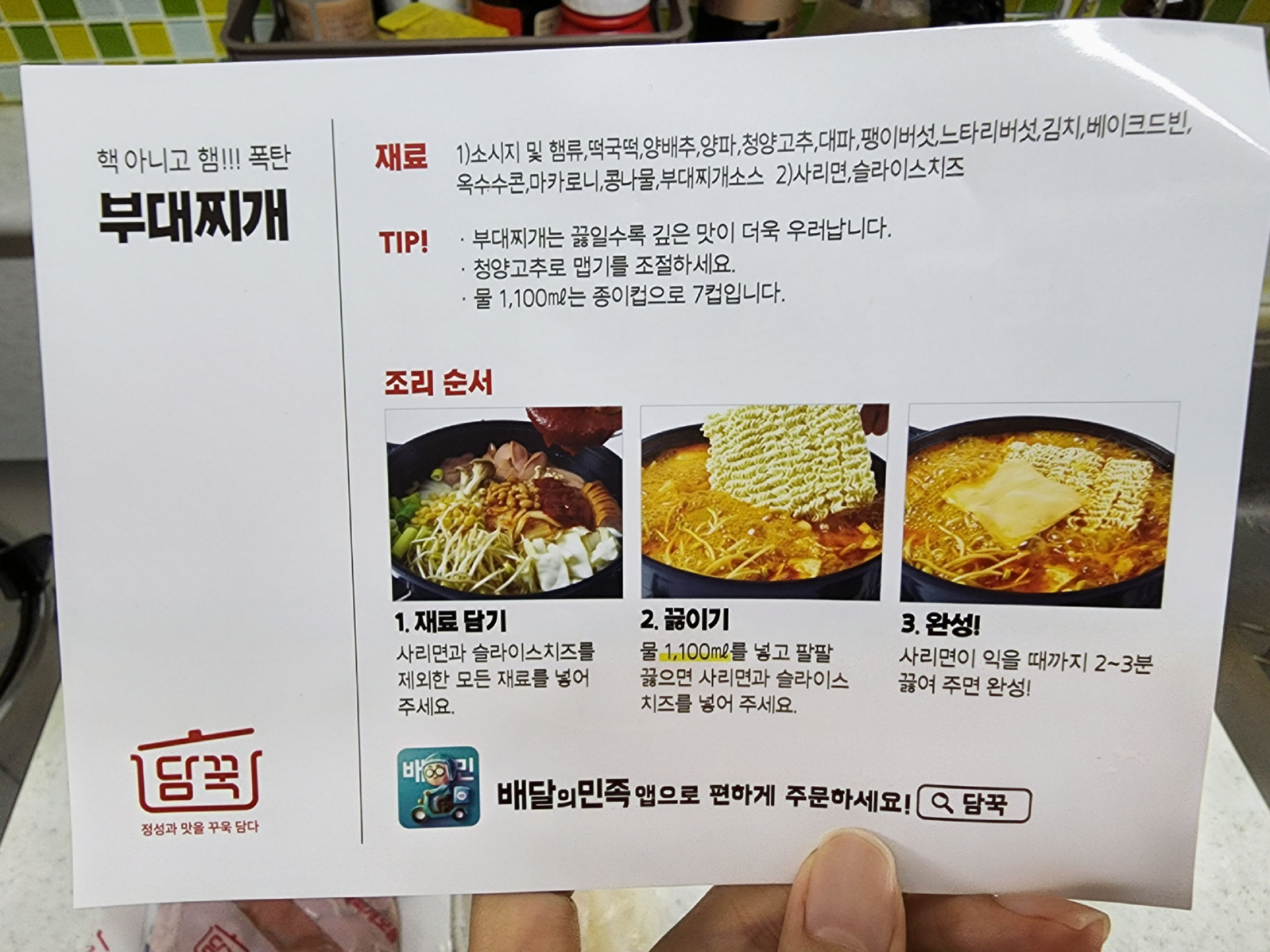 근데 정작 담꾹에서 제일 유명하고 평이 좋은 "부대찌개"를 아직 안 먹어봐서 이번에 시도해보기로 했다. (찾아보면, 부대찌개, 안동찜닭, 제육볶음 이런 것들이 인기가 좋은 것 같다😁)