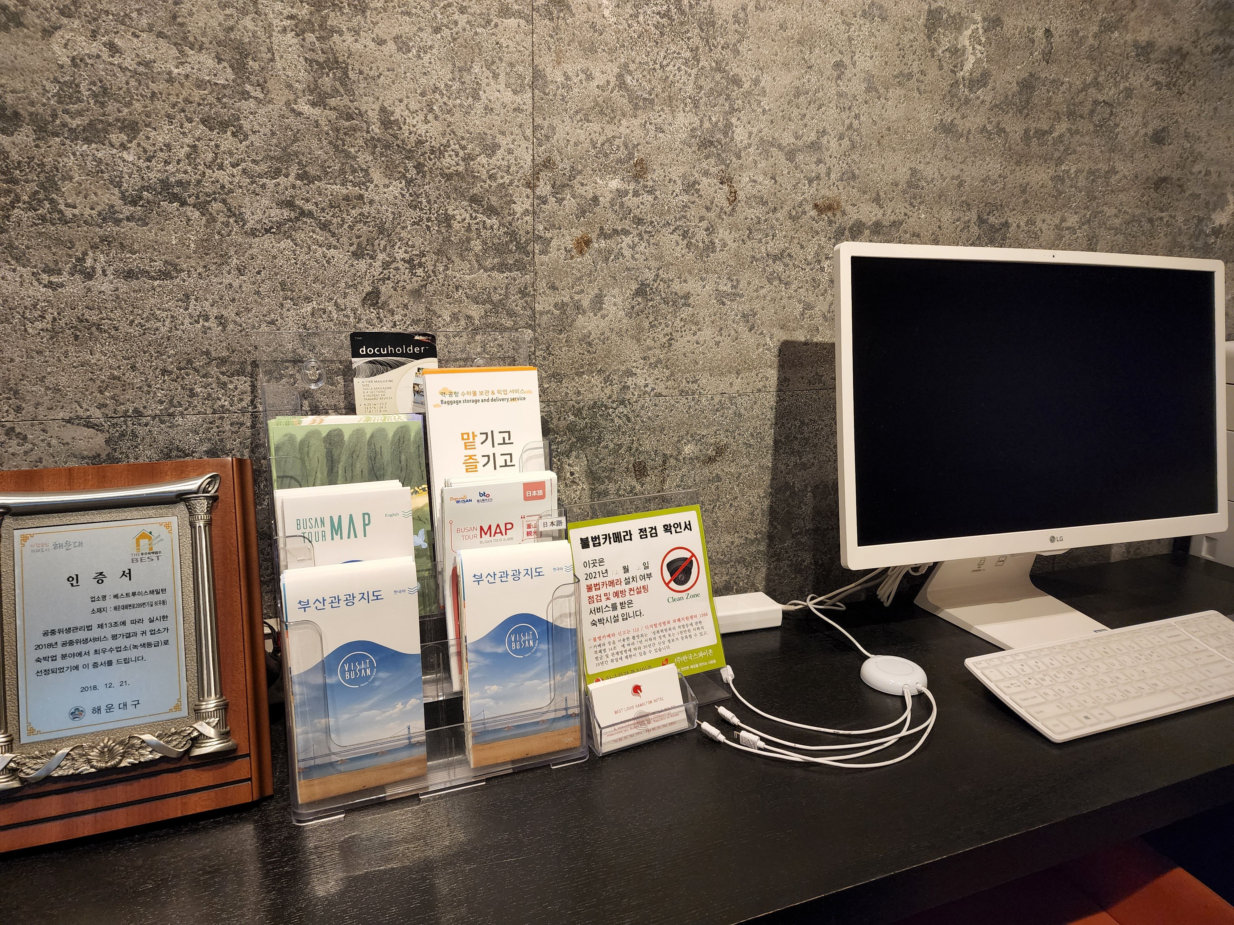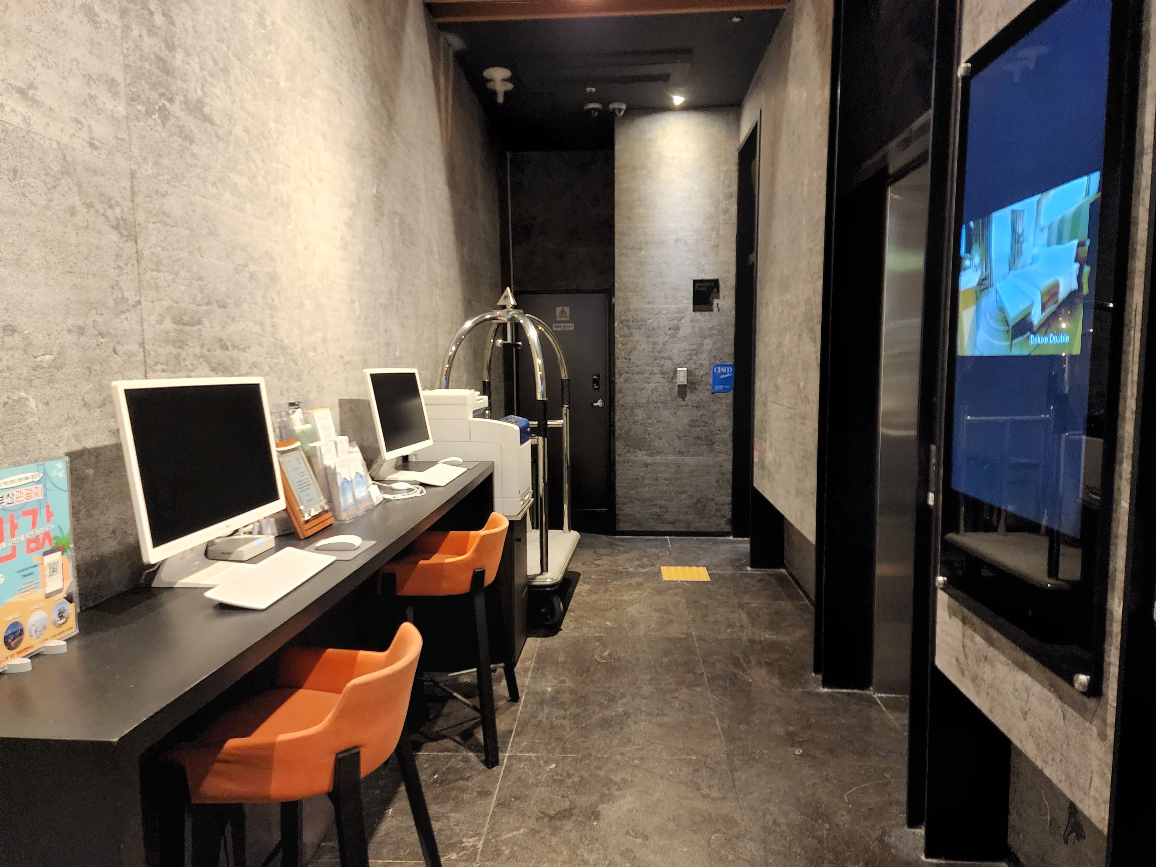 해당 호텔은 전반적으로 어두운 느낌이 드는데 로비도 마찬가지이다. 전반적으로는 깔끔하고 메이크업룸도 마련되어있고, 엘리베이터 앞에는 사용할 수 있는 컴퓨터, 프린터기 등도 마련되어있다. 관광지에 위치한 호텔답게 관광 안내 팸플릿도 쉽게 확인할 수 있다.