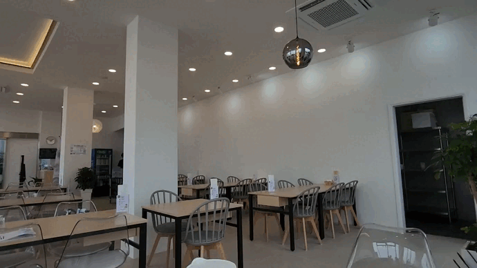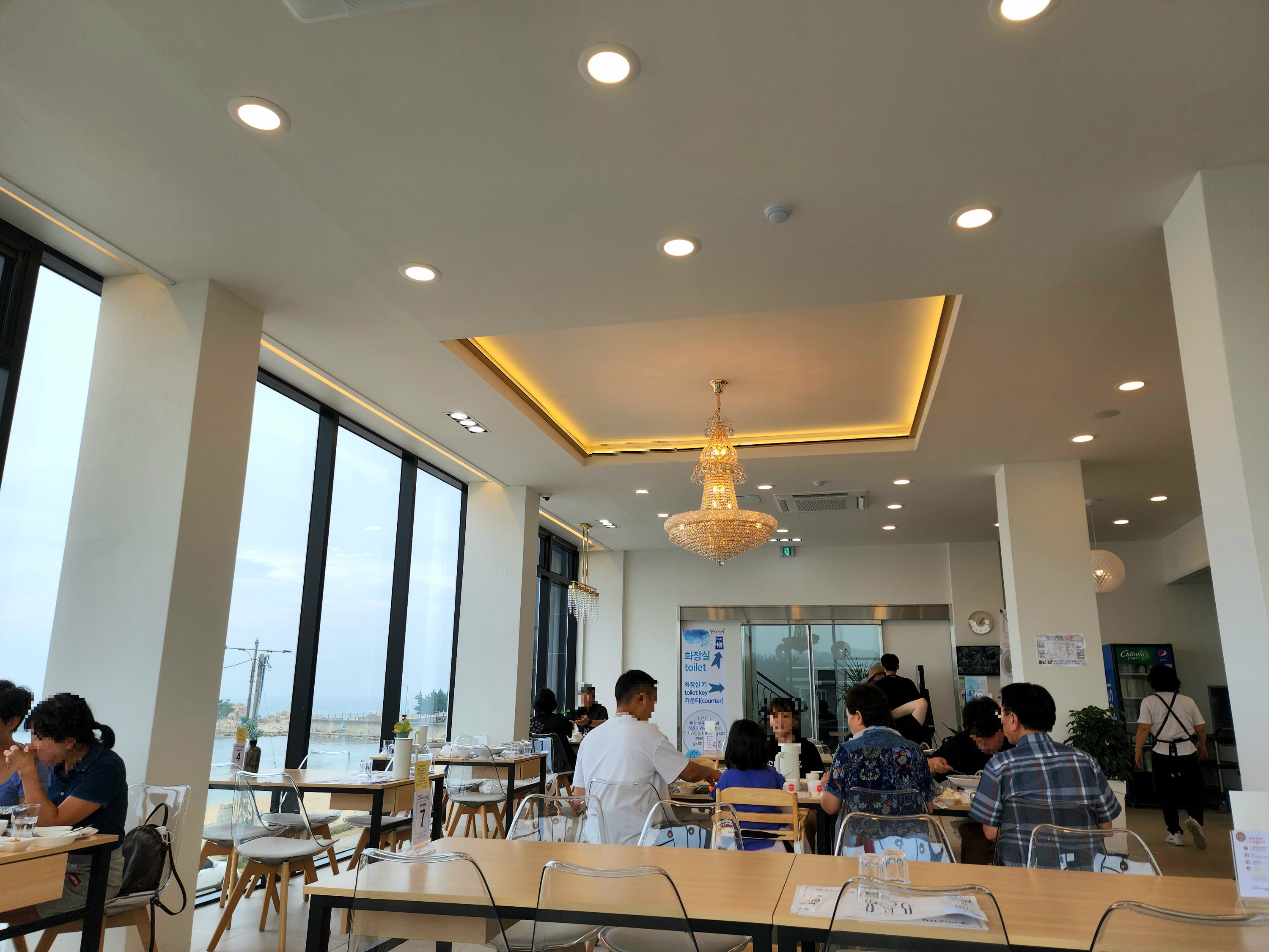 빠르게 식당으로 올라가 봤다. 오~~😍 식당이 큰 건 아니지만 진짜 깔끔했다. 층고가 높고, 하얀색 인테리어, 통유리에 샹들리에까지 전체적으로 시원한 느낌이었다. 식사 시간이 지난 평일이었는데도 사람이 어느 정도 있어서 인기 많은 식당이란 걸 알 수 있었다.