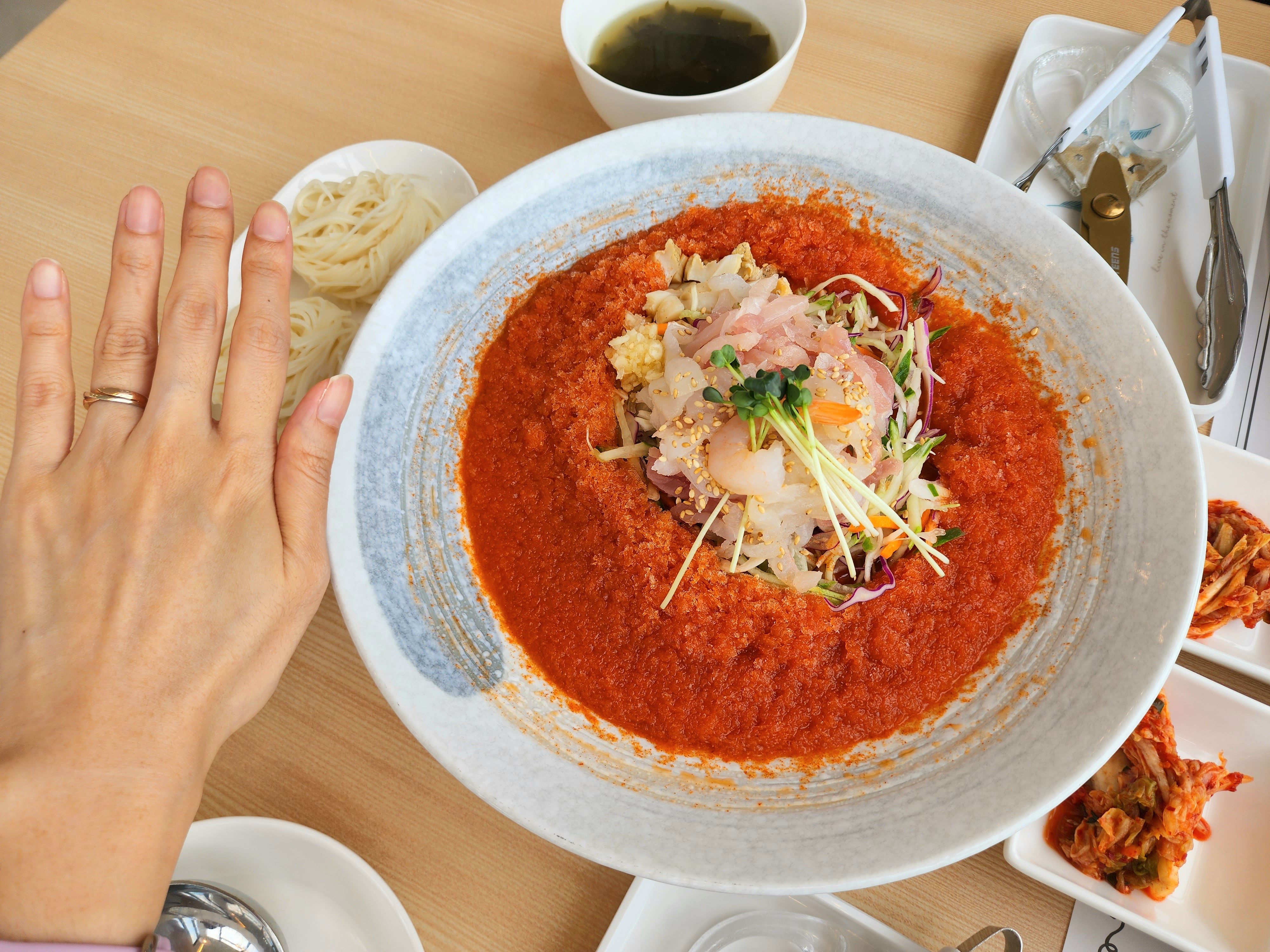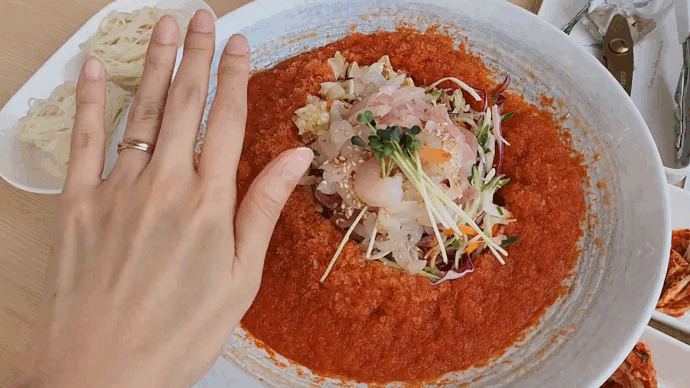 이게 사진으로만 봤을 때는 얼마나 푸짐하게 나오는지 잘 가늠이 안되실 것 같아서 손을 두고 사진을 찍어보았다. 내가 손이 작은 편이 아닌데 성인 여자 손보다 더 큰 그릇에 음식이 한가득 나온다. 다시 말해 음식이 엄청 푸짐하다👍 가격대가 있는 음식점은 맞지만 여러 가지를 고려하면 그~렇게까진 비싼 집은 아닌 것이다😁
