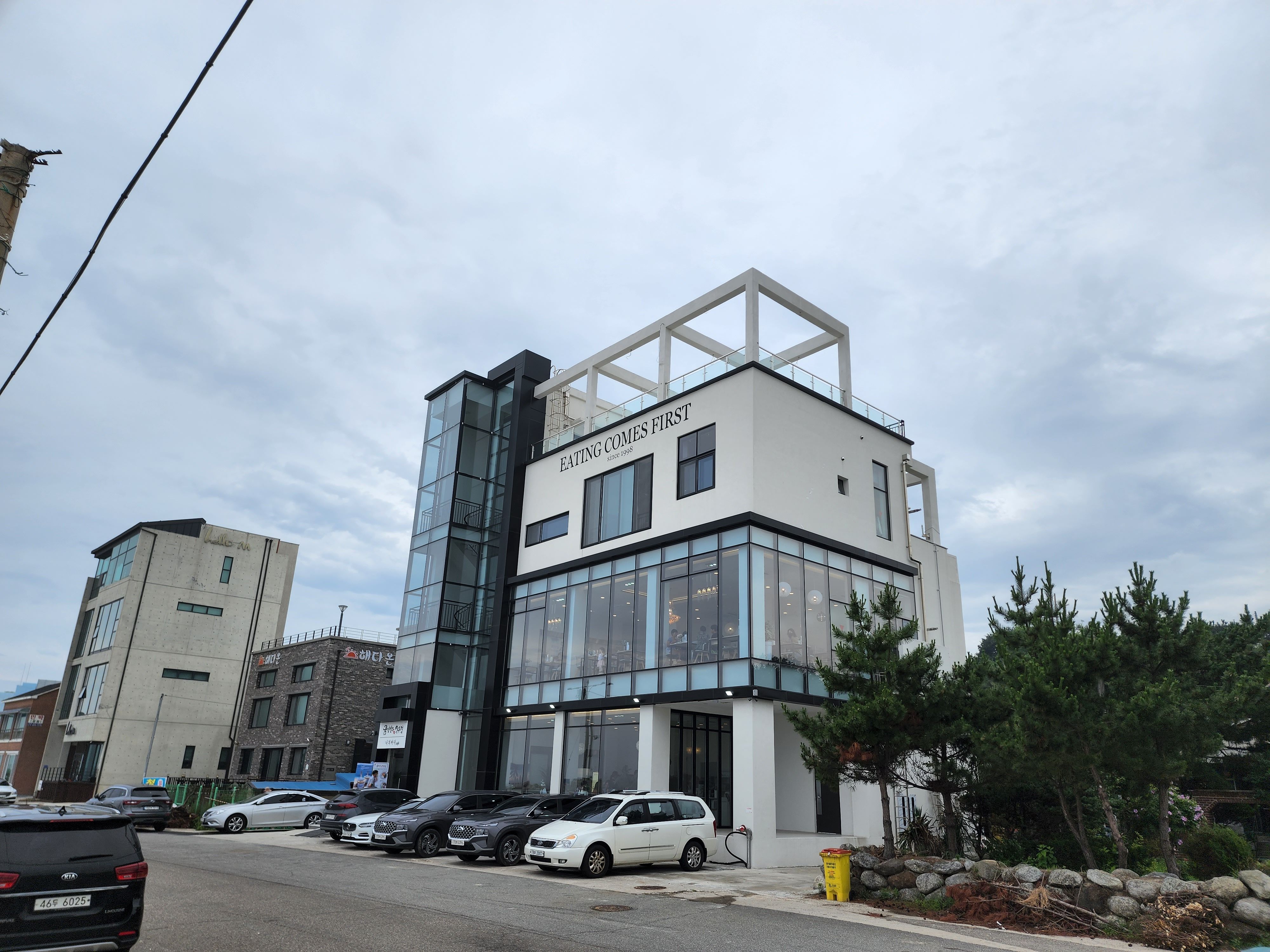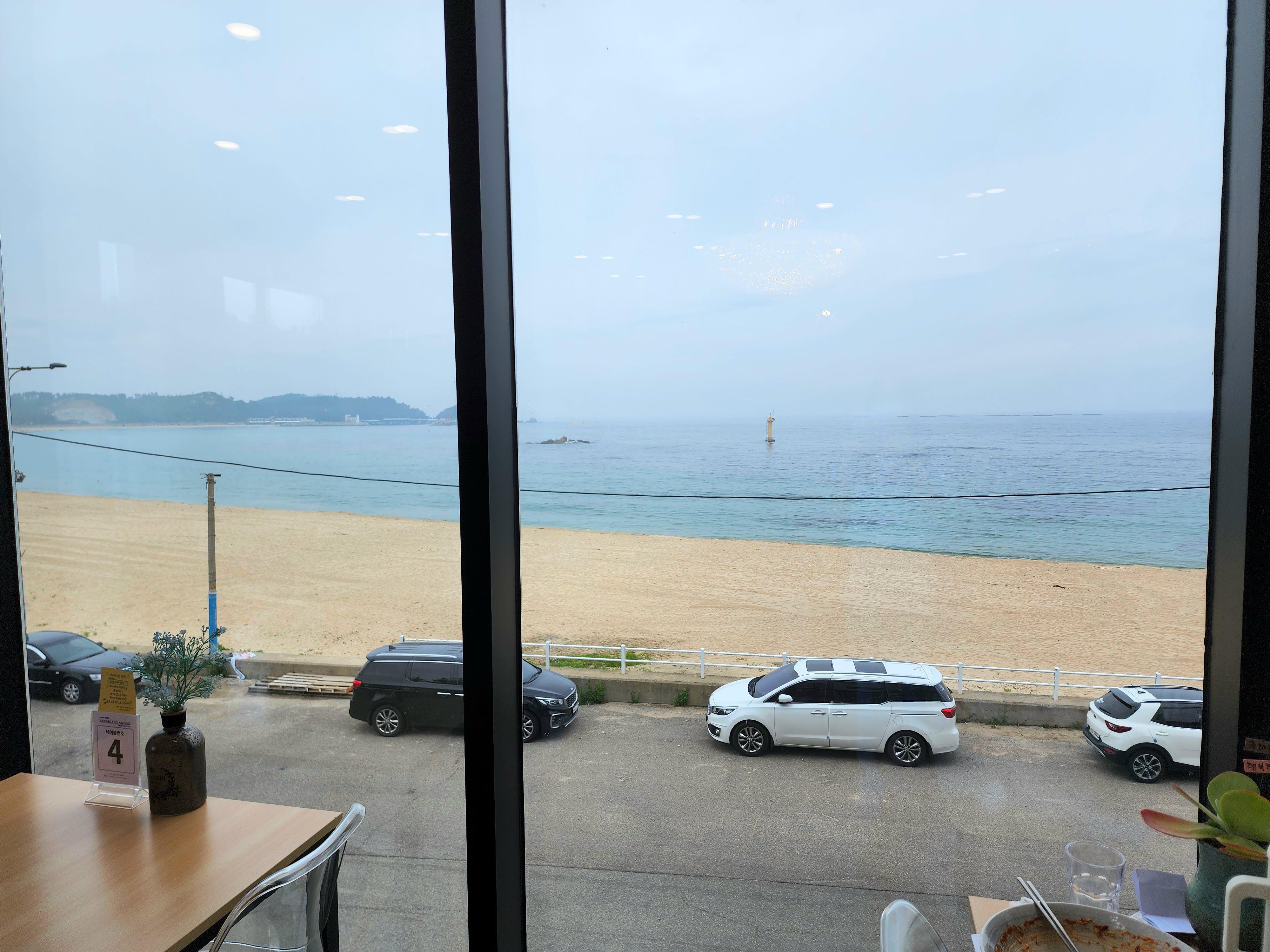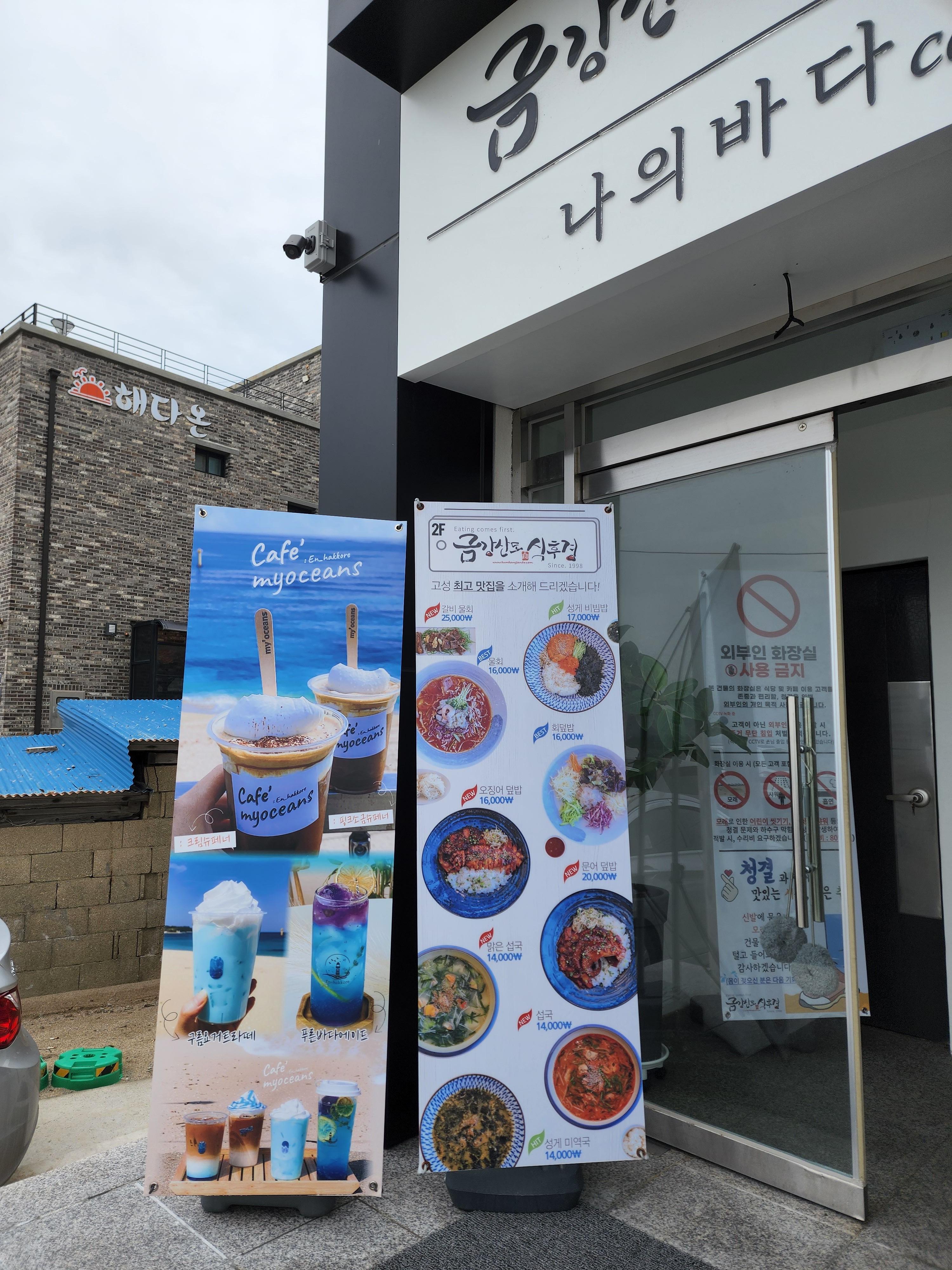 고성 금강산도식후경은 진짜 딱! 바다 앞에 위치해있다. 리모델링한지 얼마 되지 않았는지 건물 자체도 완전 깔끔! 그 자체였다. 1층은 카페고, 2층이 바로 식당이다. 밖에서 봐도 통유리라 바다를 보면서 먹을 수 있겠다는 기대감🧡