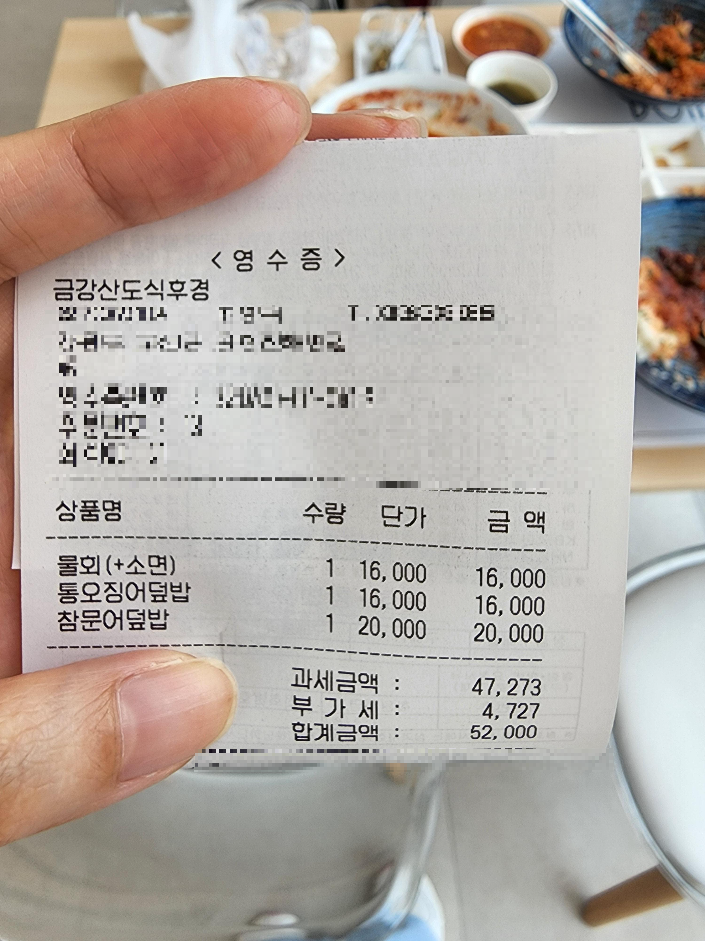 나와 친구는, 물회 / 통오징어덮밥 / 창문어덮밥 (2명이 가면 3개 정도는 시키는 게 맞...죠?🤣)을 시켰다. 처음에는 뷰도 있고 맛집이다 보니 음식이 가격대가 좀 있구나... 그렇게 생각했다. 관광지이기도 하고😝