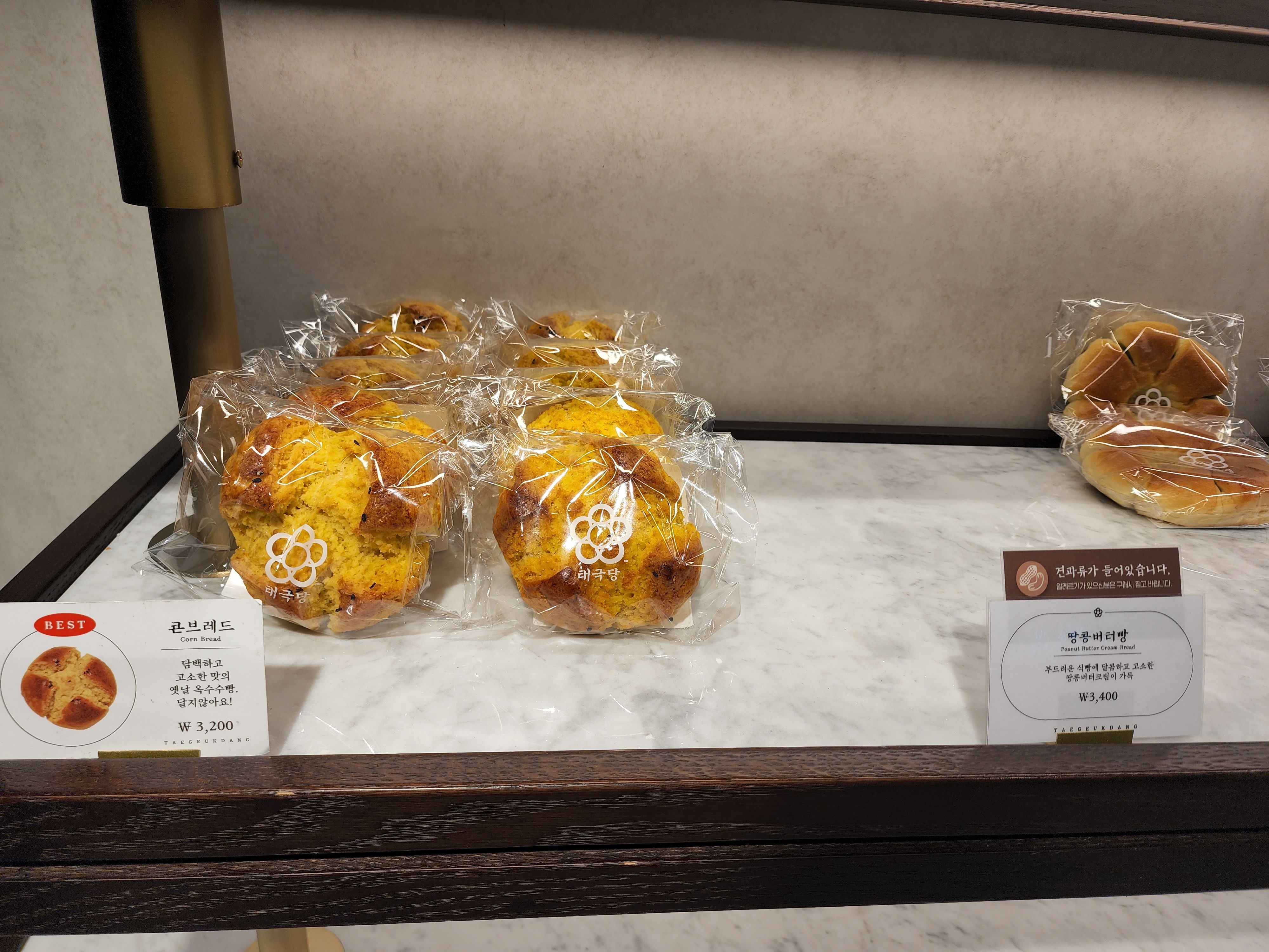 그다음으로 고민했던 베스트 메뉴 콘브레드(3,200원)! 담백하고 고소한 맛의 옛날 옥수수빵이고 달지 않다고 한다. 이것도 살까 고민했는데 나는 이왕이면 엄마와 함께 먹을 빵을 알아보고 있던 거라 (엄마는 적당히 단 빵을 좋아한다) 이 아이도 패쓰! 오히려 그 옆에 있는 2개 남아있는 땅콩버터빵이 엄마 취향에 더 맞을 것 같았다. 땅콩버터빵은 3,400원이고 부드러운 식빵에 달콤하고 고소한 땅콩버터크림이 가득 들어있다고 한다.