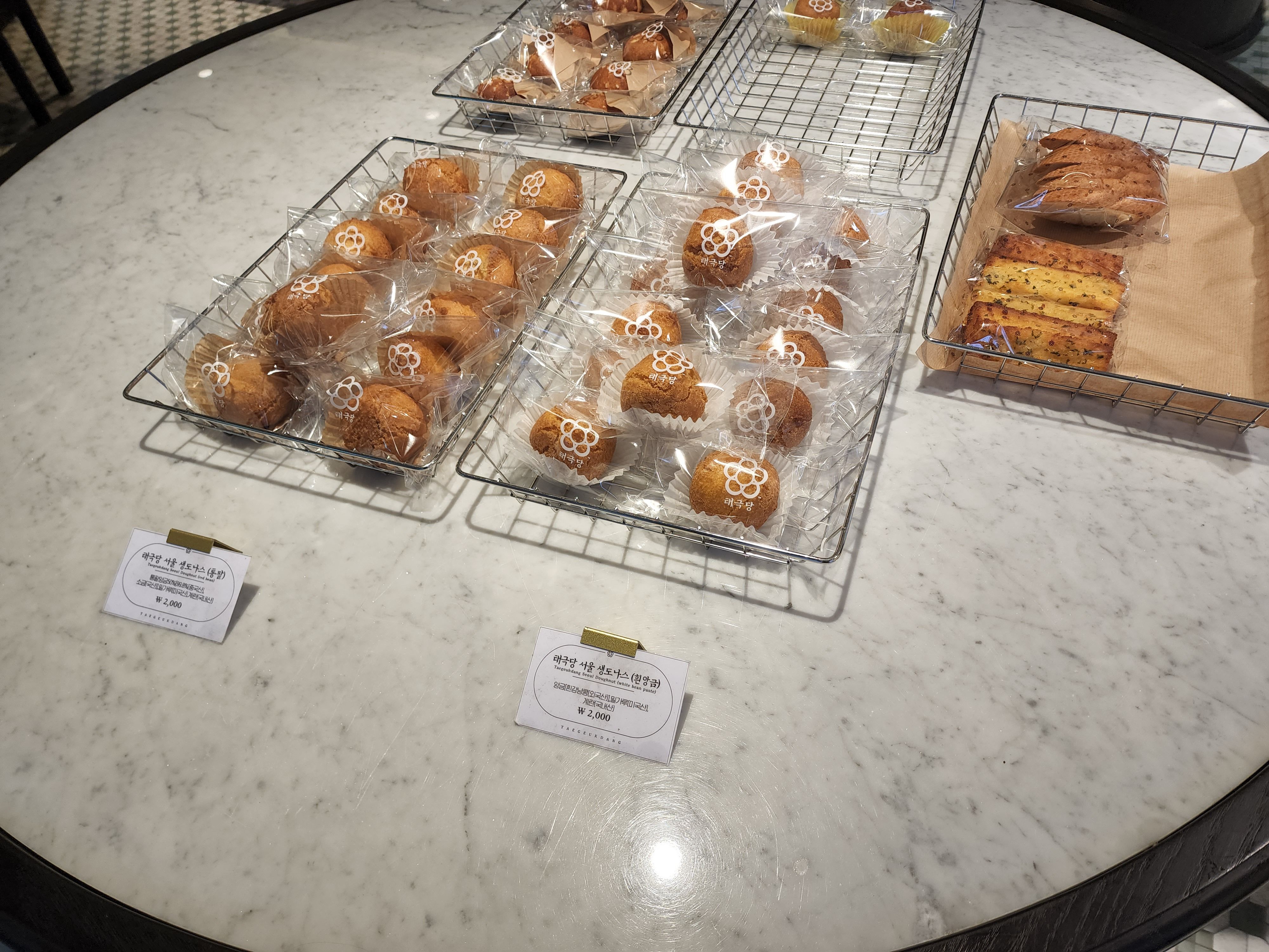 가운데 테이블에도 빵이 놓여져있었는데 여기는 생도나스가 놓여져있었다. 생도나스도 유명한데 통팥, 흰앙금, 유자 등 종류가 다양했다. 가격은 모두 2,000원.